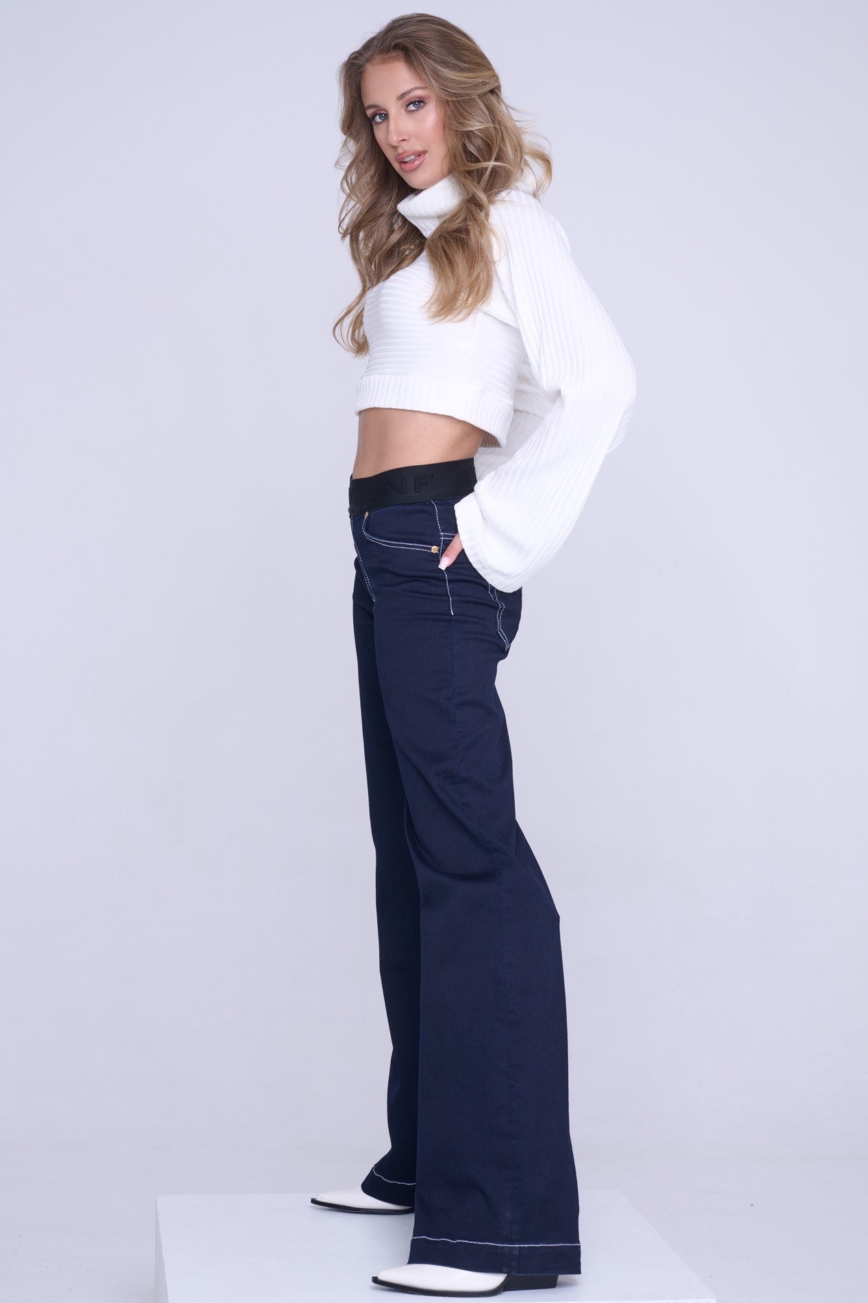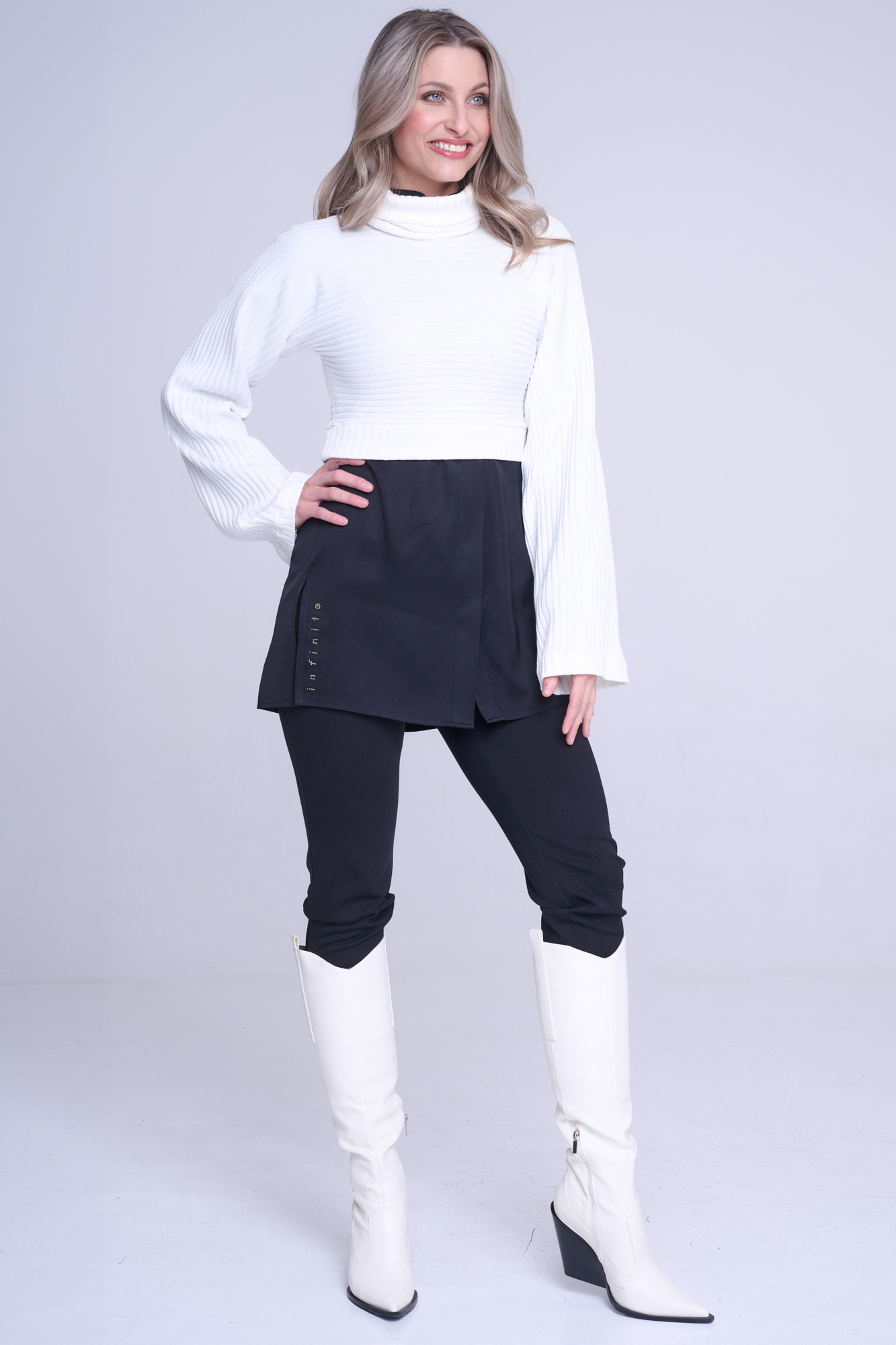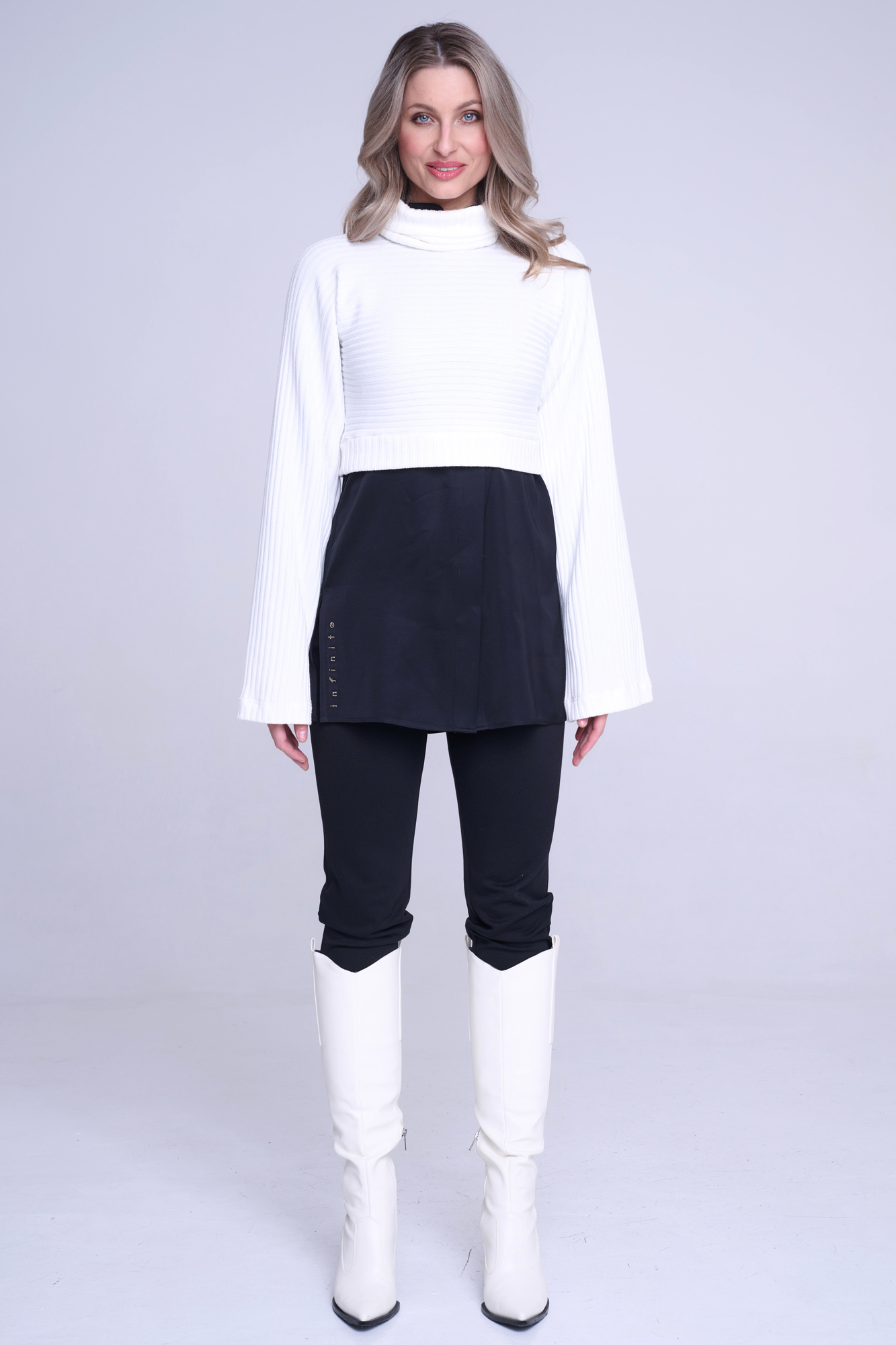 Krátký módní svetřík ze "žebra" s minimalistickým nápisem z průhledných krystalů Preciosa. Můžete ho nosit samostatně, ale můžete ho vrstvit.