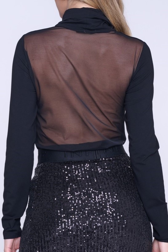 Rolák s dlouhým rukávem. Na předním díle je zlatočerný tisk INF. Zadní díl je z průhledného stečového tylu.