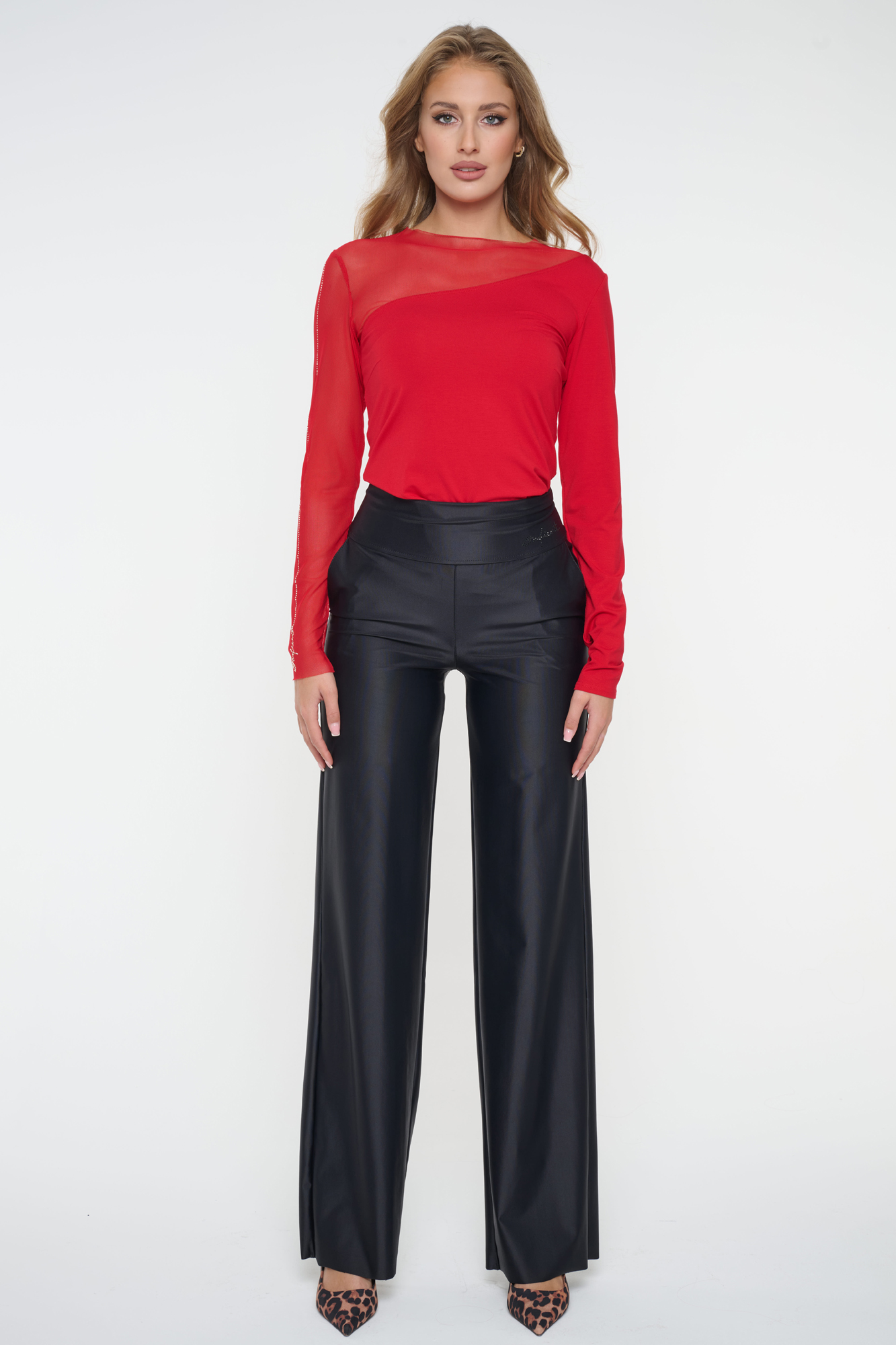 Asymetrické tričko s tylovými rukávy. Na tylovém rukávu nápis INF ze zlatých krystalů Preciosa.