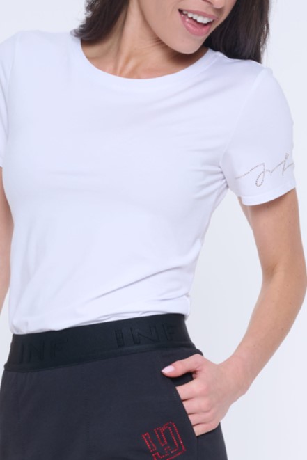 Basic tričko. Na rukávu nápis Infinite ze zlatých krystalů Preciosa.