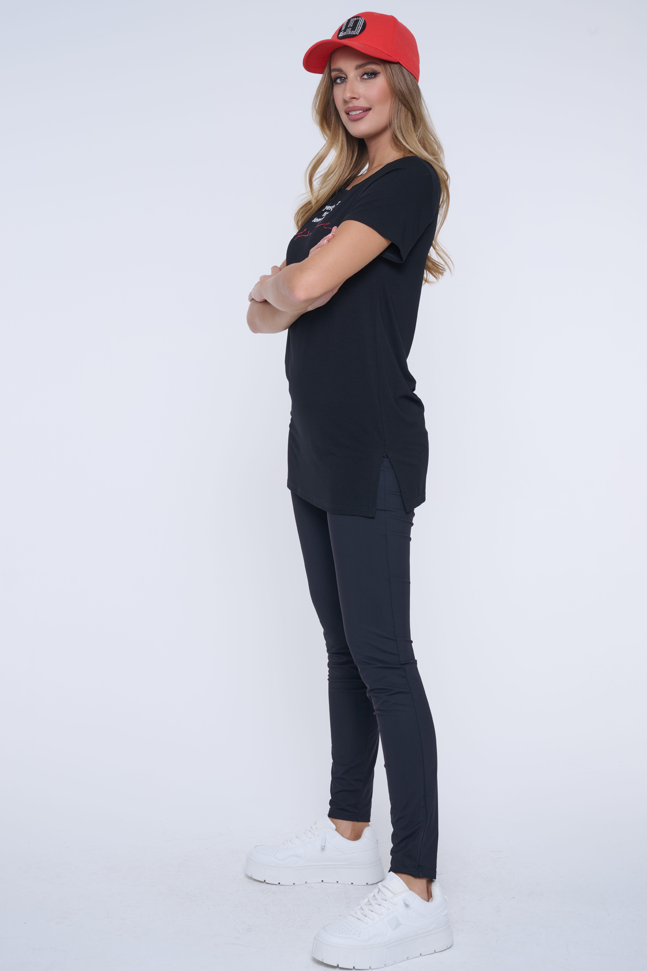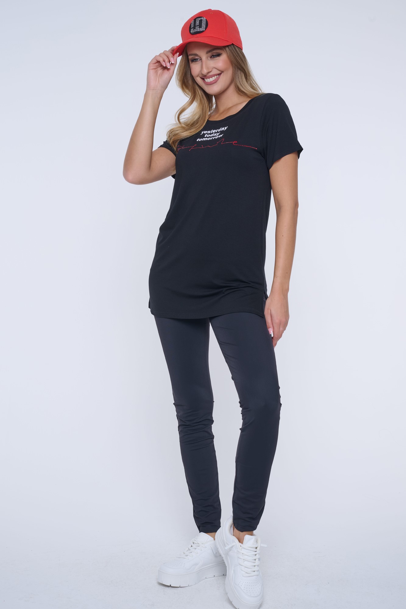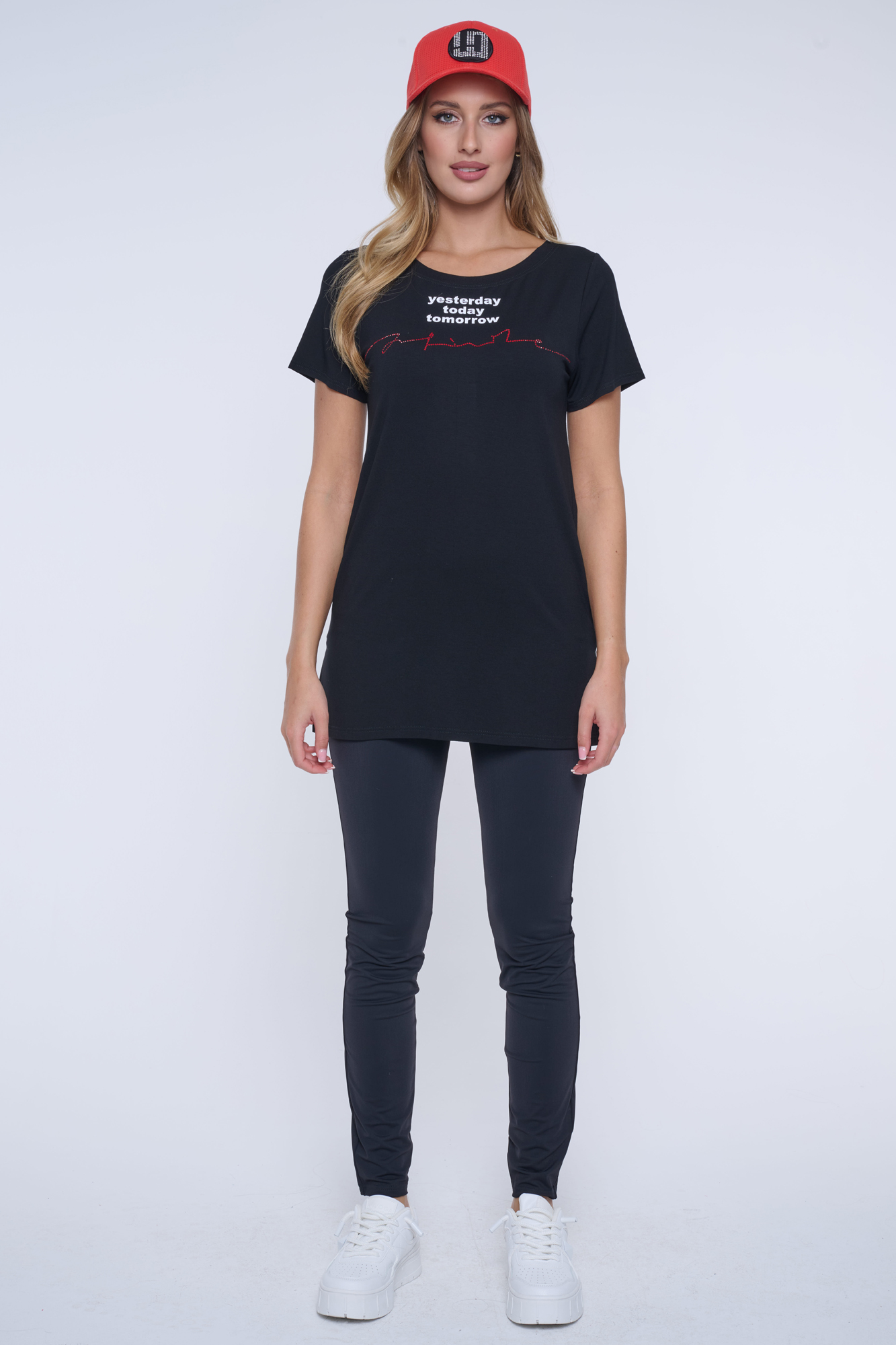 Tričko volnějšího střihu s tiskem na předním díle. Nápis Infinite z červených krystalů Preciosa.
