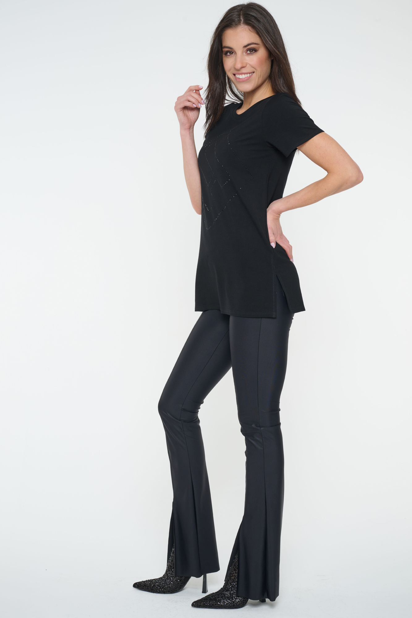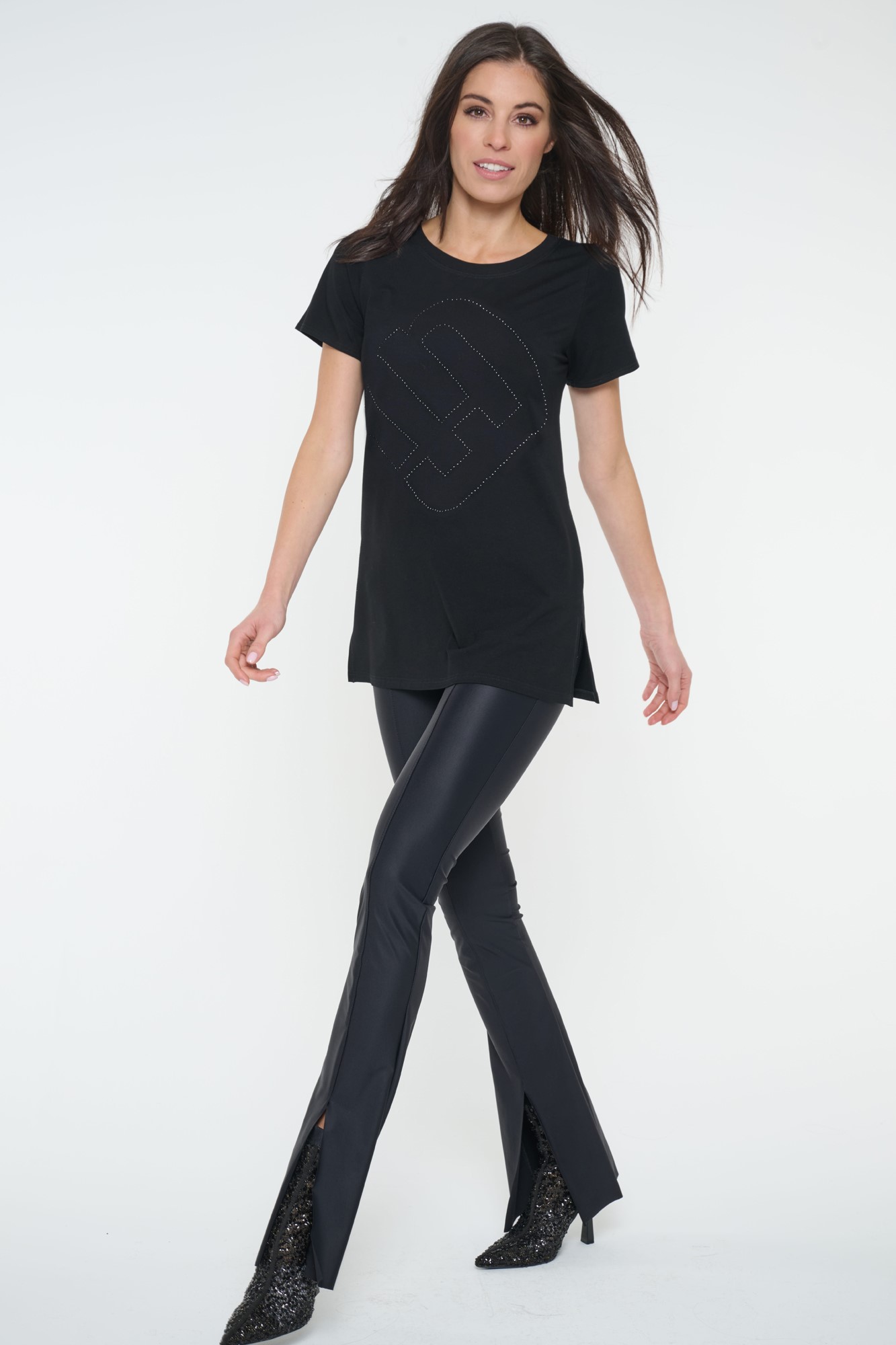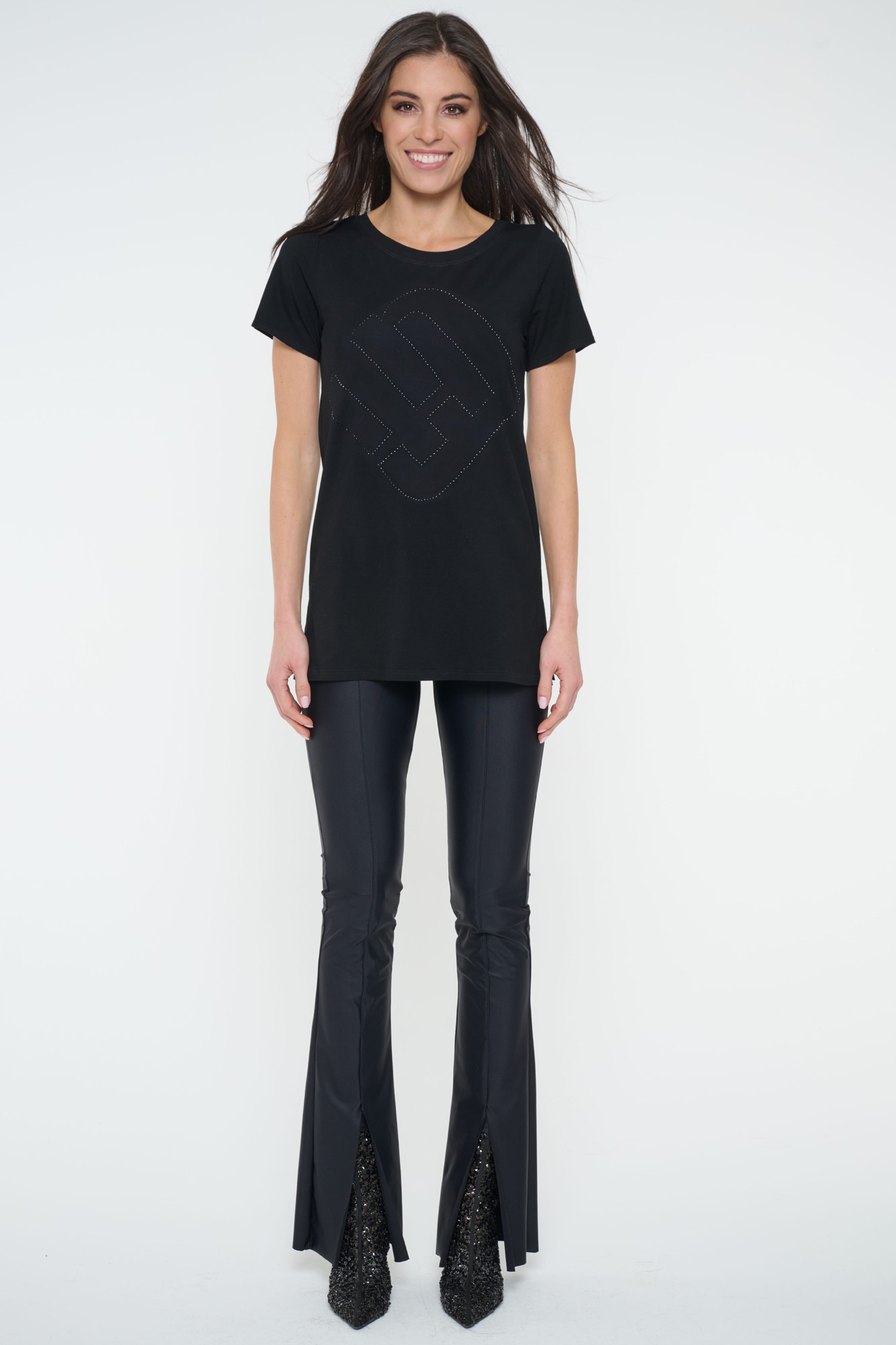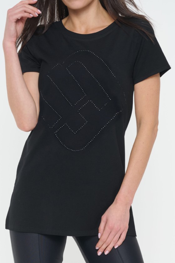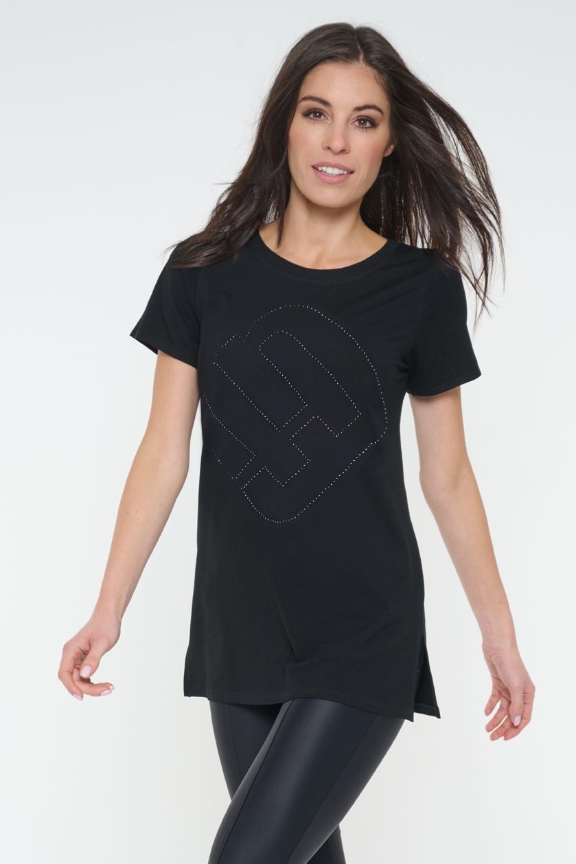 Tričko volnějšího střihu . Maxi nápis Infinite z černých krystalů Preciosa.