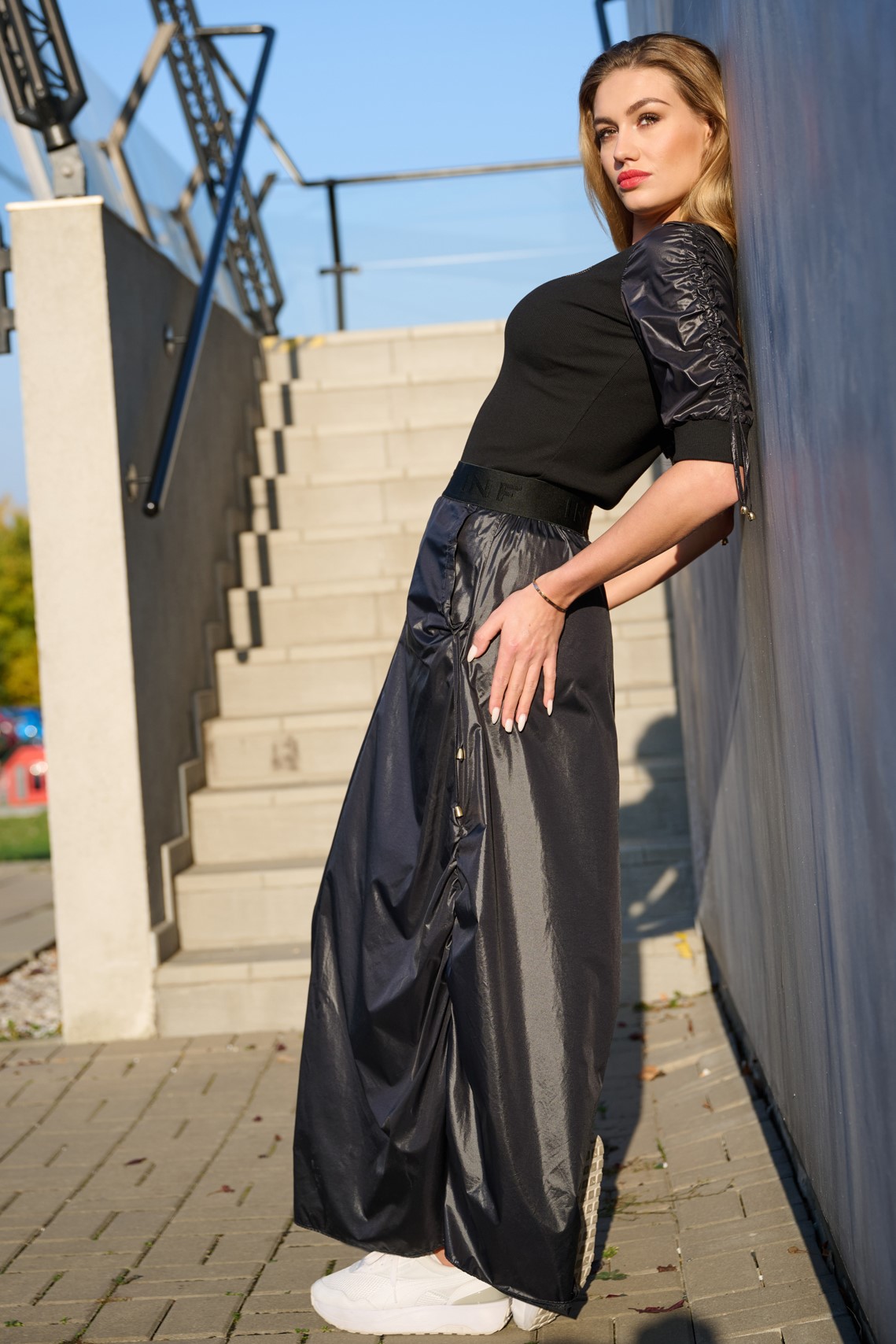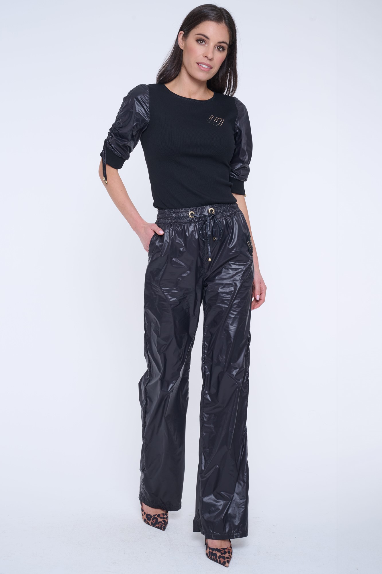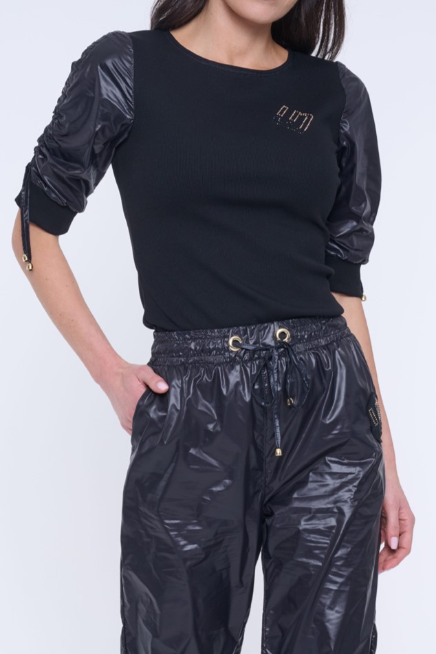 Luxusní tričko z jemného žebrového úletu s nabíranými rukávy ze šusťáku.Na předním díle motiv - logo INF z černozlatých krystalů Preciosa.