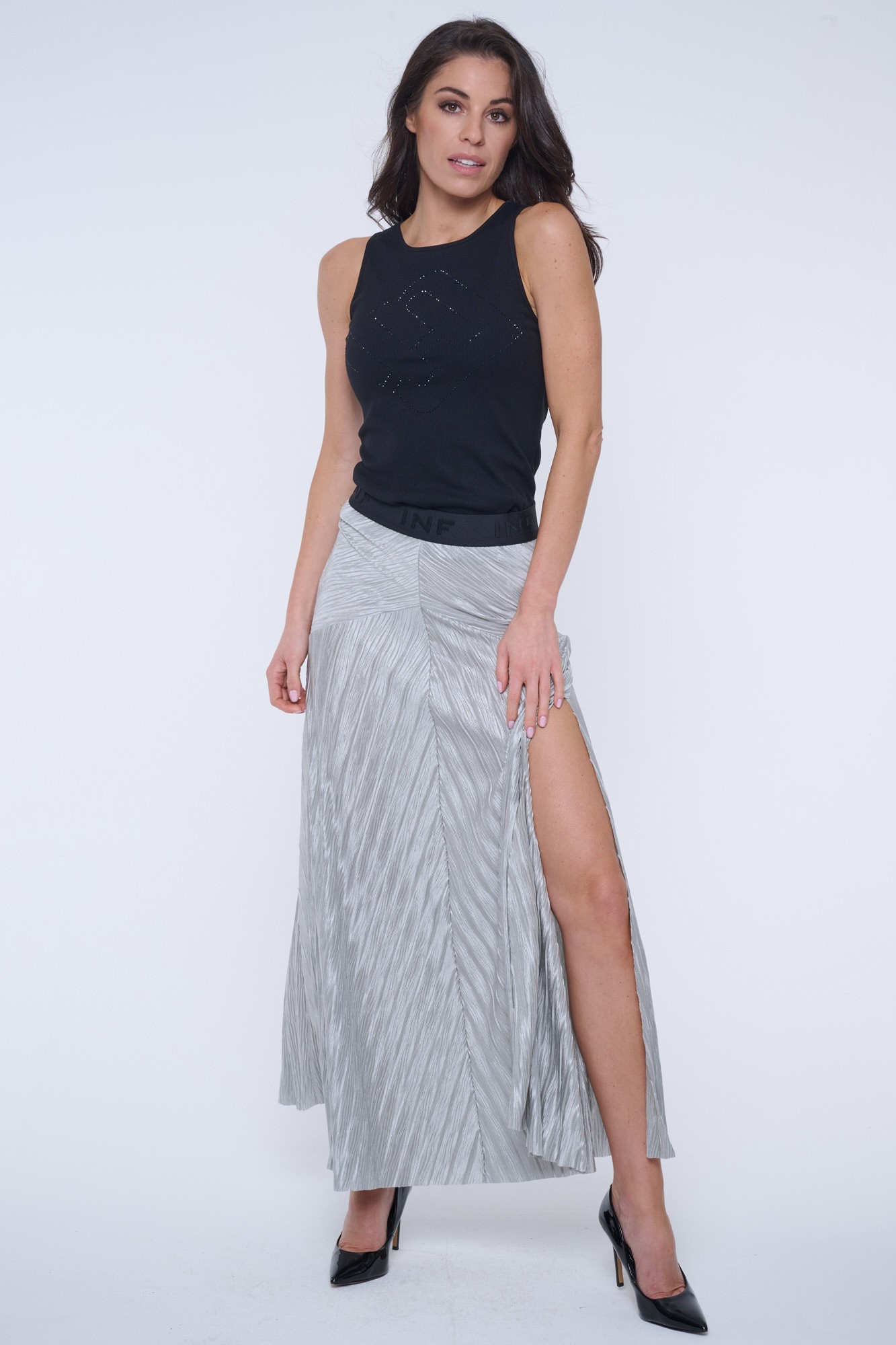 Top bez rukávů z žebrového úpletu. Na předním díle efektní nový typ loga INF z černých krystalů Preciosa. Infinite "rib" úplet je velmi kvalitní a má úžasné složení - bavlna, modal, elastan. Modal je materiál z přírodní suroviny - bukového dřeva. Je hebký a měkký na povrch a příjemný na nošení.