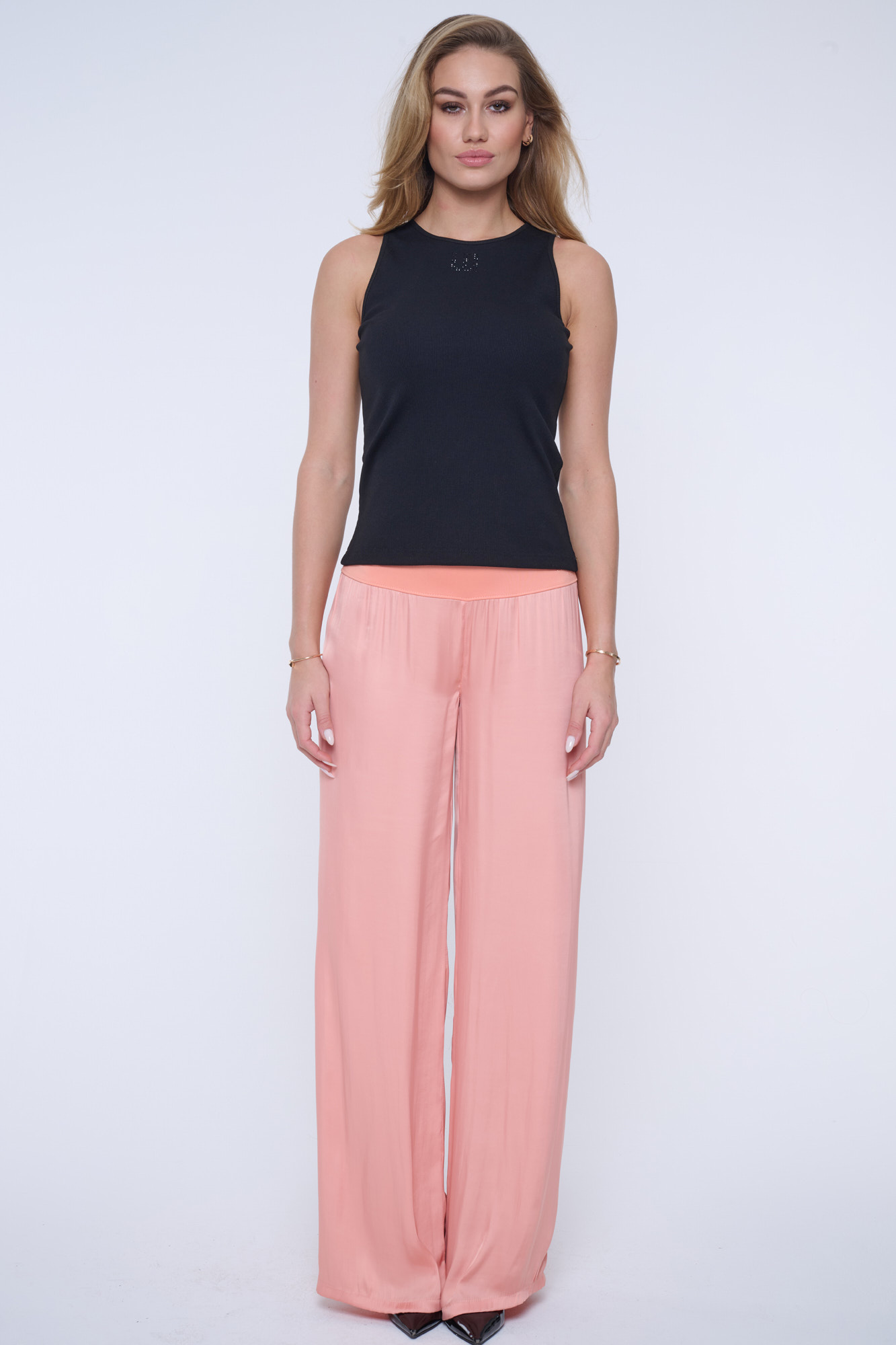 Top bez rukávů z žebrového úpletu. Na předním díle efektní minimalistické logo INF z černých krystalů Preciosa. Infinite "rib" úplet je velmi kvalitní a má úžasné složení - bavlna, modal, elastan. Modal je materiál z přírodní suroviny - bukového dřeva. Je hebký a měkký na povrch a příjemný na nošení.