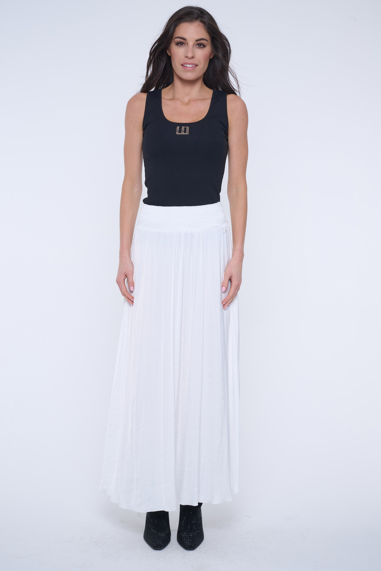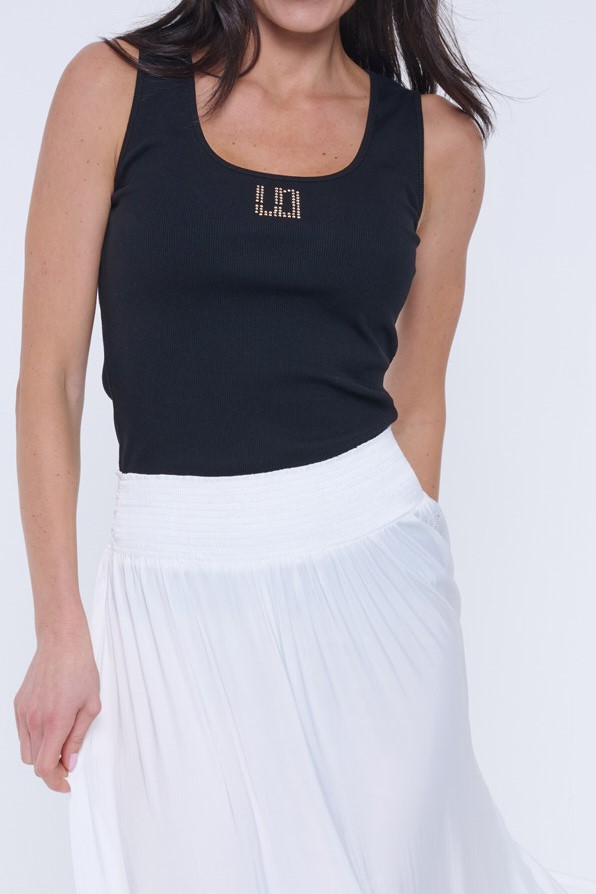 Top s výstřihem z žebrového úpletu. Na předním díle efektní minimalistické logo INF ze zlatých krystalů Preciosa. Infinite "rib" úplet je velmi kvalitní a má úžasné složení - bavlna, modal, elastan. Modal je materiál z přírodní suroviny - bukového dřeva. Je hebký a měkký na povrch a příjemný na nošení.
