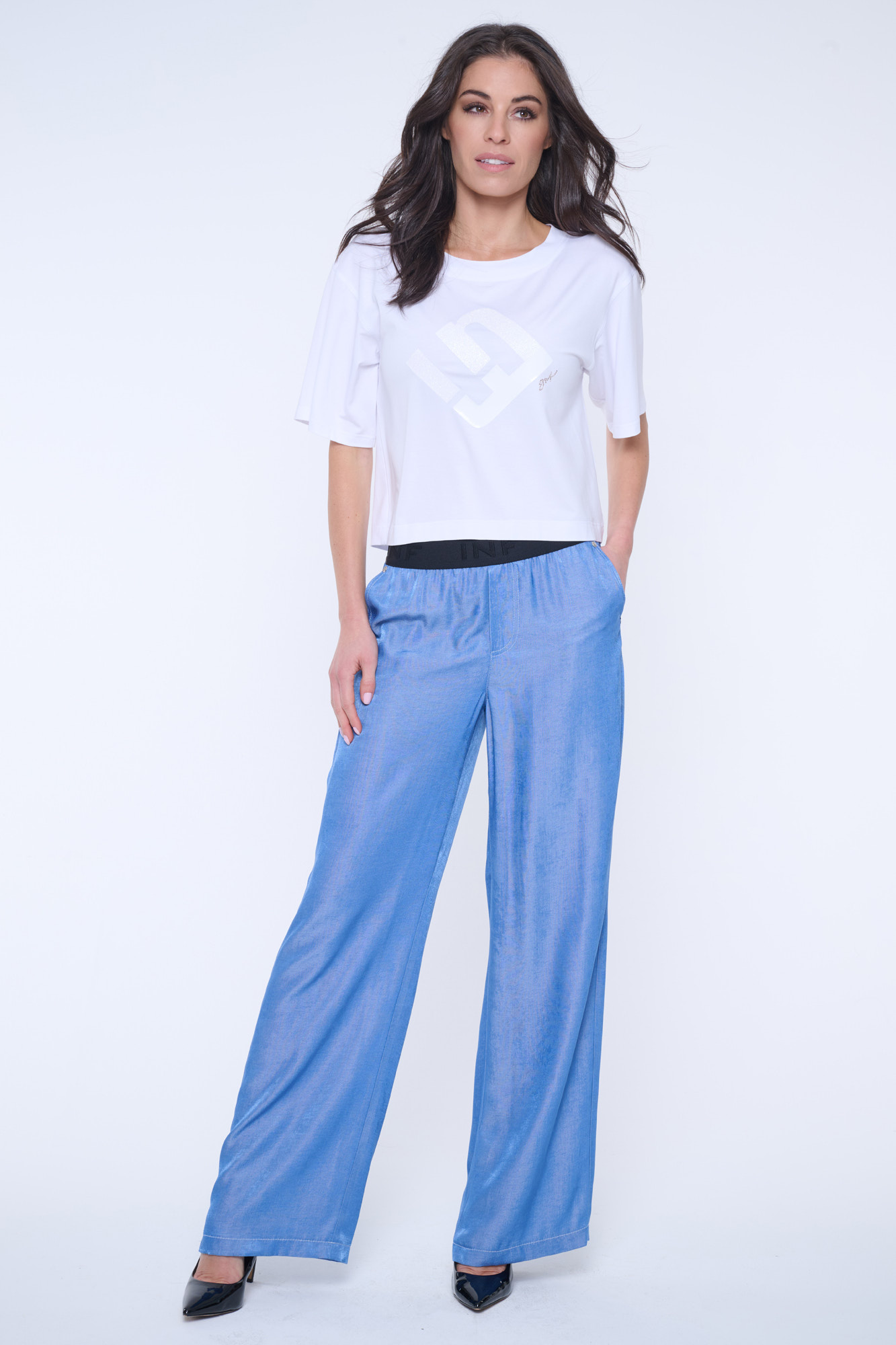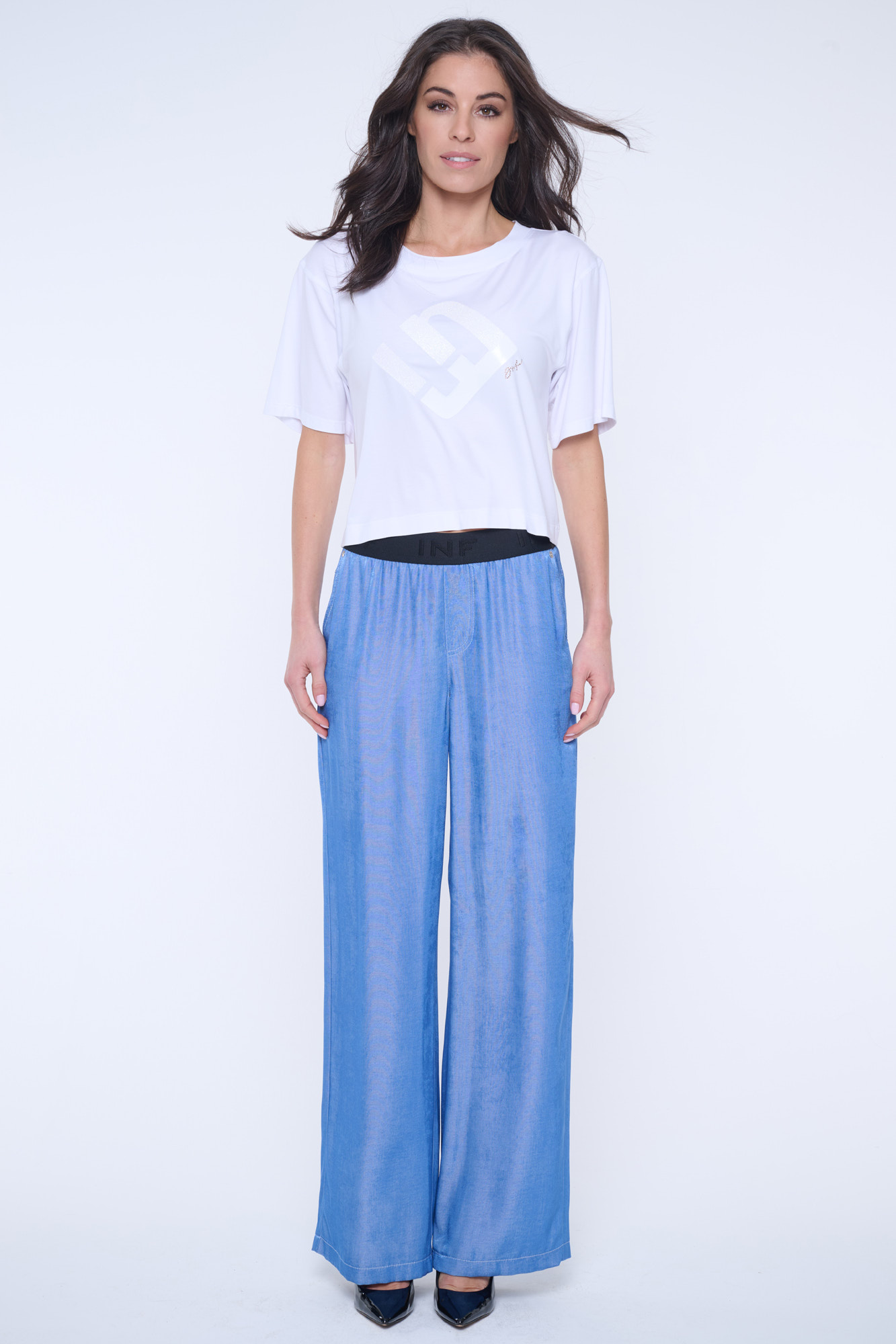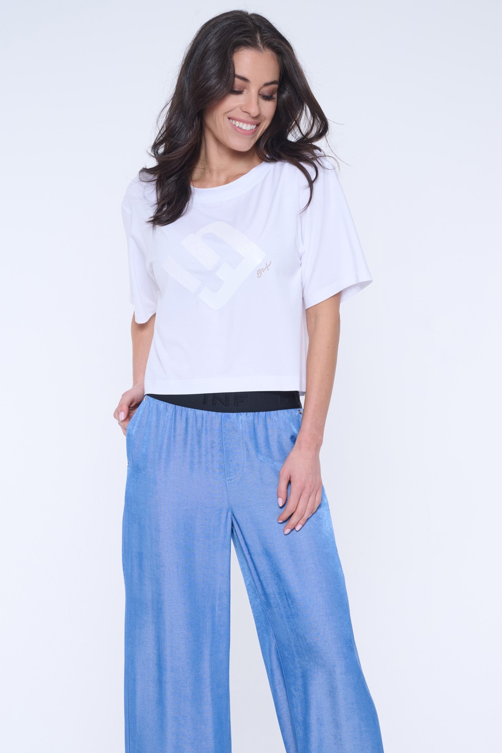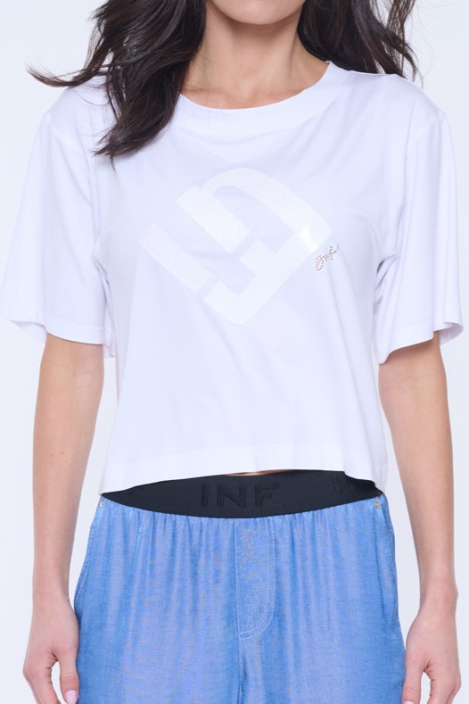 Volný crop top do pasu ze strečového viskózového úpletu. Na předním díle efektní tisk - nový typ loga INF. Minimalistické logo INF ze zlatých krystalů Swarovski.