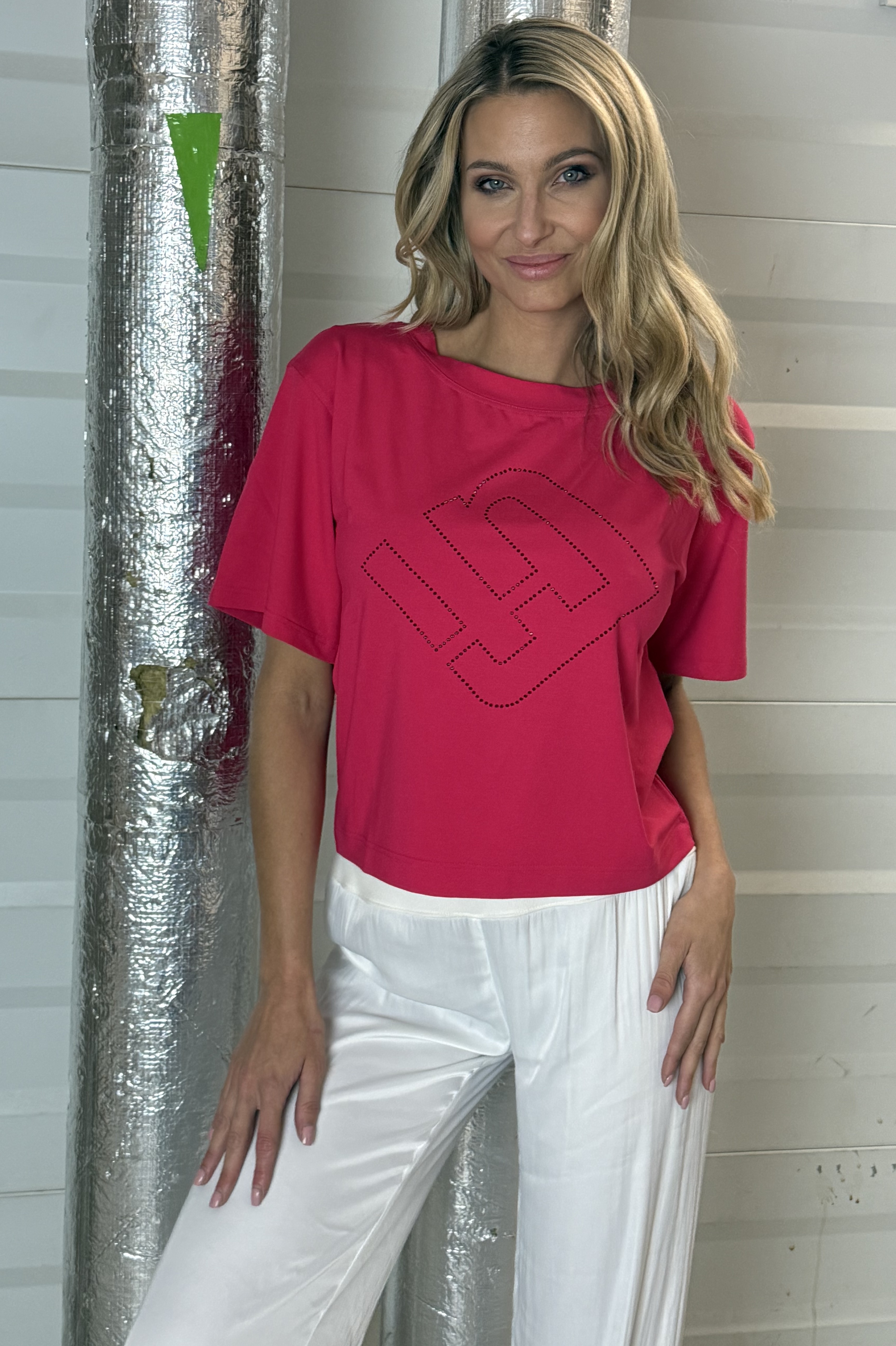 Volný crop top do pasu ze strečového viskózového úpletu. Na předním díle efektní nový typ loga z krystalů Preciosa.