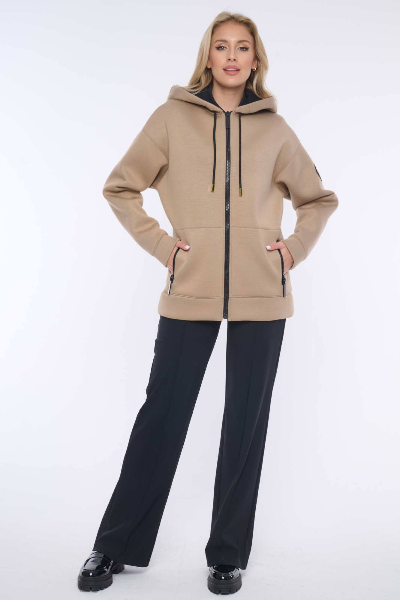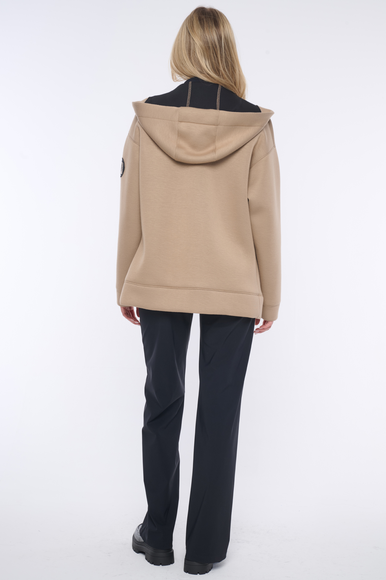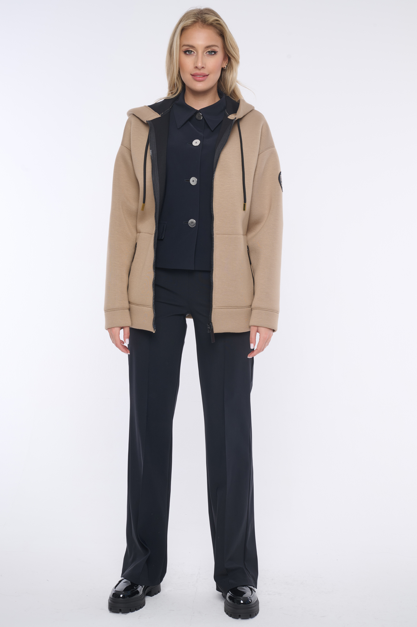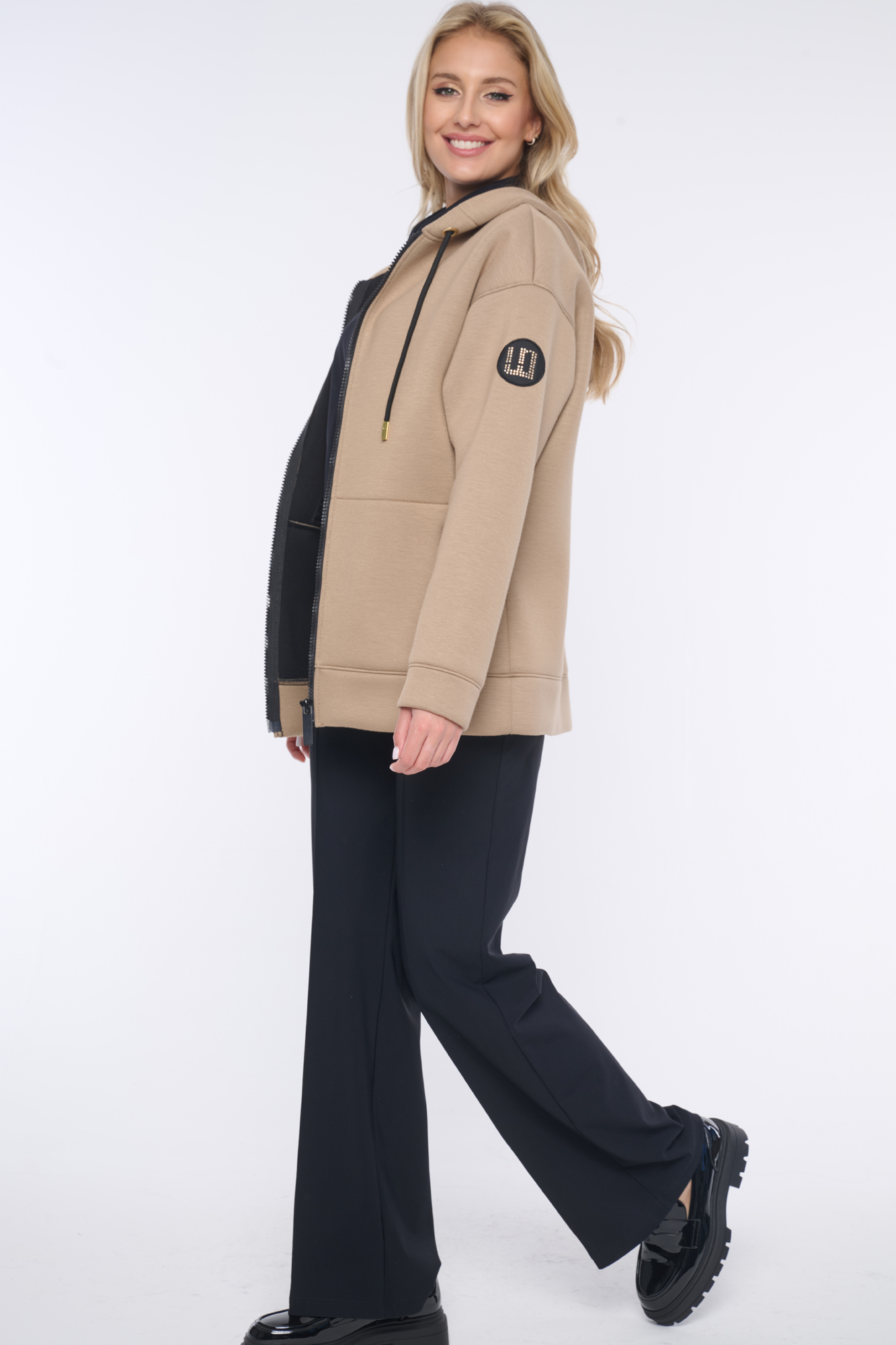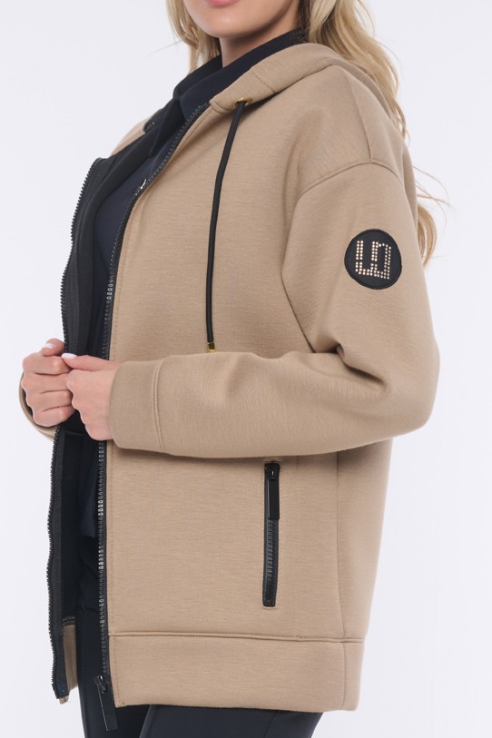 Rozepínací mikina s kapucí z módního materiálu. Zlaté doplňky. Na rameni nášivka se zlatým logem INF z krystalů Preciosa.