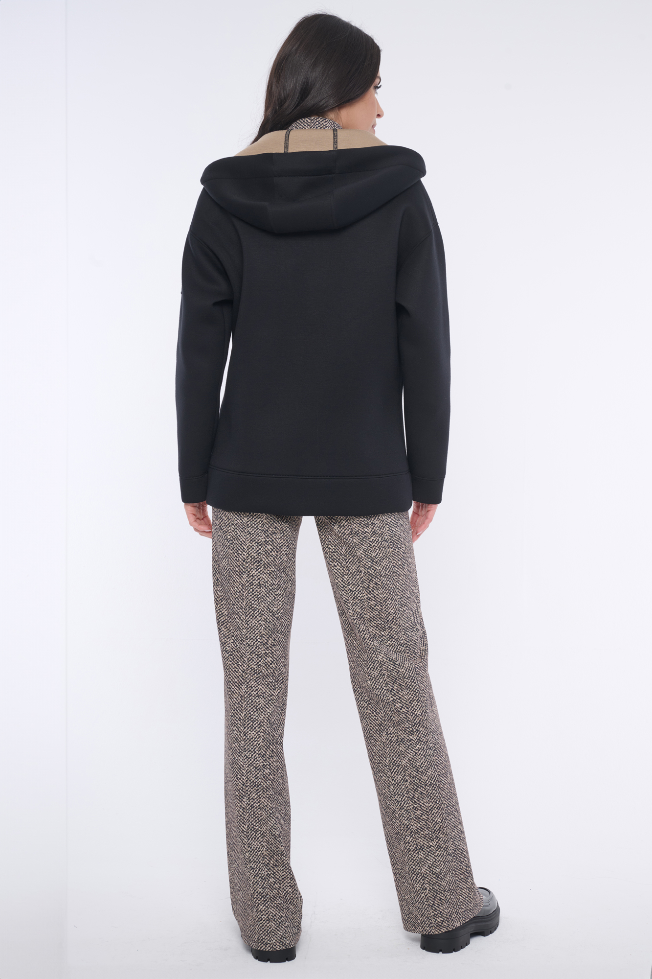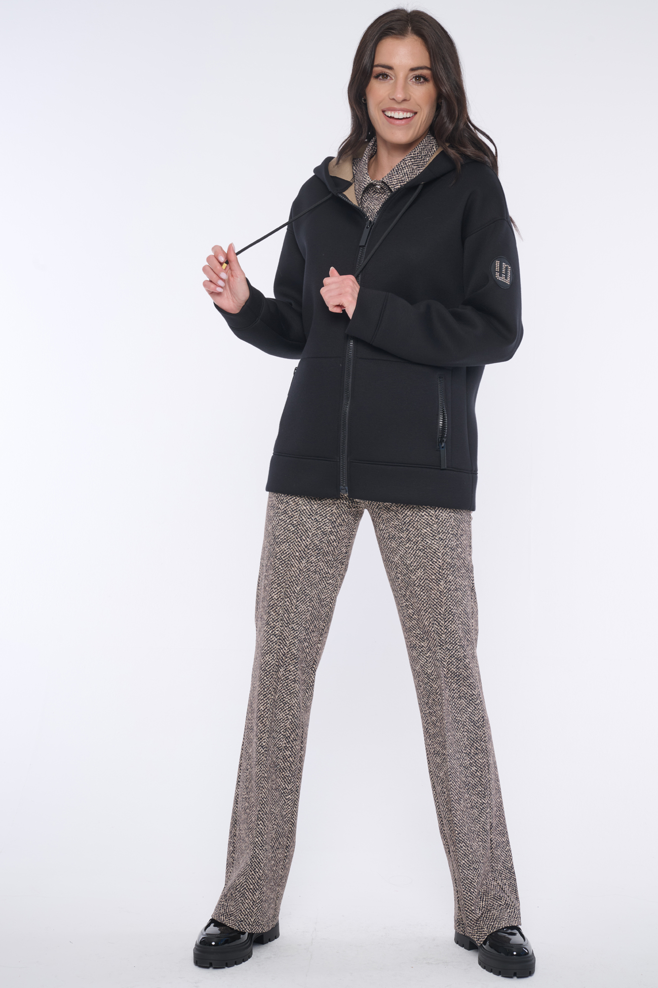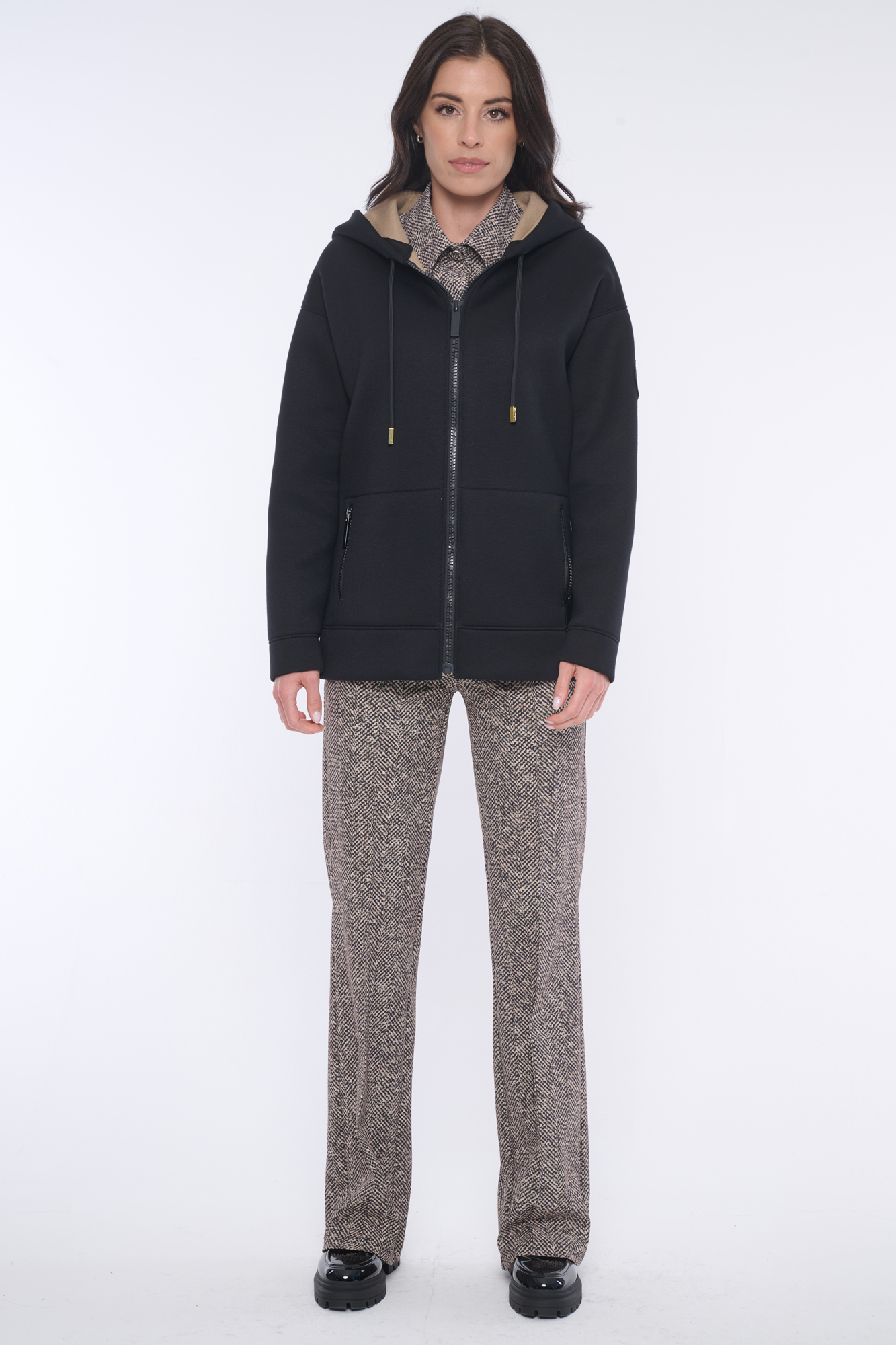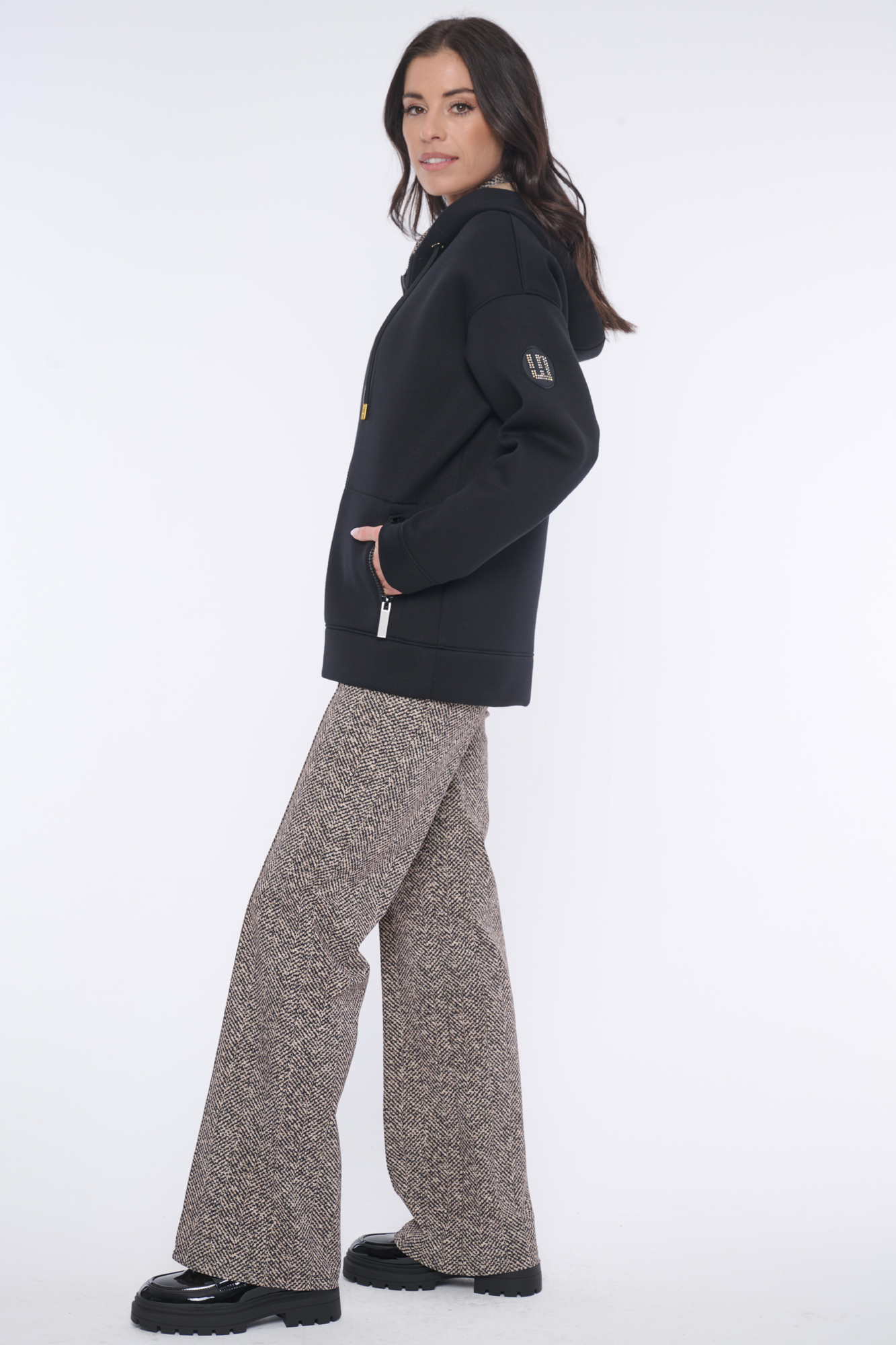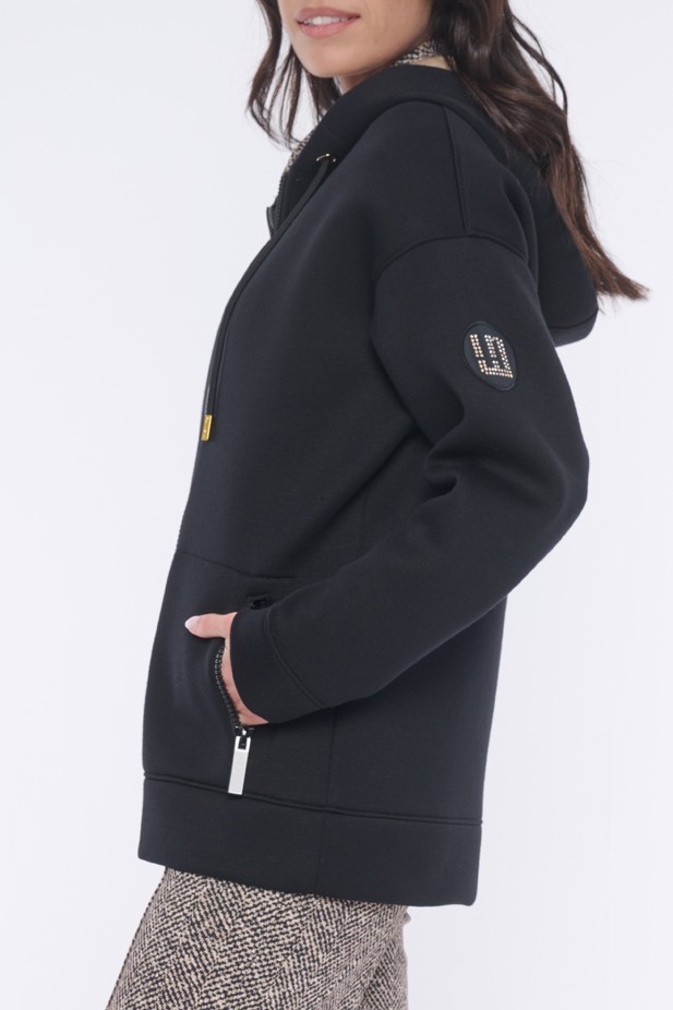 Rozepínací mikina s kapucí z módního materiálu. Zlaté doplňky. Na rameni nášivka se zlatým logem INF z krystalů Preciosa.