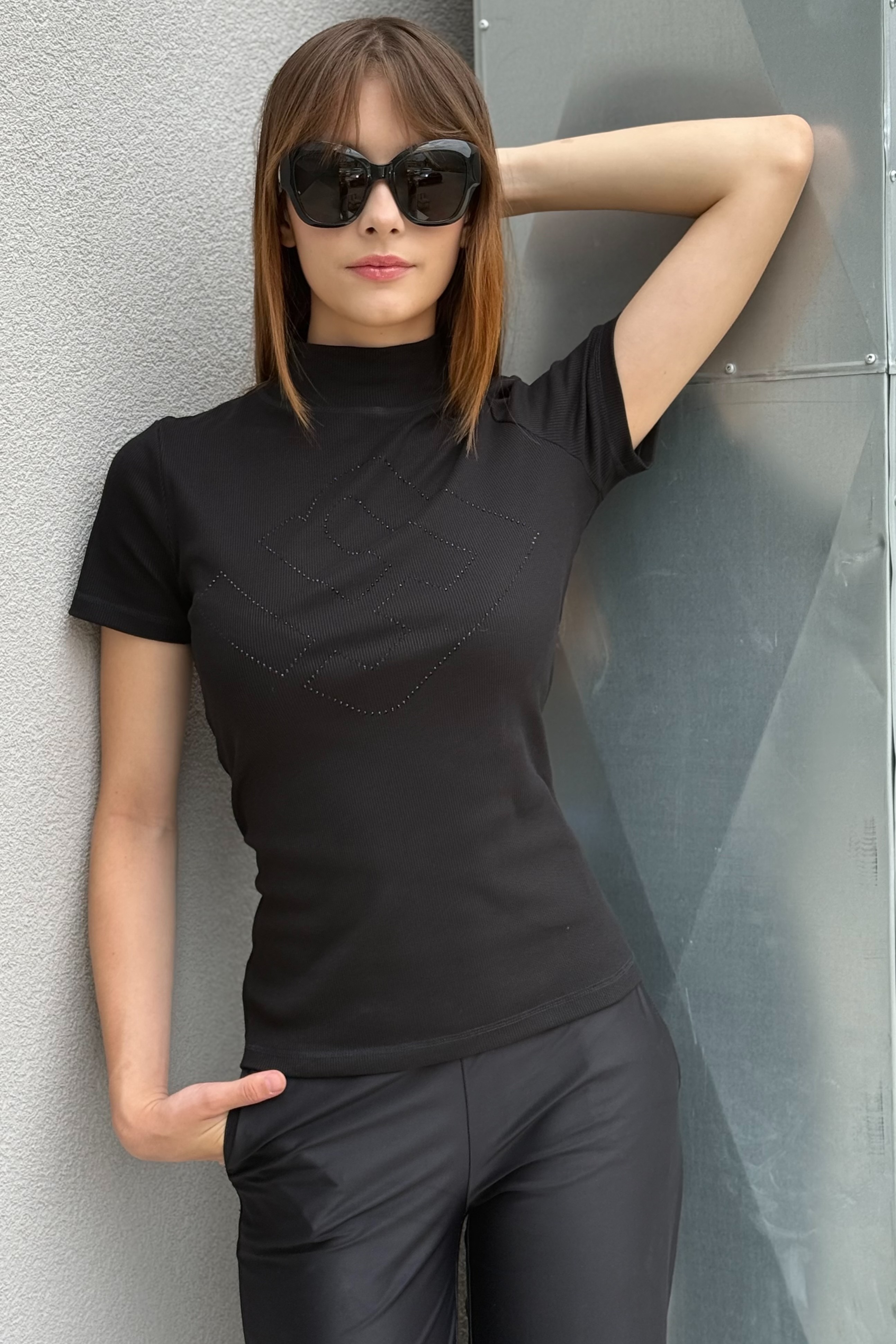 Triko se stojákem a krátkým rukávem z "ribs" úpletu. Na předním dílu maxi logo INF z černých krystalů Preciosa. Tento top je ideální pod jakoukoliv bundičku, sako nebo i samostatně.