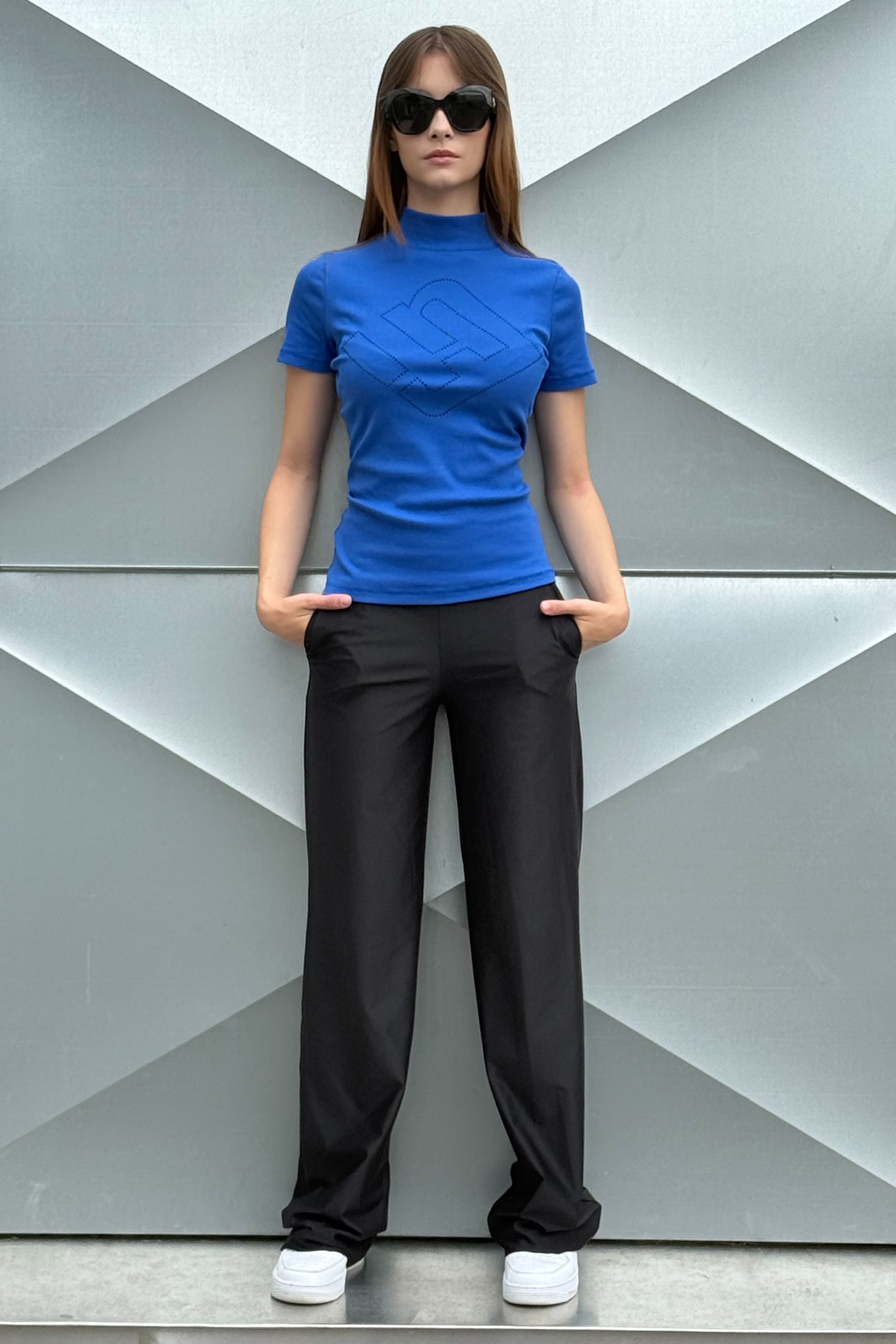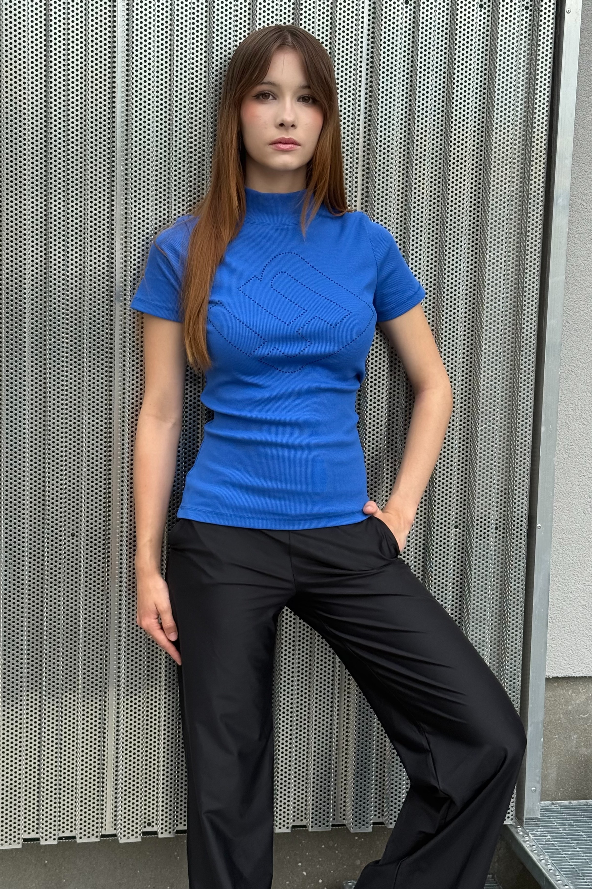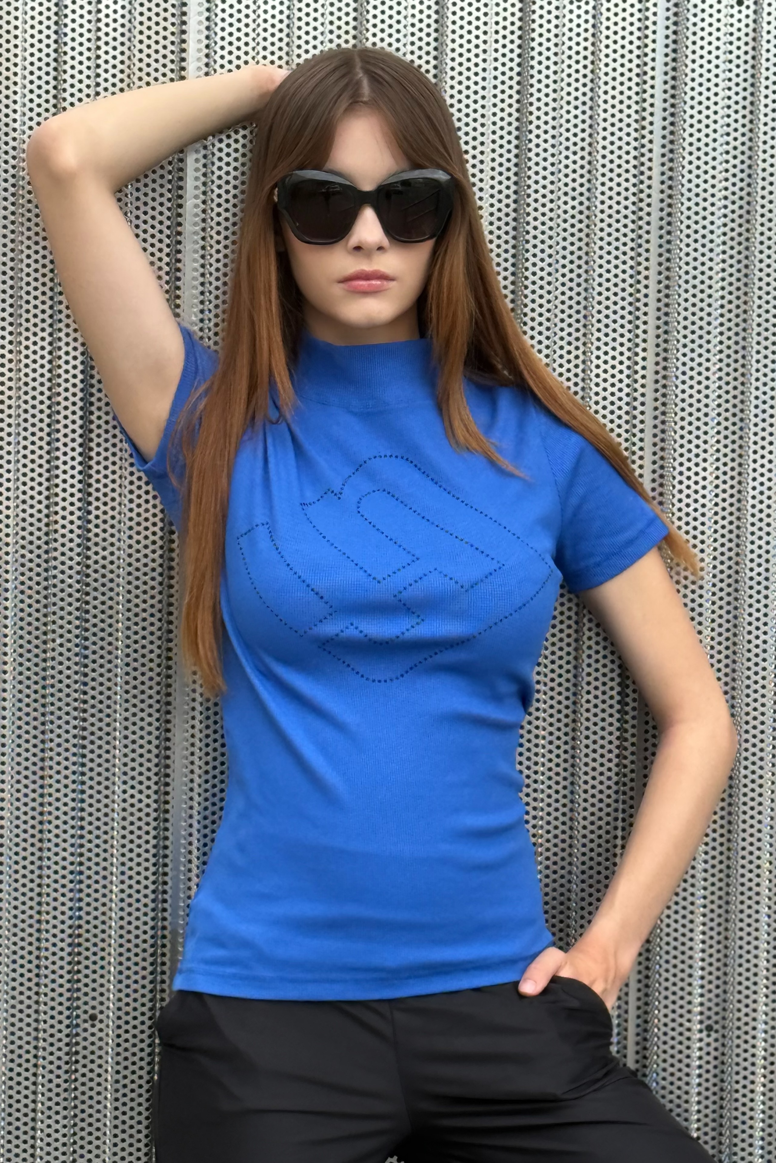 Triko se stojákem a krátkým rukávem z "ribs" úpletu. Na předním dílu maxi logo INF z černých krystalů Preciosa. Tento top je ideální pod jakoukoliv bundičku, sako nebo i samostatně.