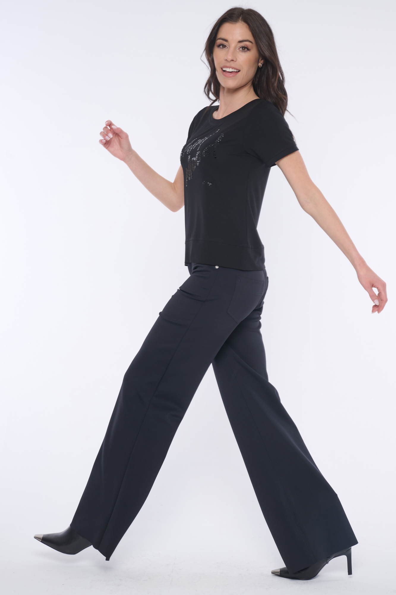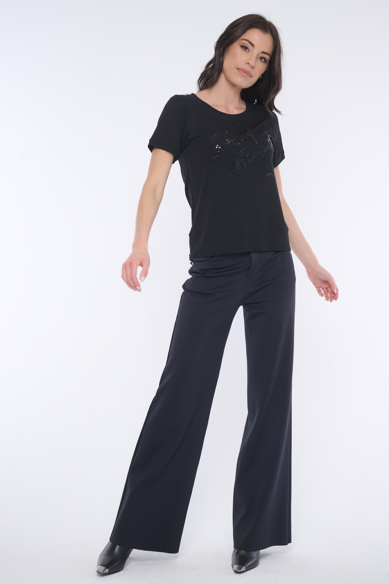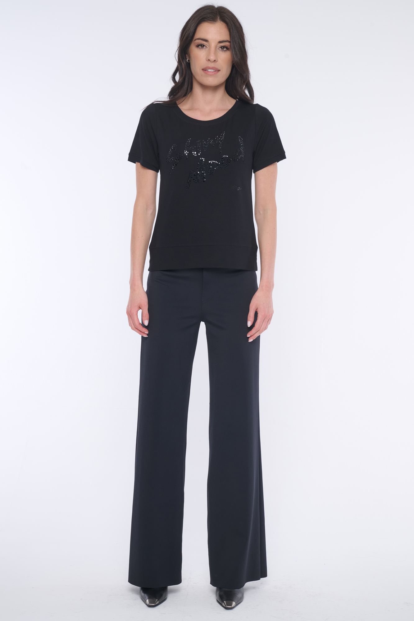 Top rovnějšího střihu. Na předním díle efektní motiv "Shiny mood" z krystalů italské produkce a minimalisté logo INF z krystalů Swarovski.