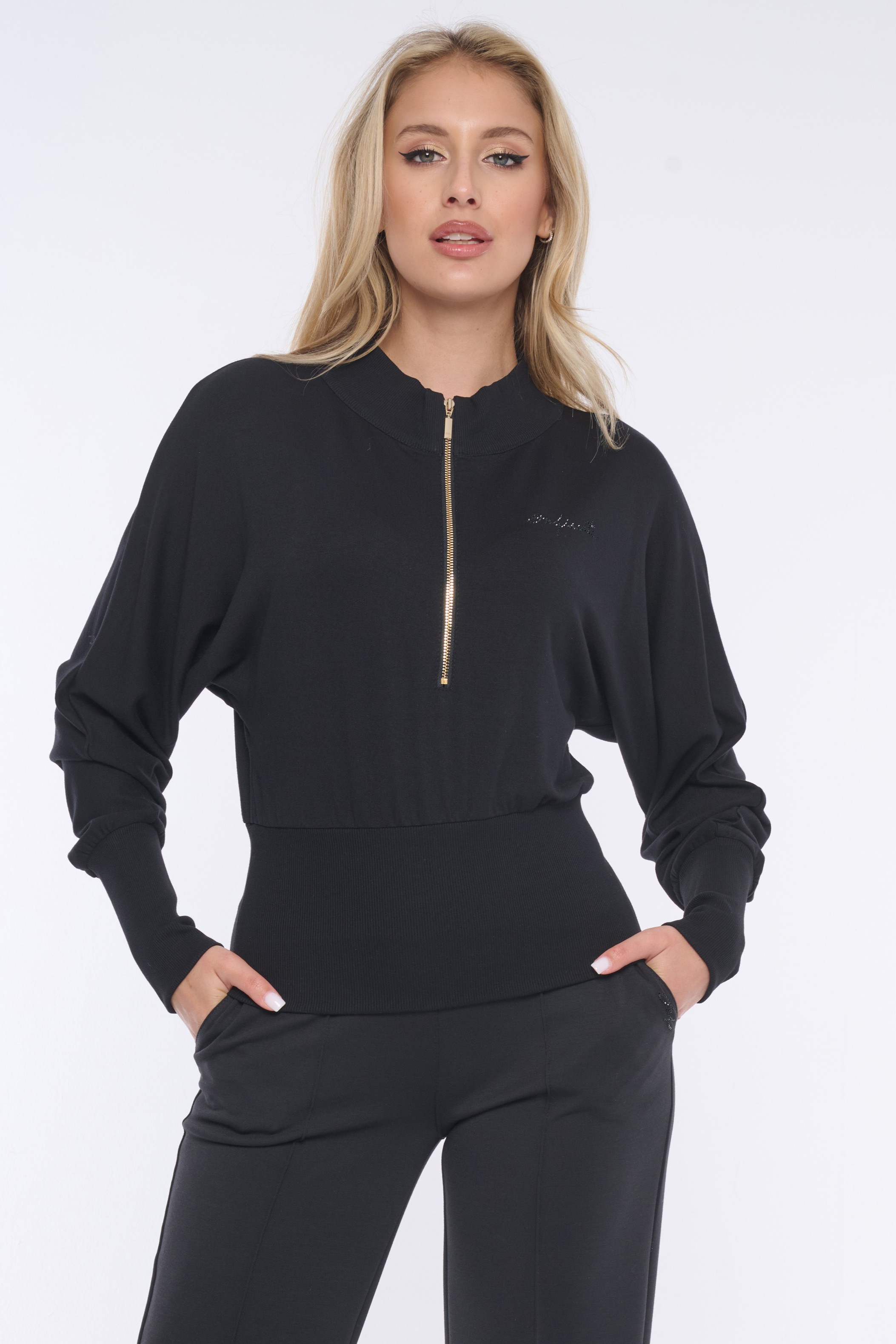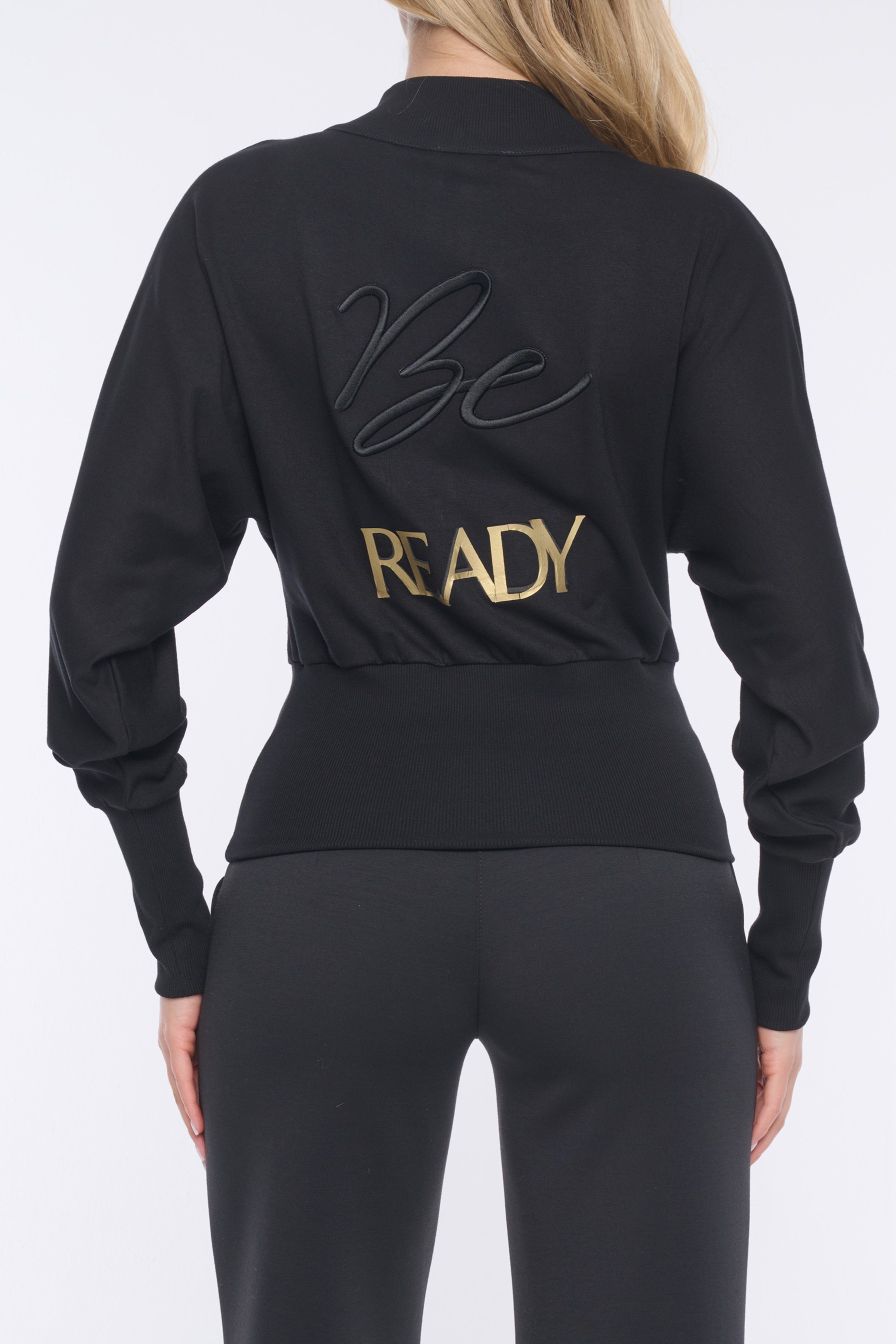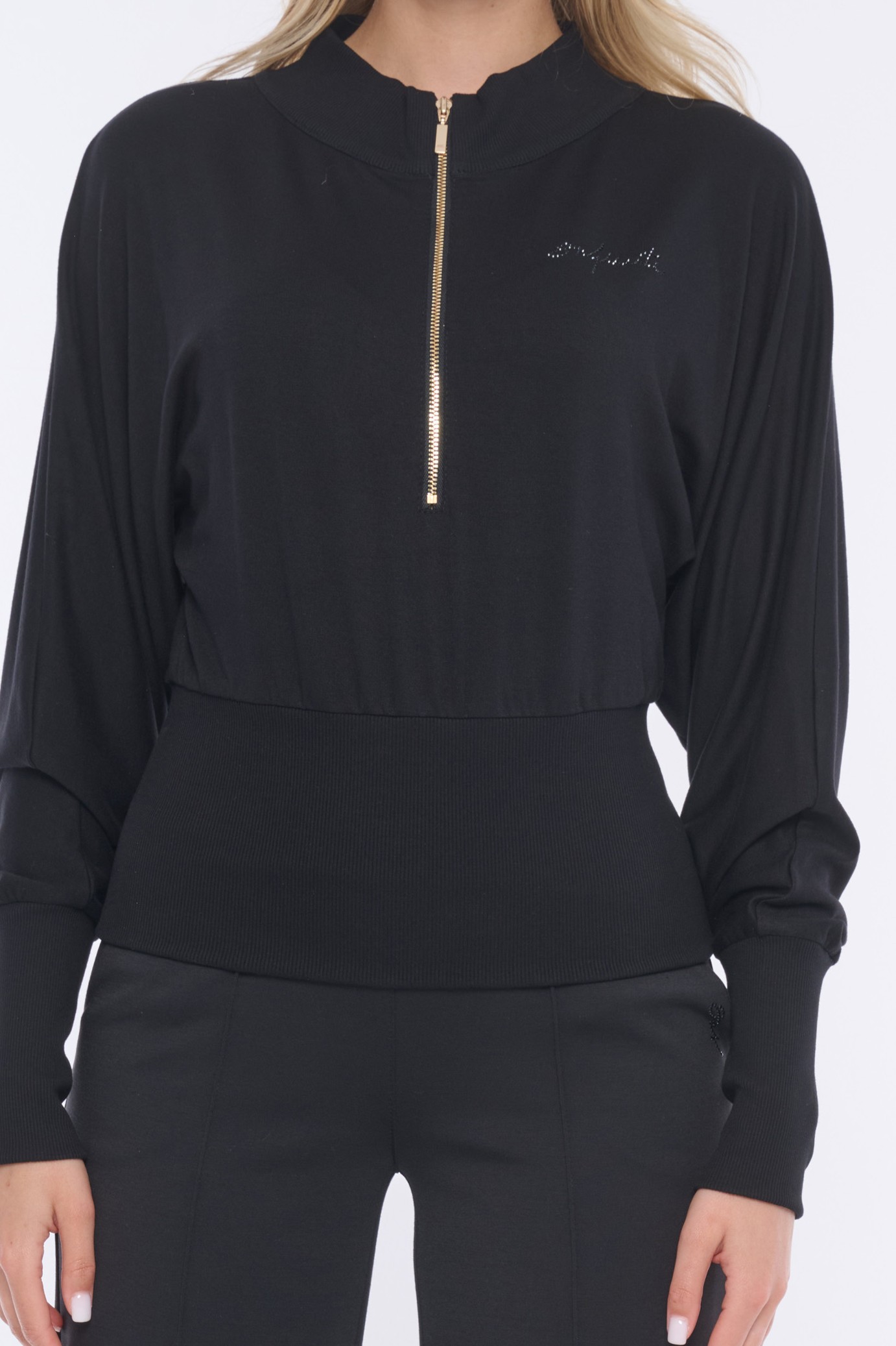 Mikina do pasu. Ve výstřihu zlatý zip. Na předním díle nápis Infinite z krystalů Preciosa. Na zadním díle efektní motiv "Be ready" italské produkce. V pase a na rukávech "rib" úplet.