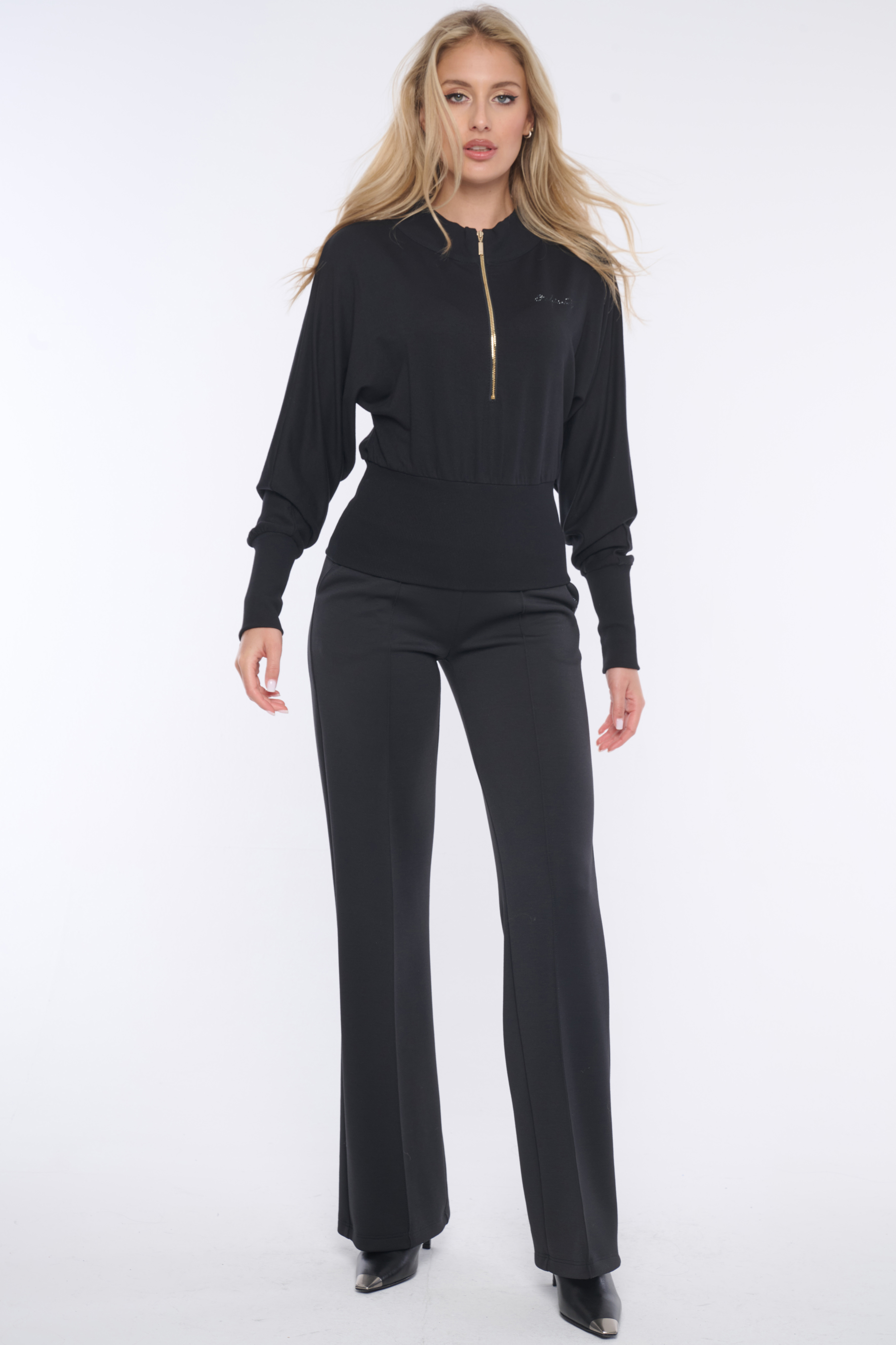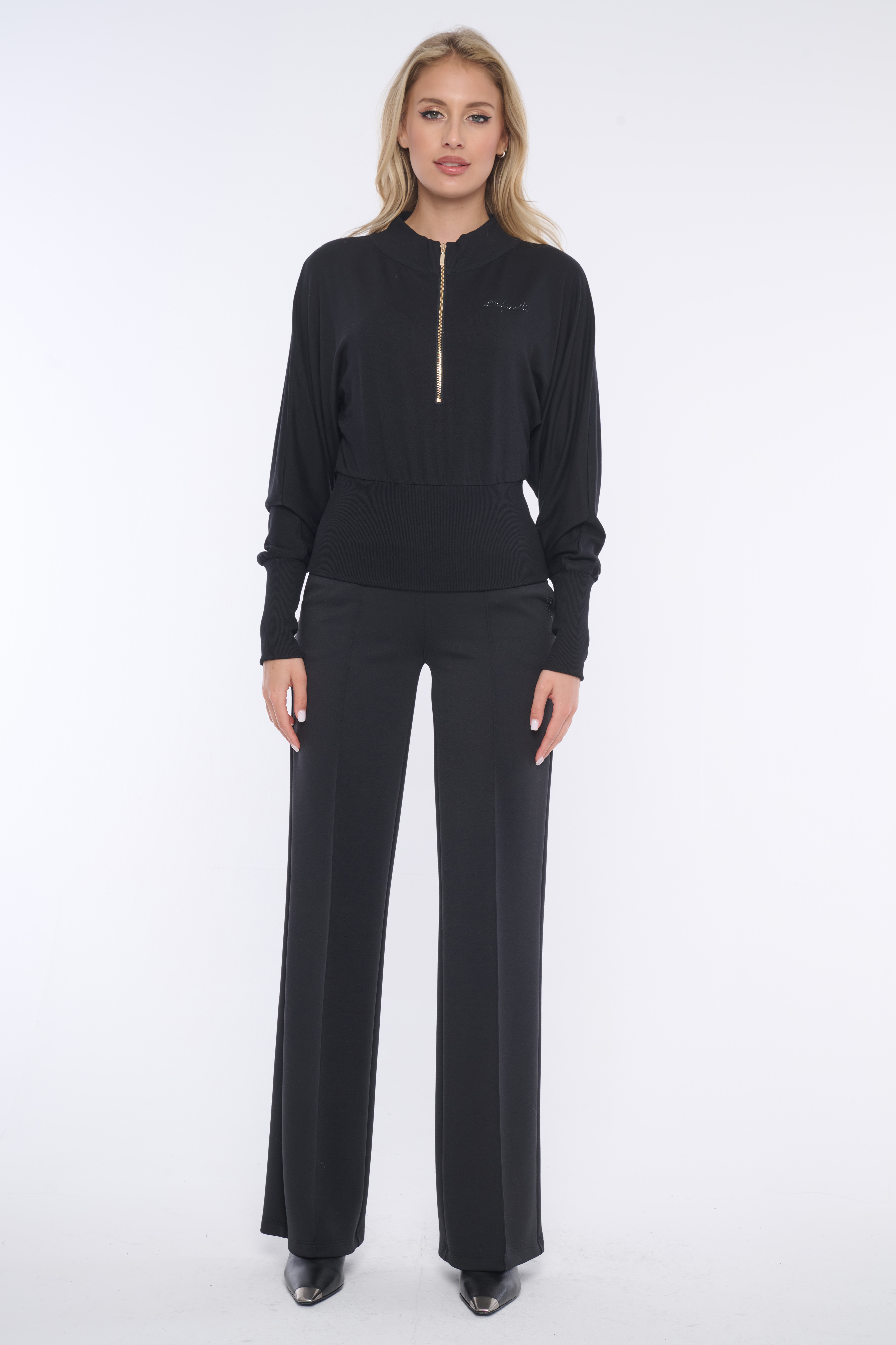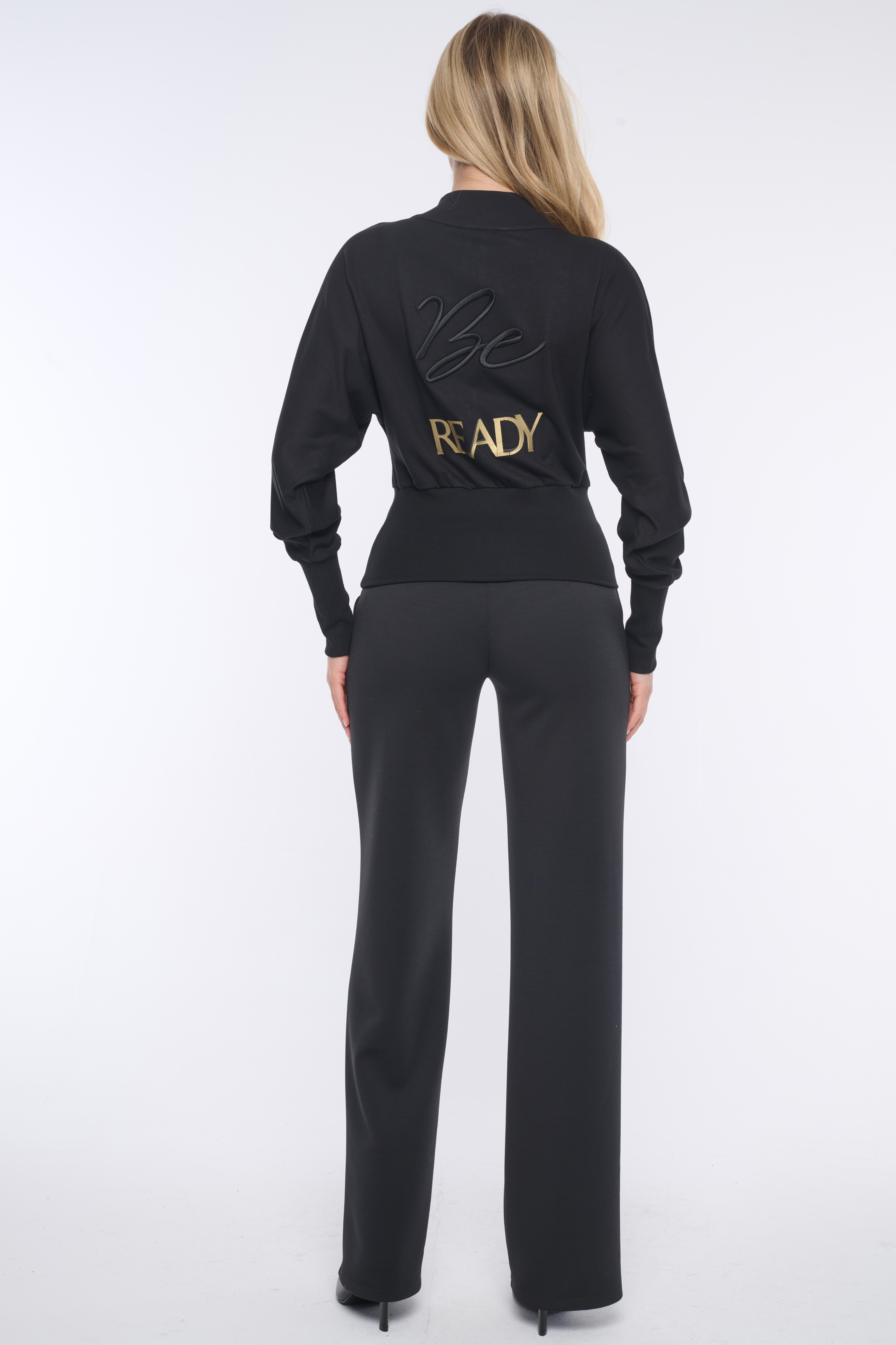 Mikina do pasu. Ve výstřihu zlatý zip. Na předním díle nápis Infinite z krystalů Preciosa. Na zadním díle efektní motiv "Be ready" italské produkce. V pase a na rukávech "rib" úplet.