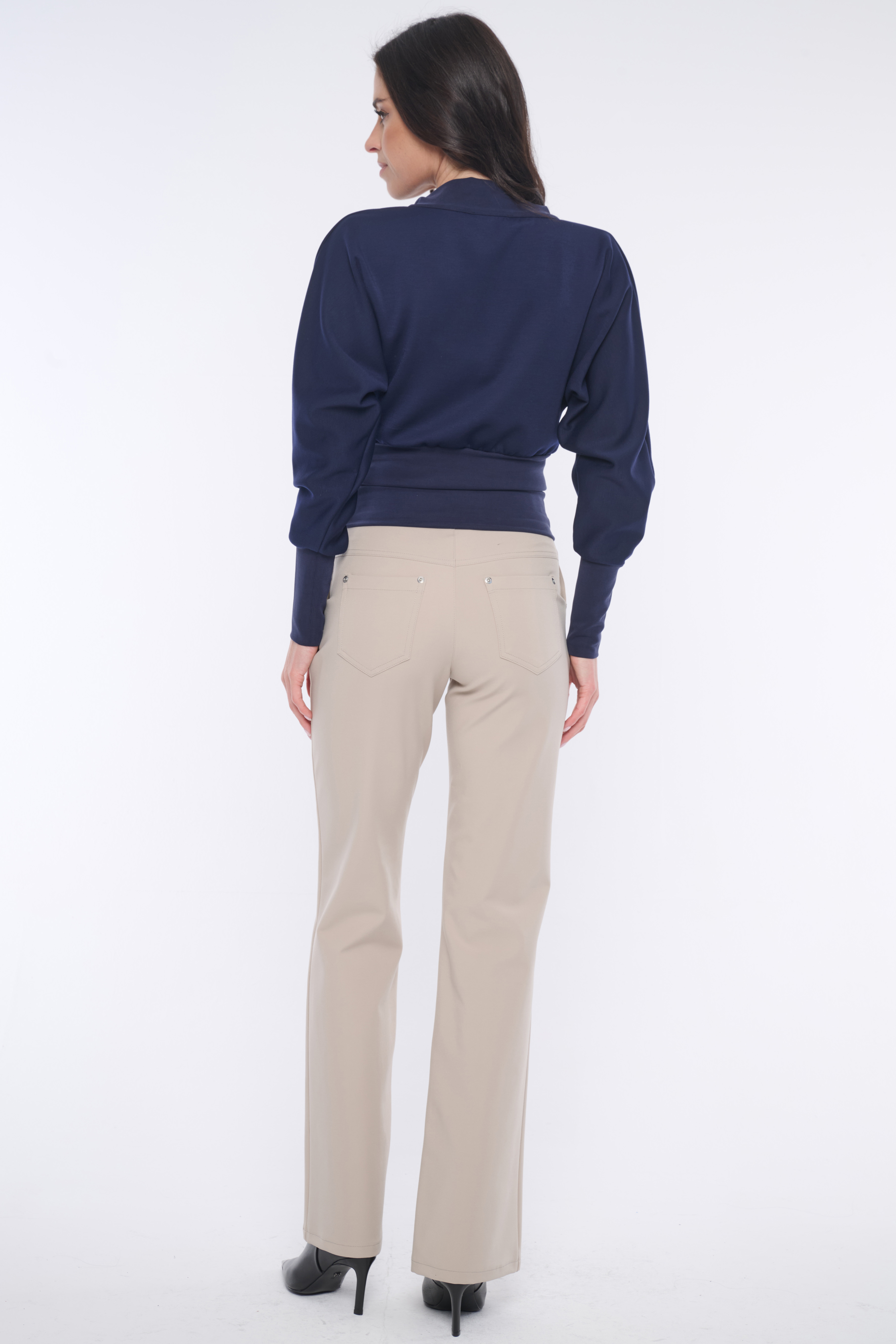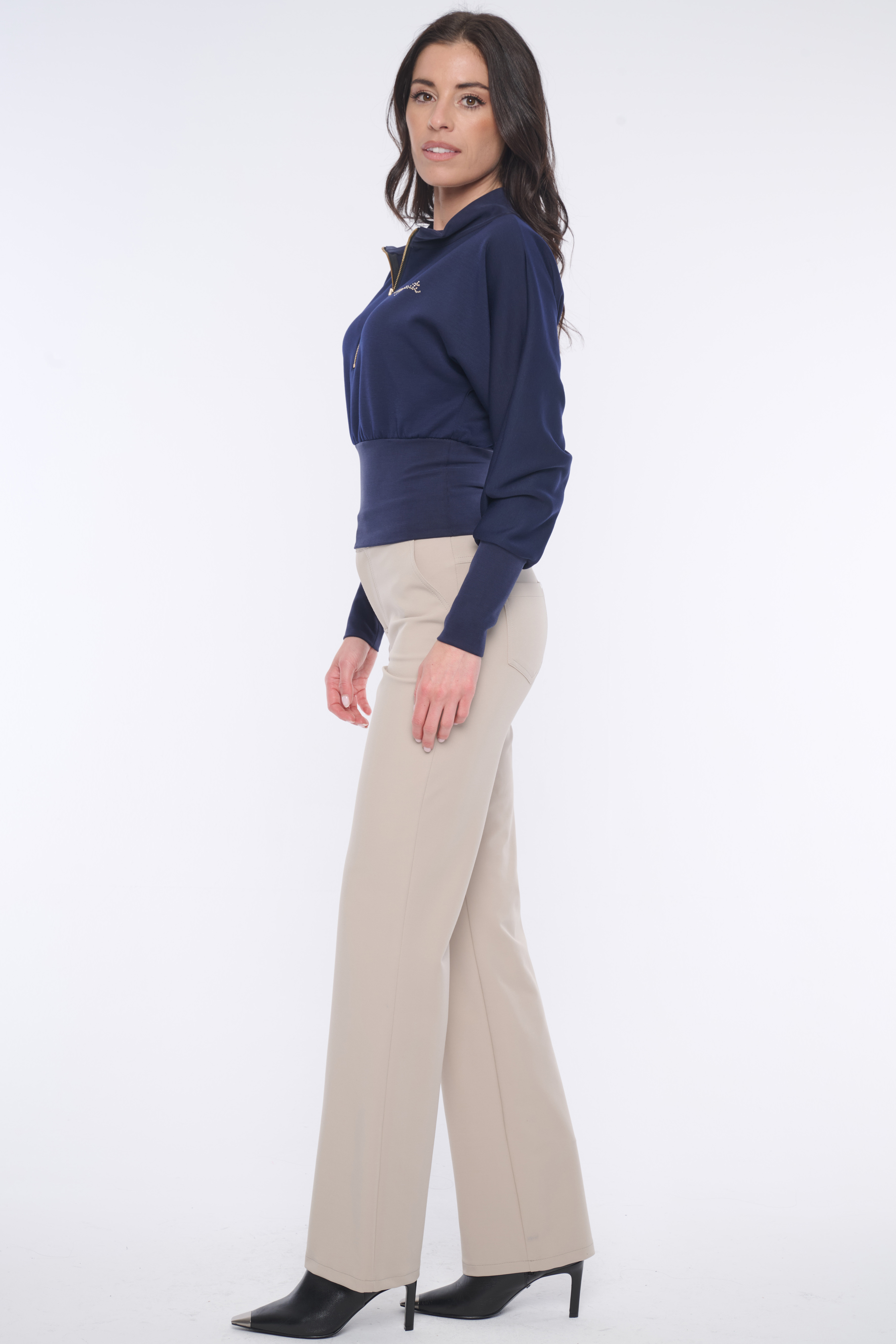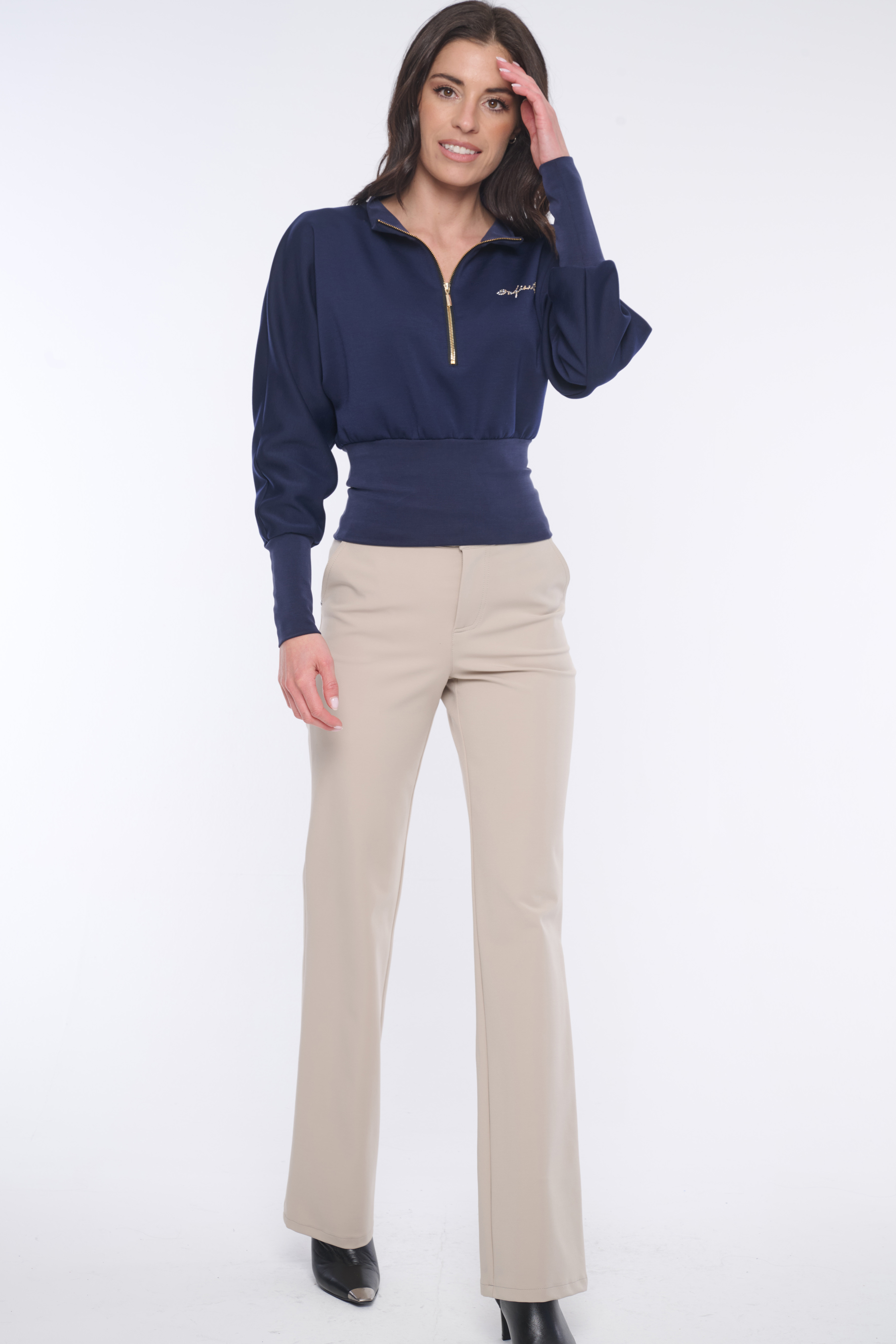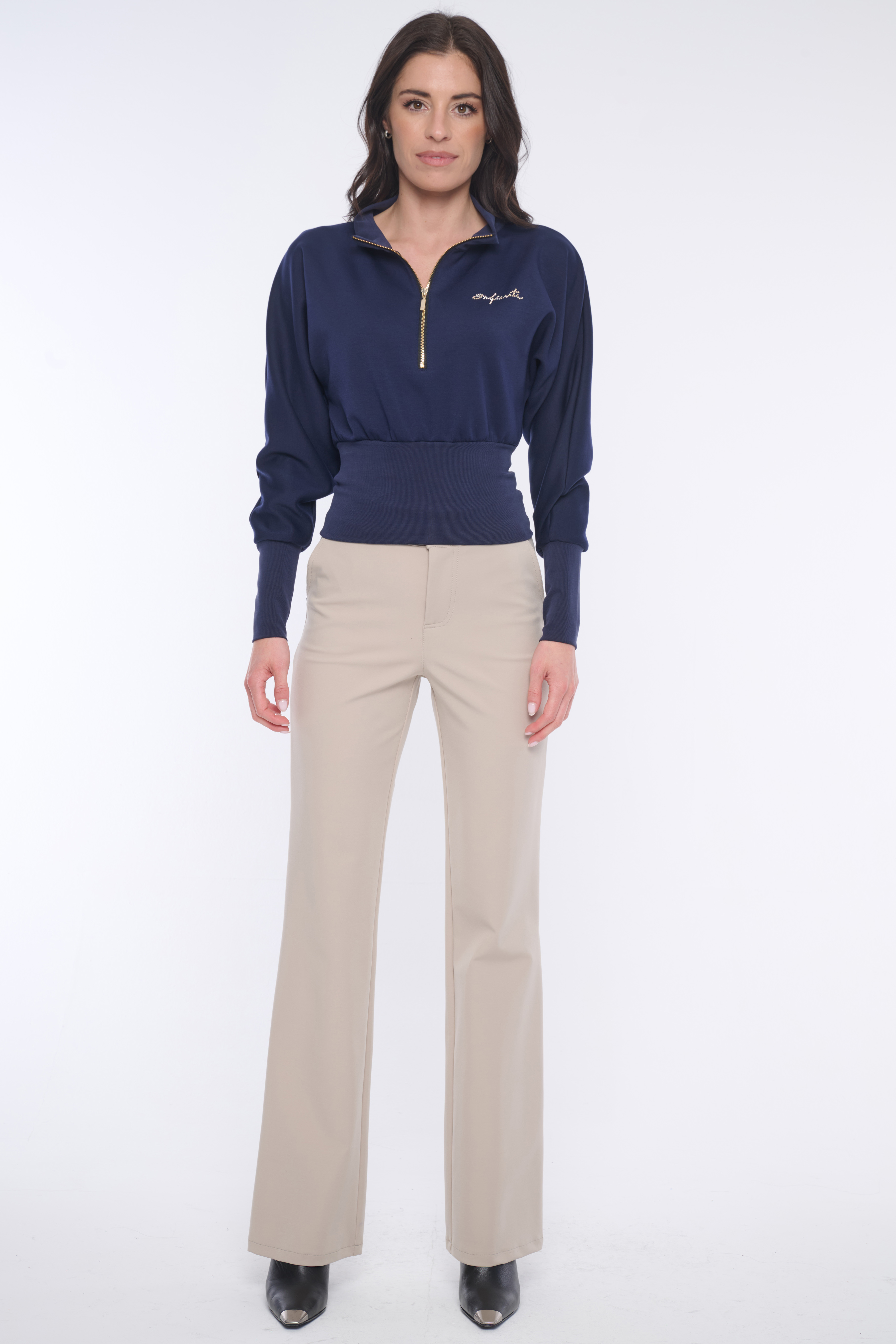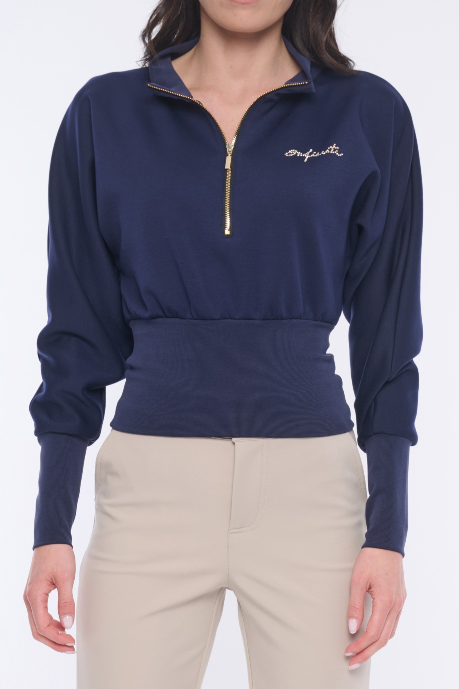 Mikina do pasu. Ve výstřihu zlatý zip. Na předním díle nápis Infinite z krystalů Preciosa. V pase a na rukávech "rib" úplet.