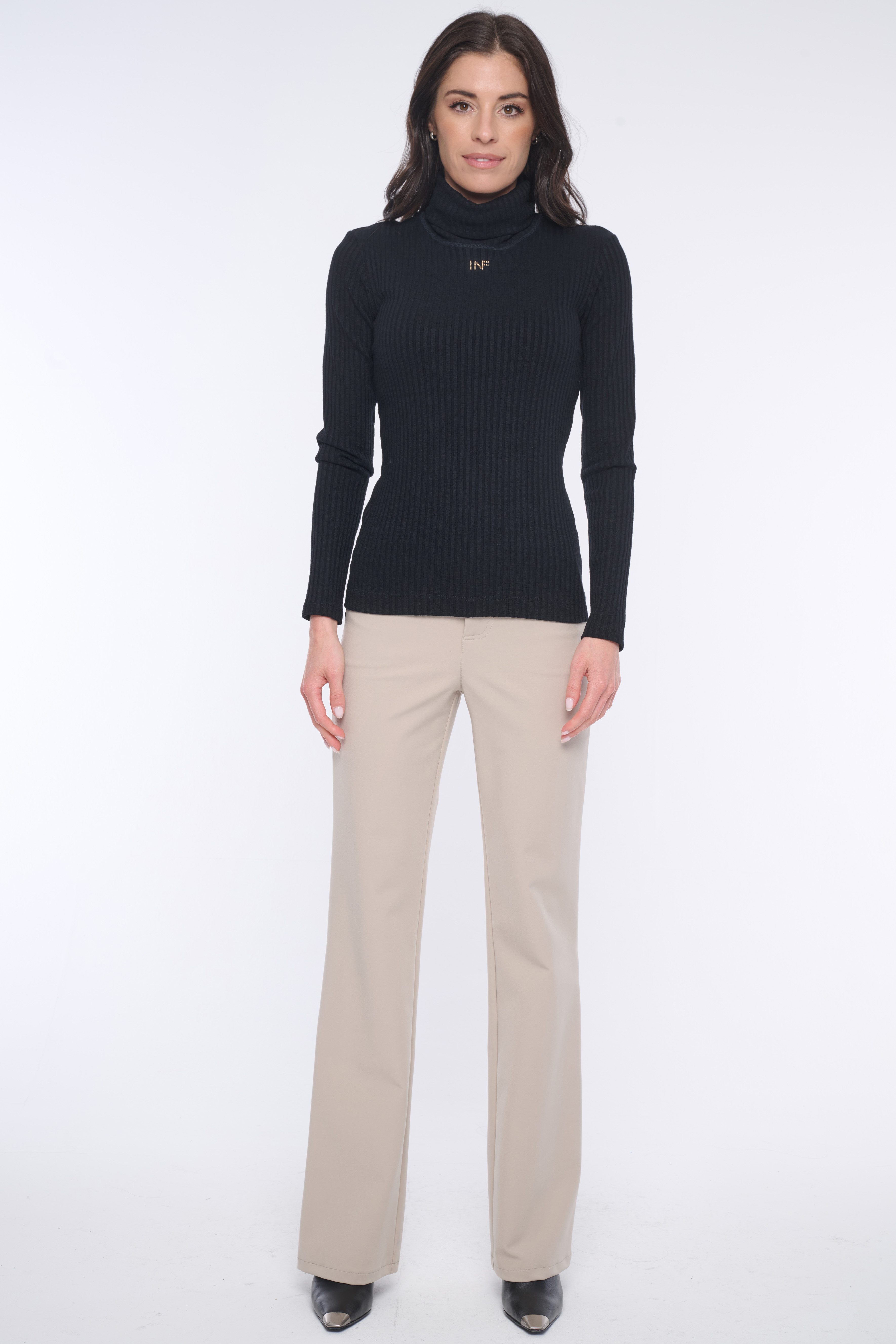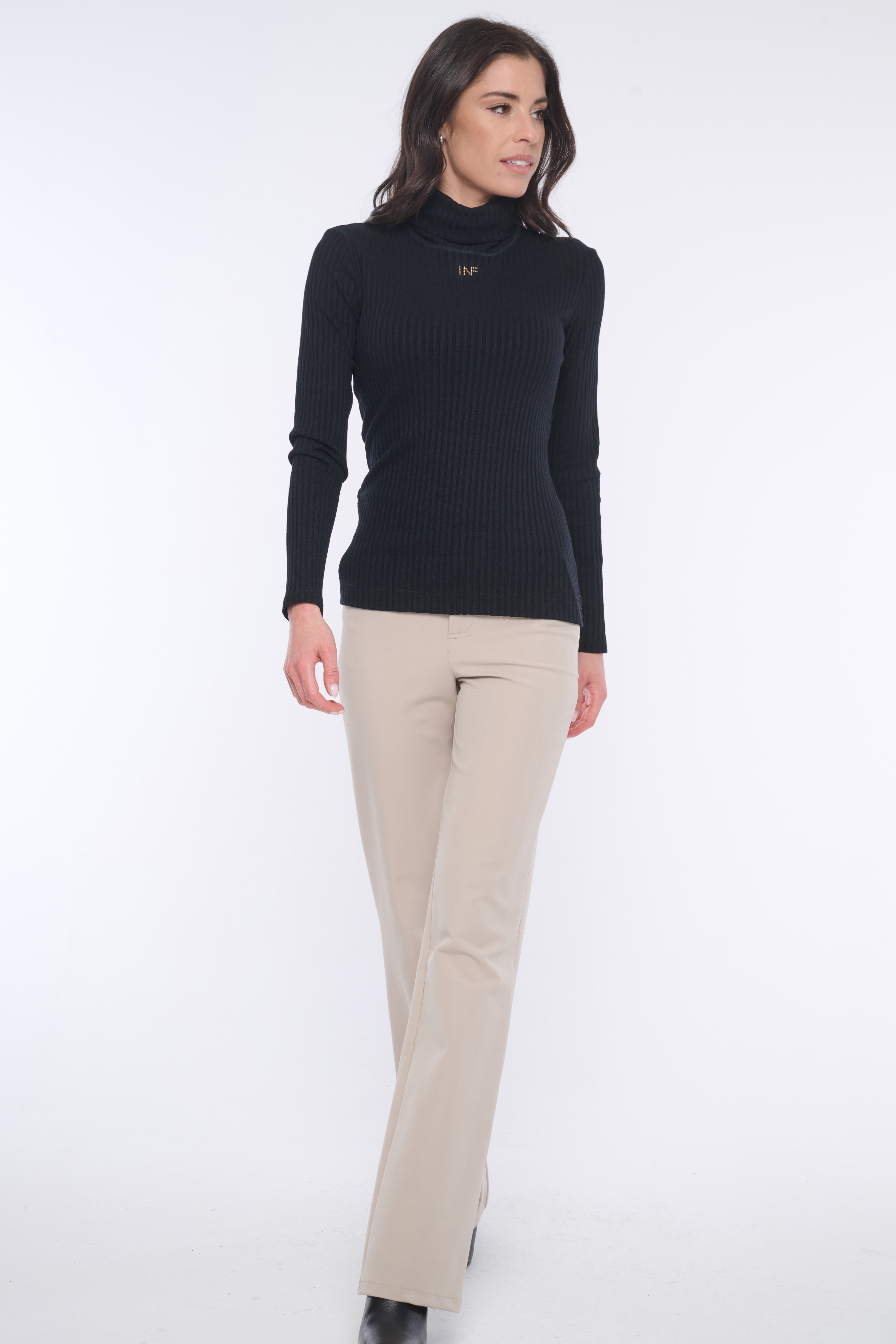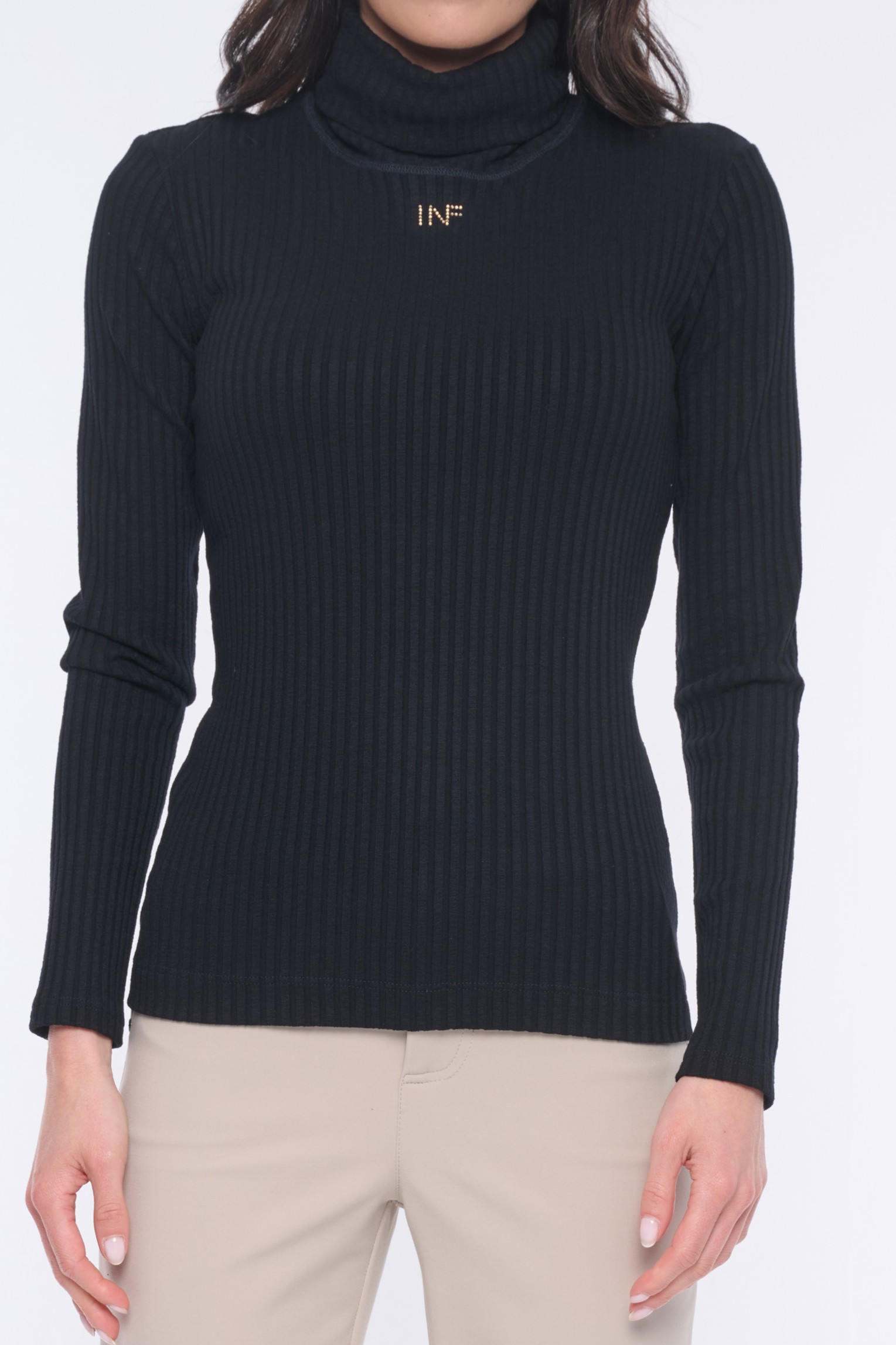Rolák s dlouhým rukávem z úpletového "rib" úpletu. Na předním díle minimalistické logo INF ze zlatých krystalů Preciosa.