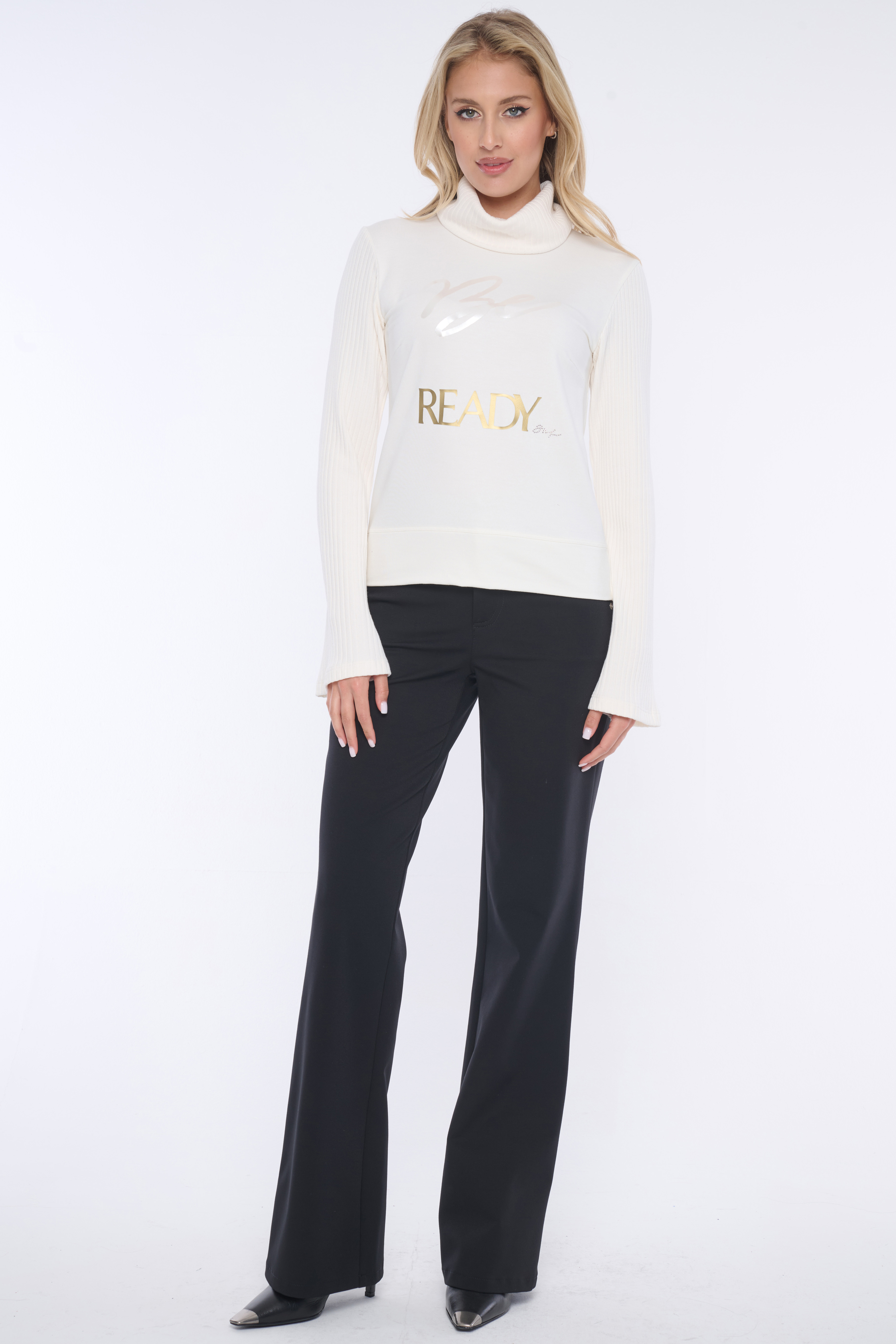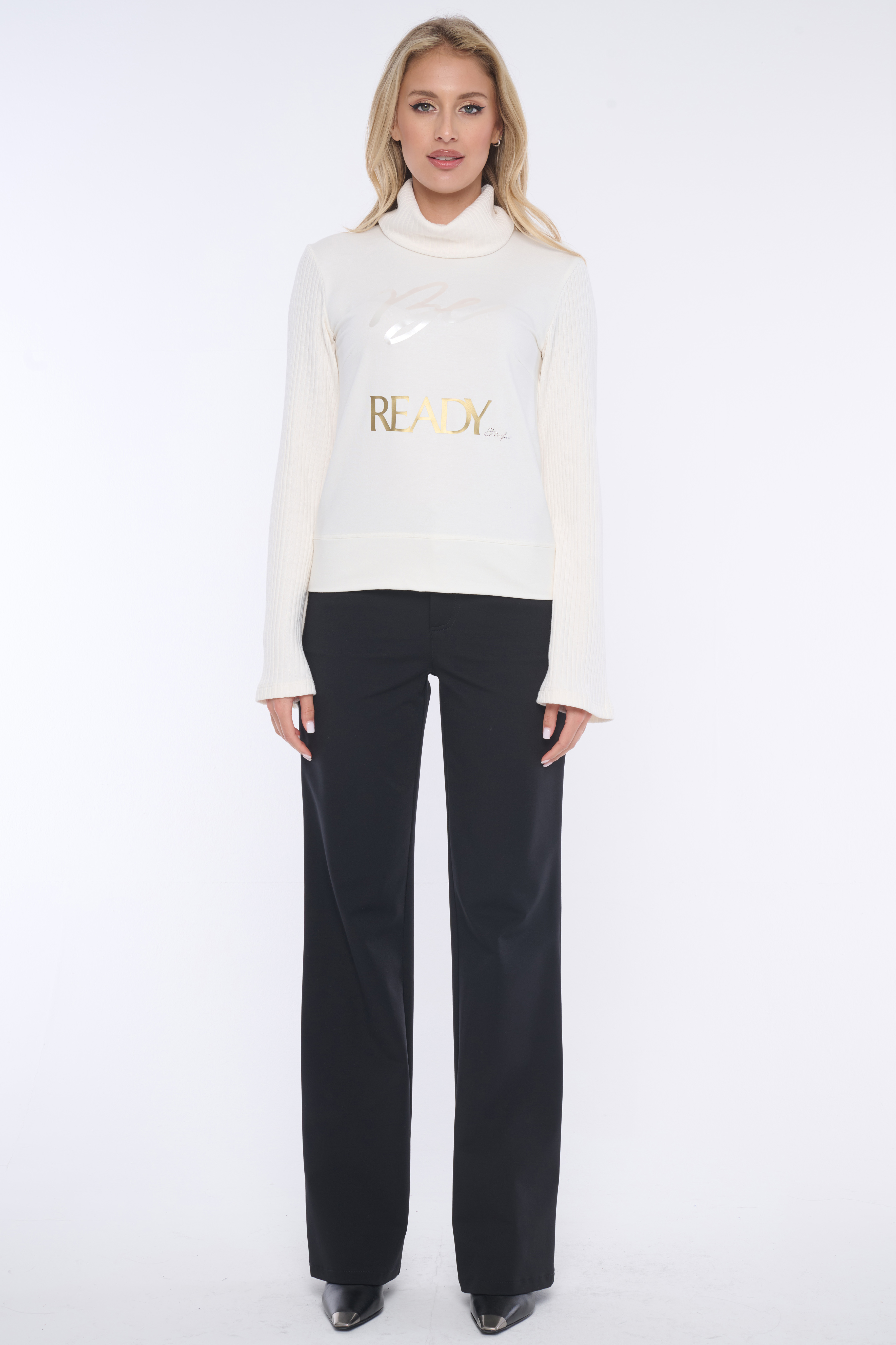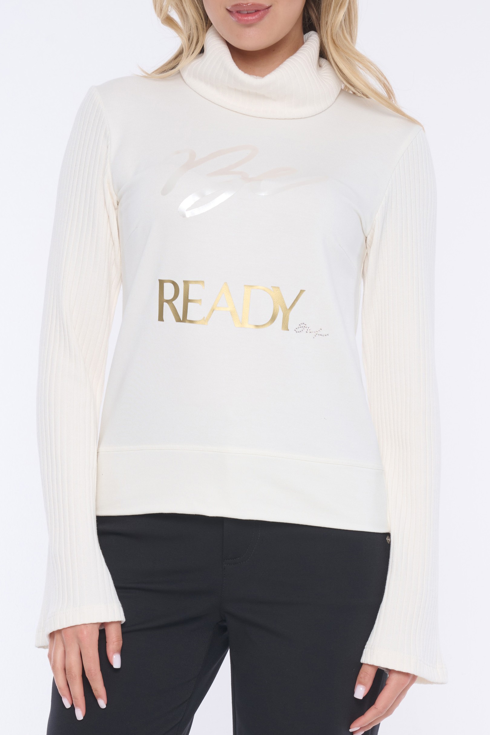 Rolák s dlouhým rukávem. Kombinace s "rib" úpletem. Na předním díle aplikace - výšivka "Be ready" a minimalistické logo INF z krystalů Swarovski.