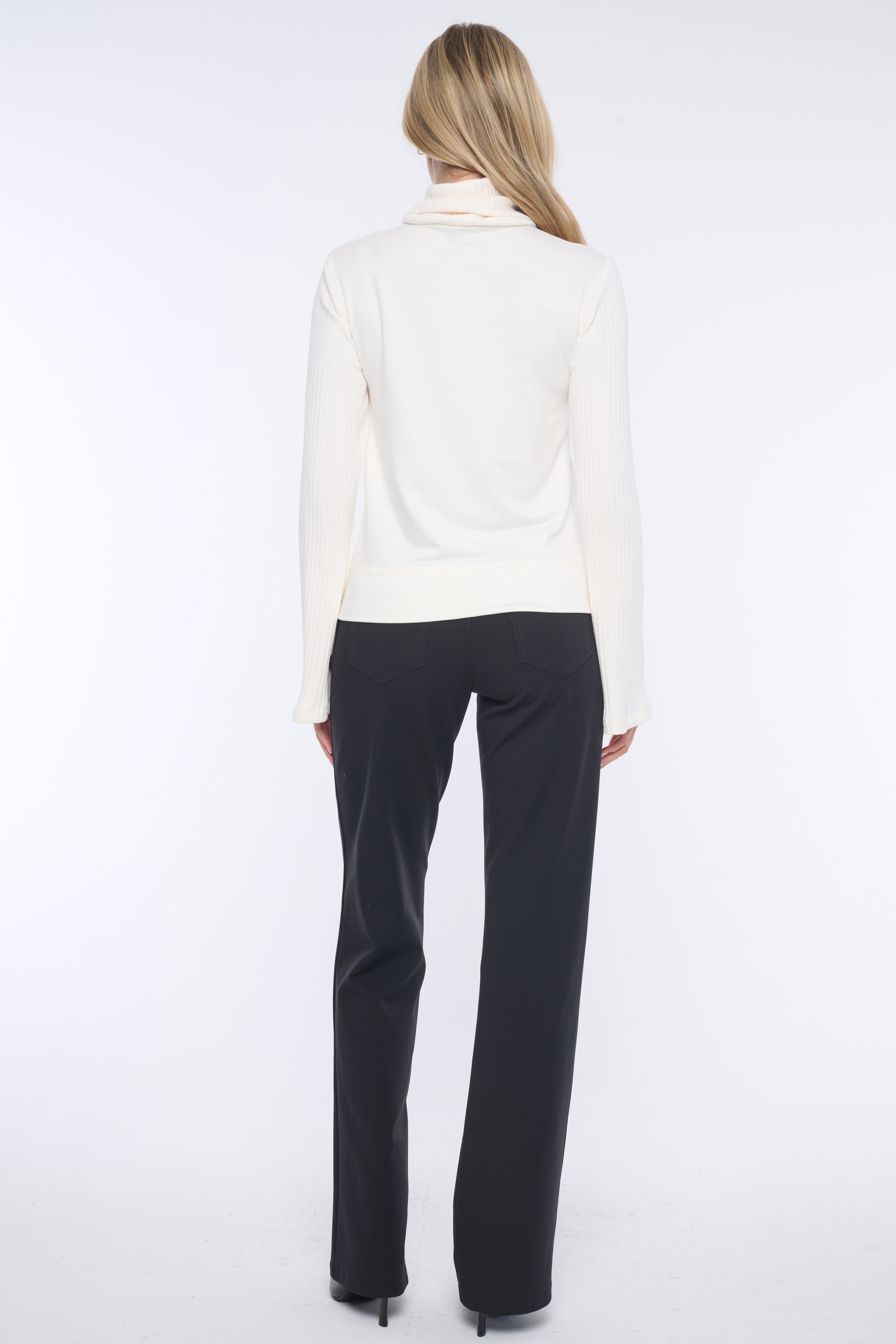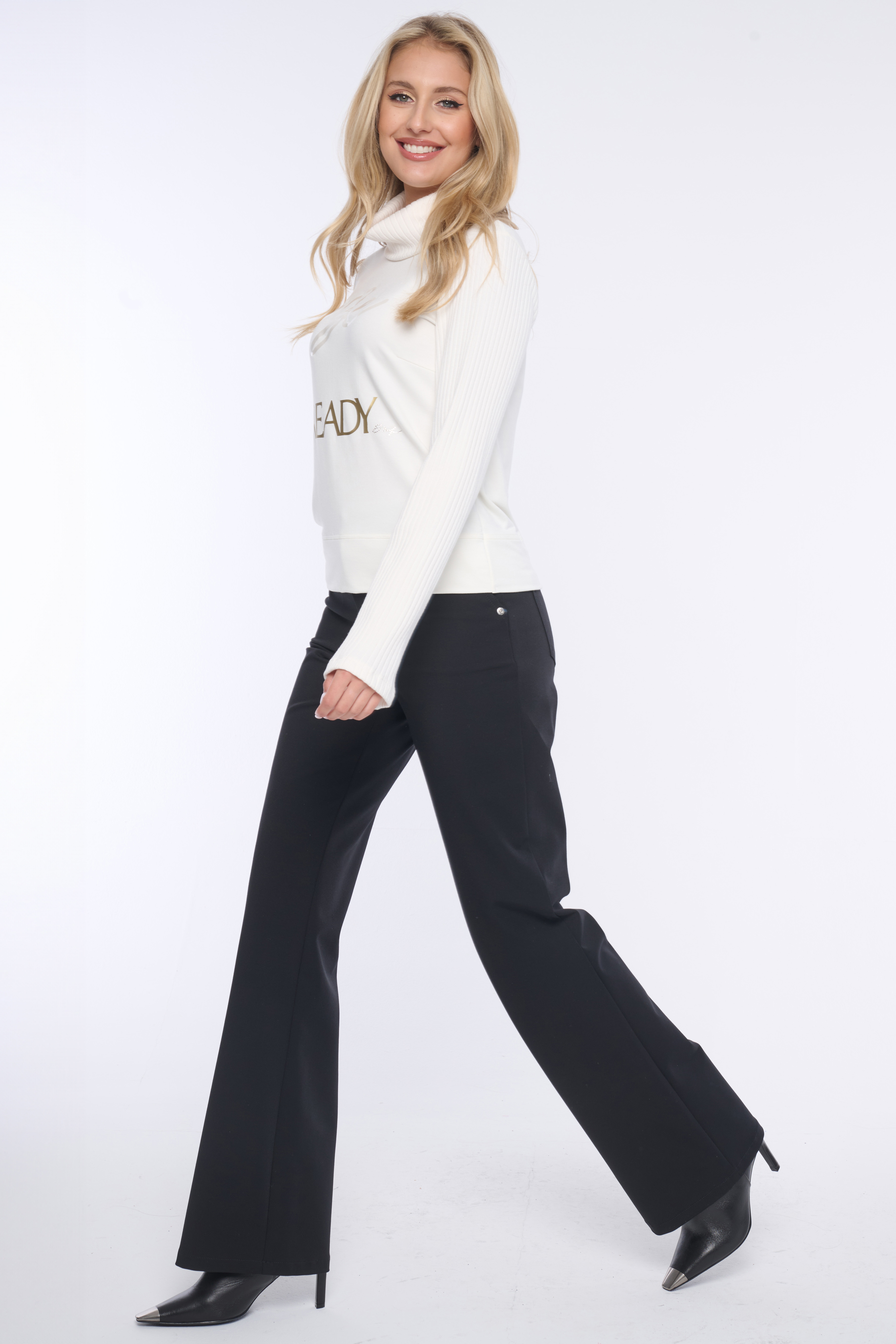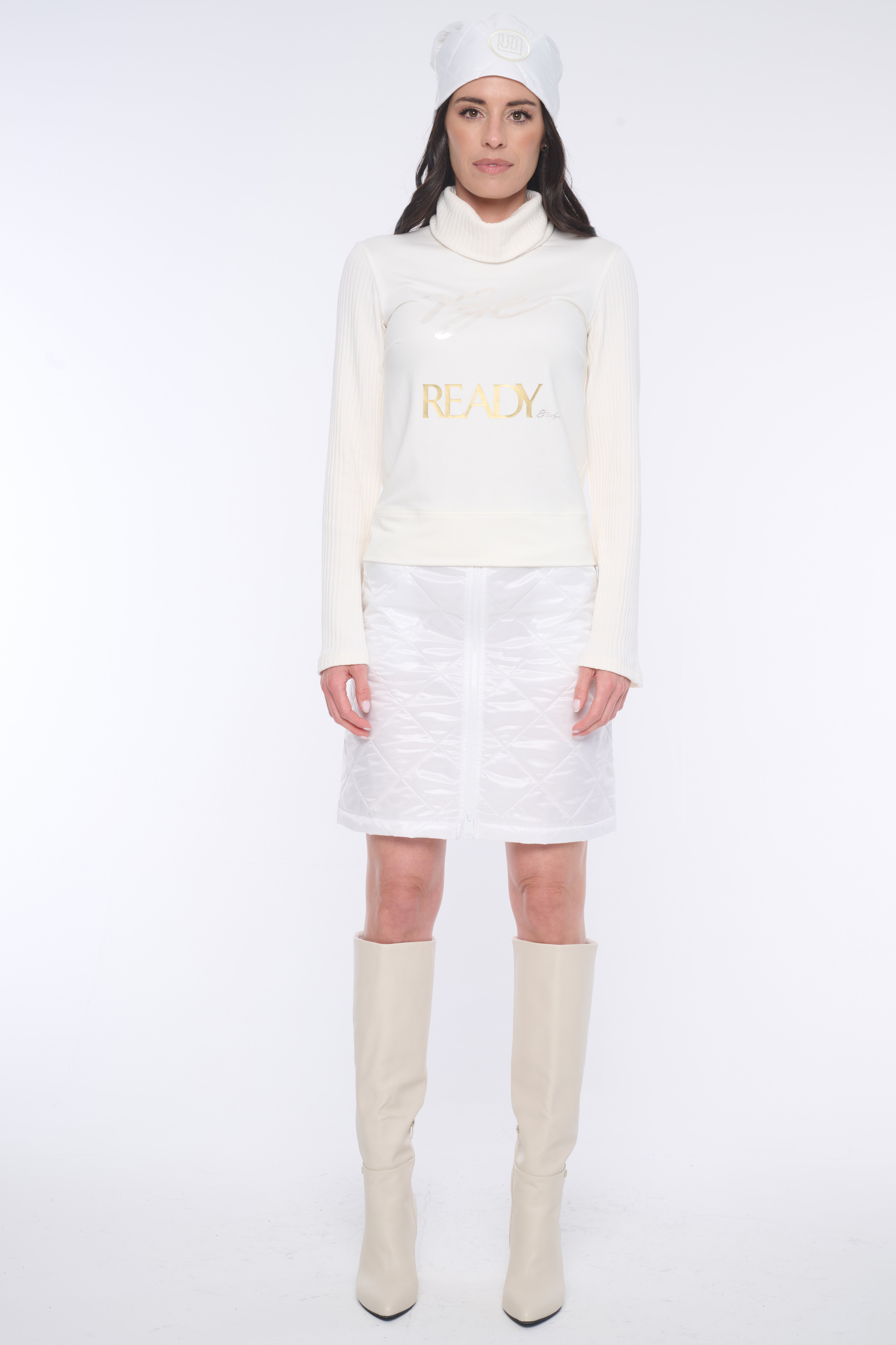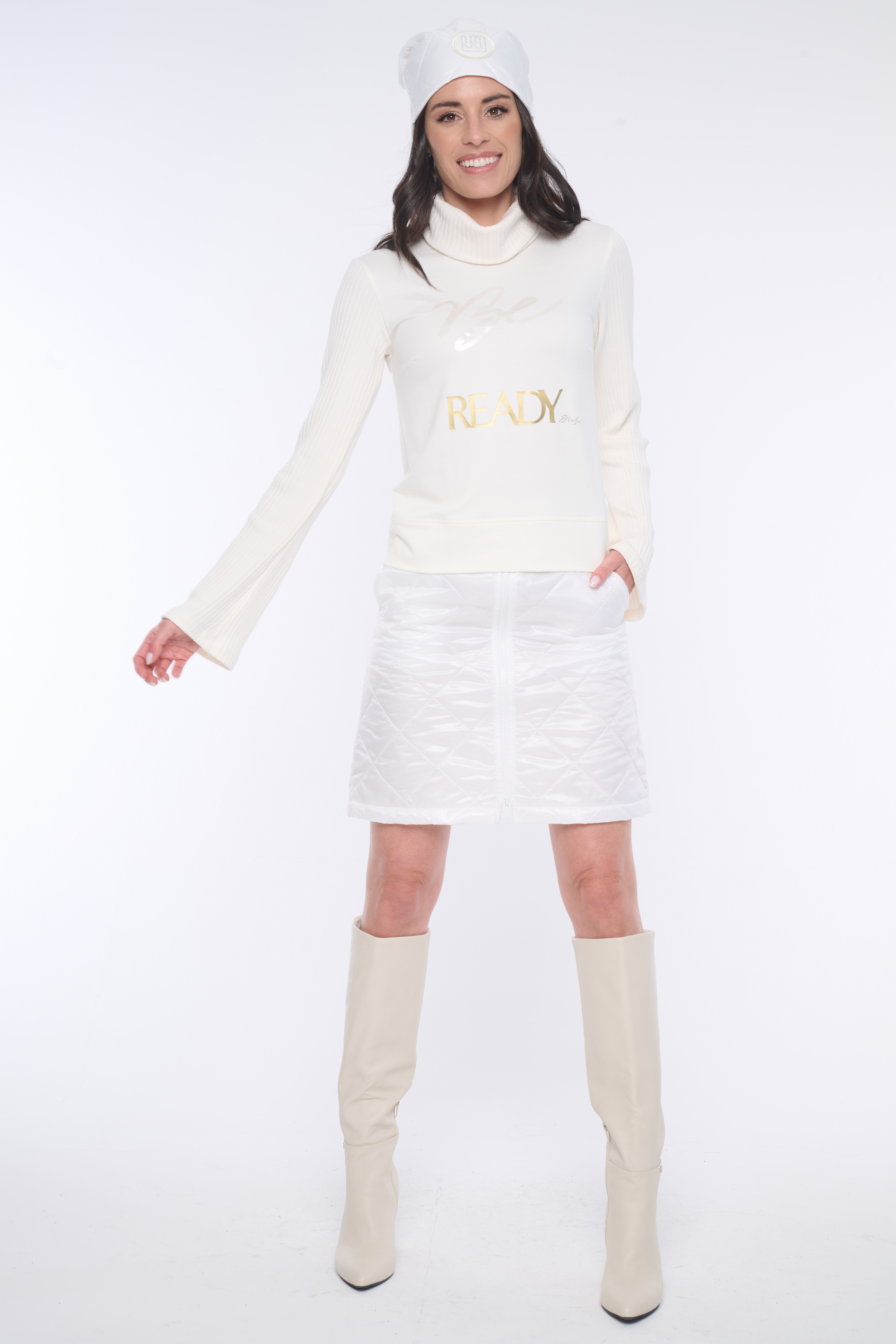 Rolák s dlouhým rukávem. Kombinace s "rib" úpletem. Na předním díle aplikace - výšivka "Be ready" a minimalistické logo INF z krystalů Swarovski.