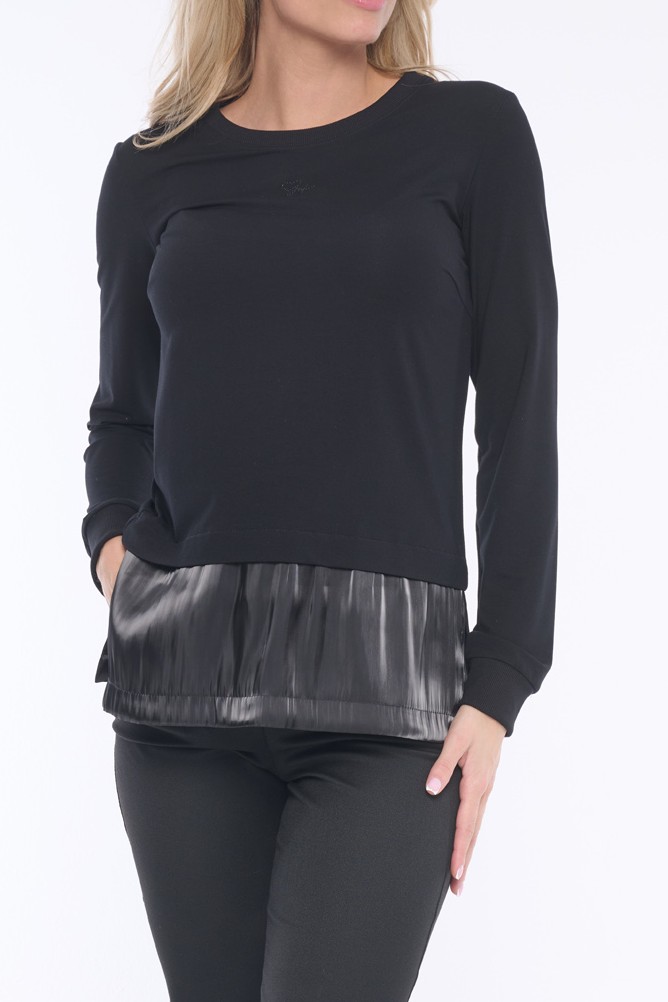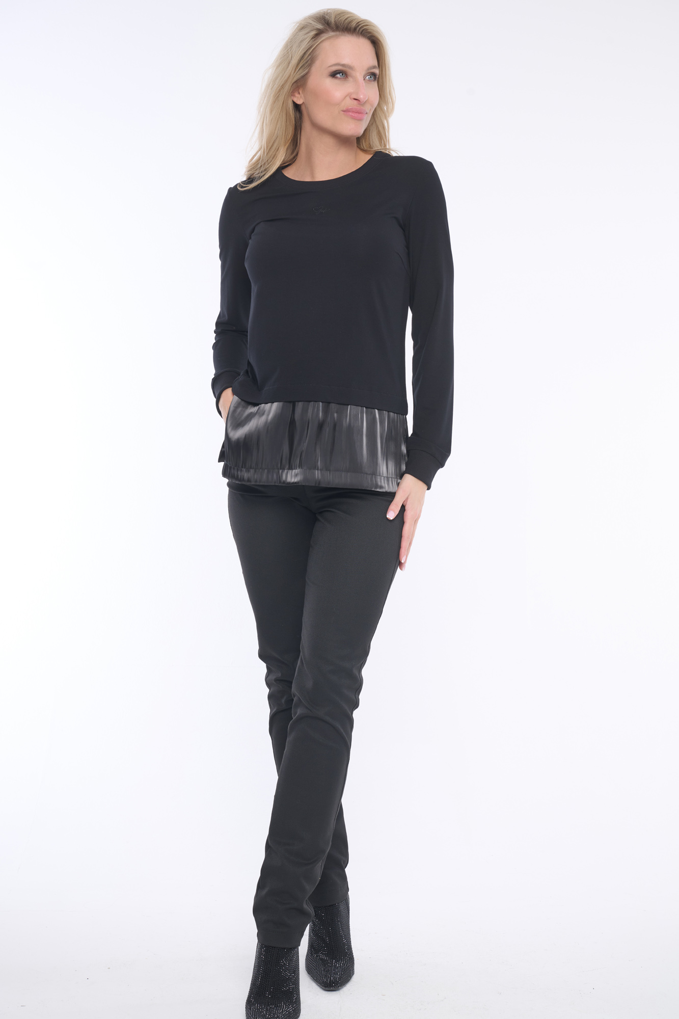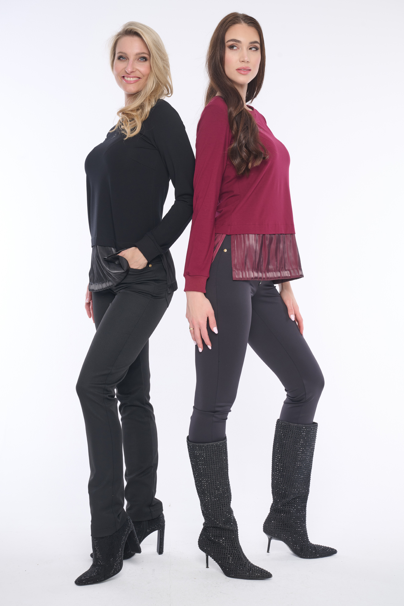 Volné tričko s detailem luxusní lesklé látky a rozparky po stranách, doplněné jemnými krystaly Preciosa. Dostupné ve dvou barevných variantách.