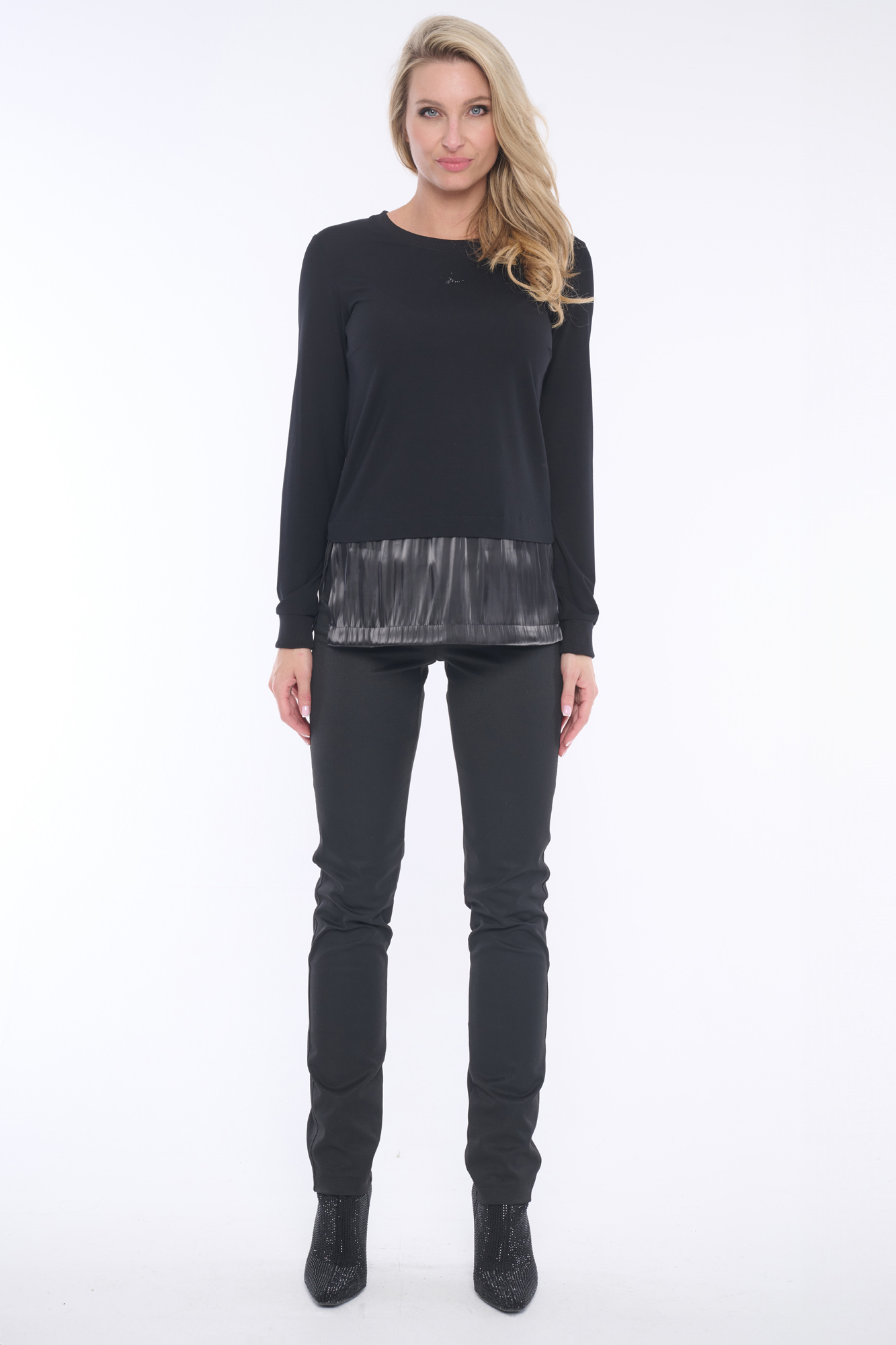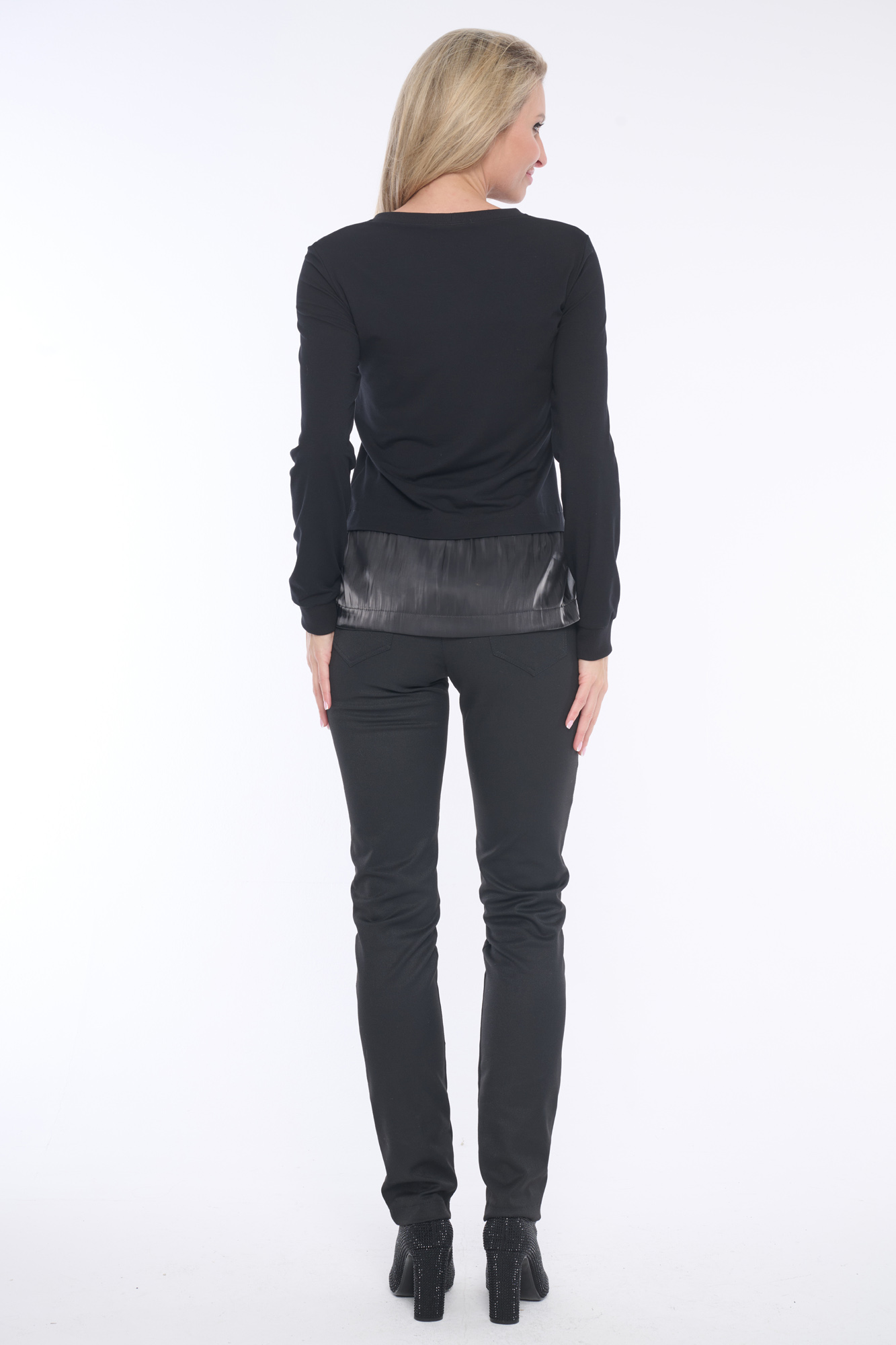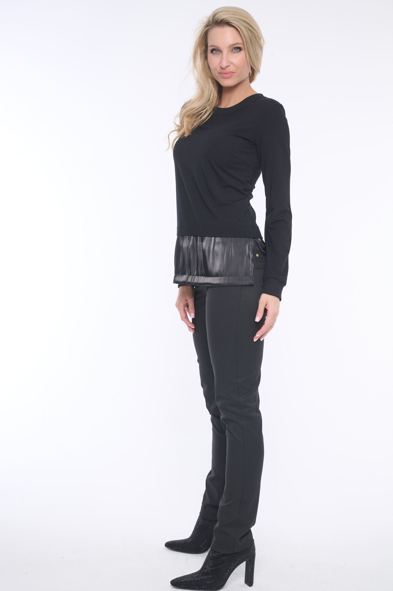 Volné tričko s detailem luxusní lesklé látky a rozparky po stranách, doplněné jemnými krystaly Preciosa. Dostupné ve dvou barevných variantách.