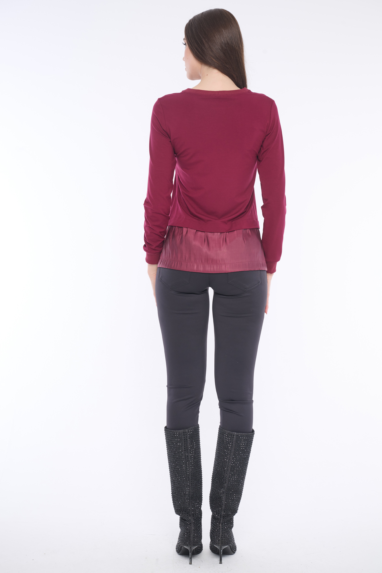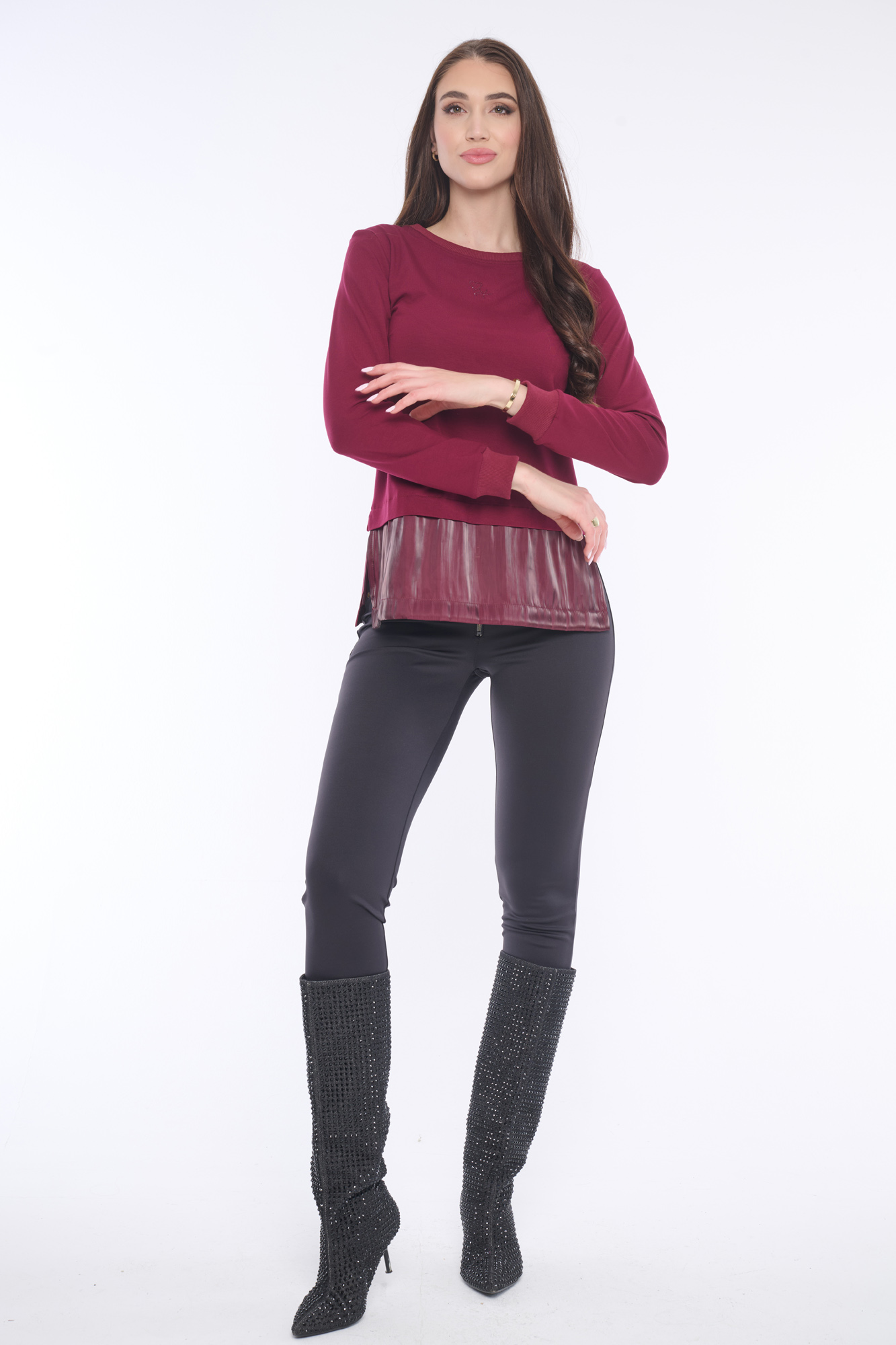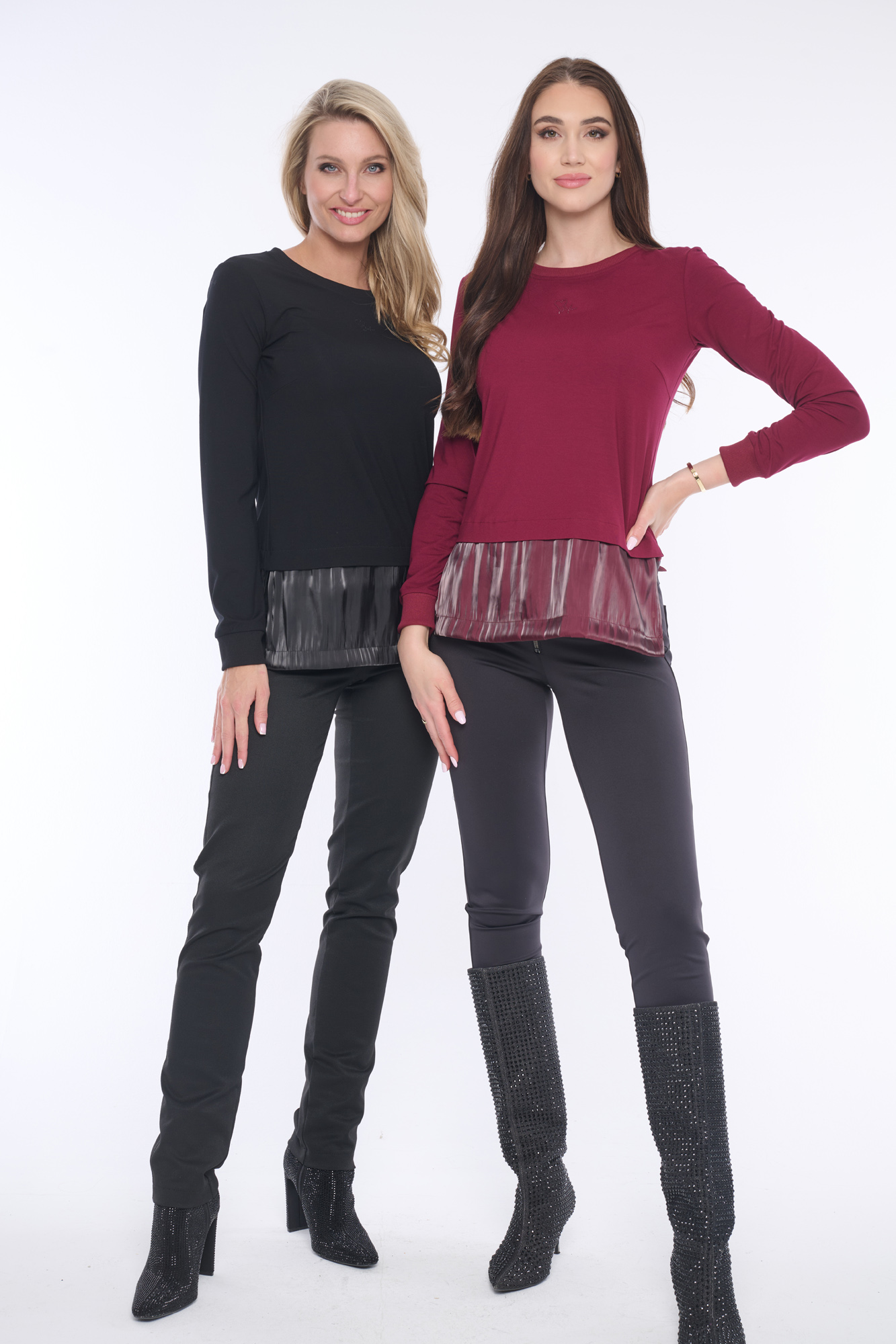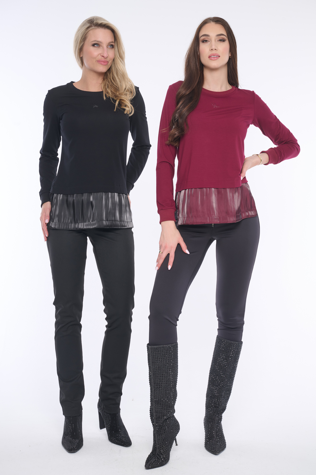 Volné tričko s detailem luxusní lesklé látky a rozparky po stranách, doplněné jemnými krystaly Preciosa. Dostupné ve dvou barevných variantách.