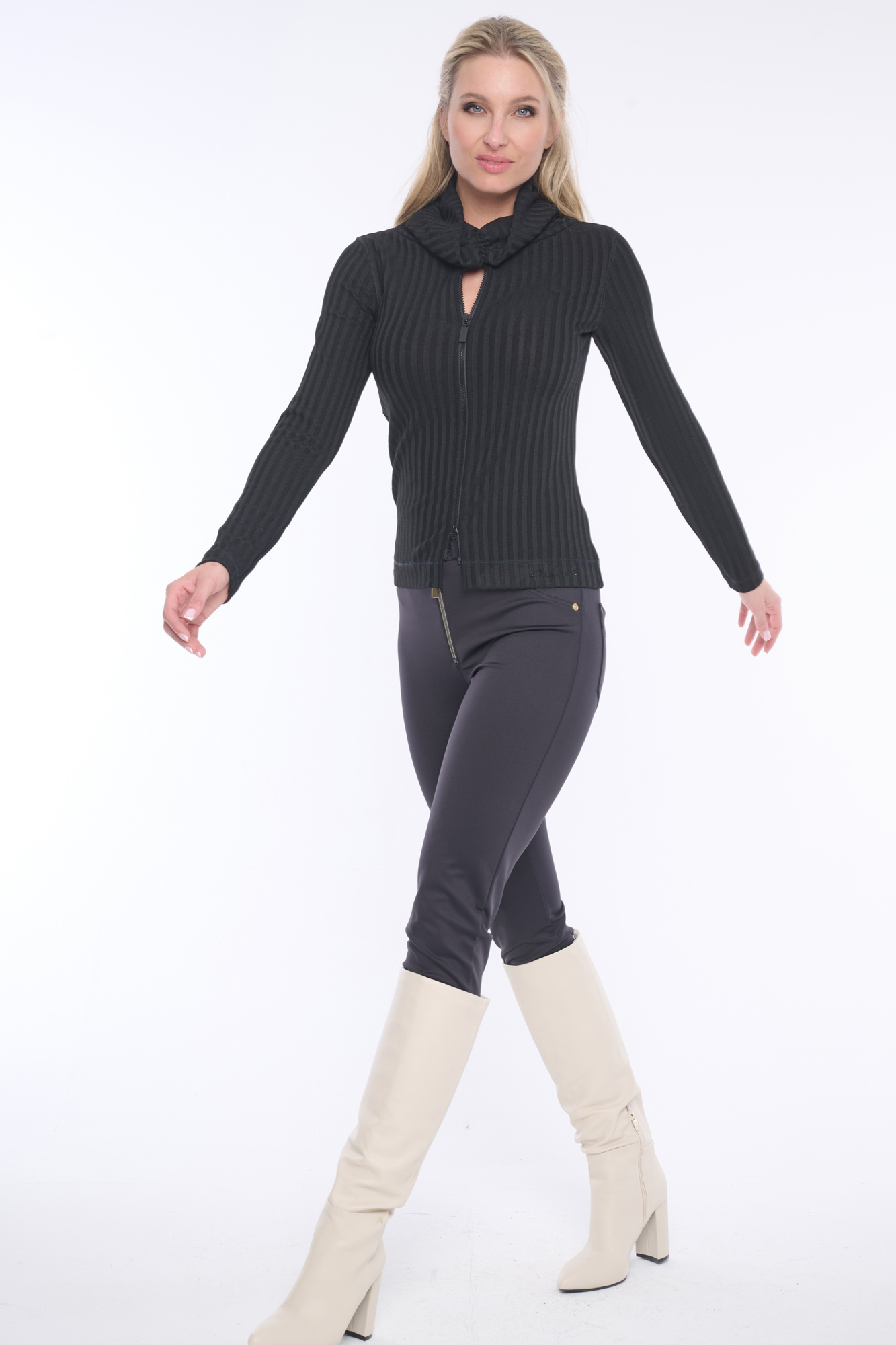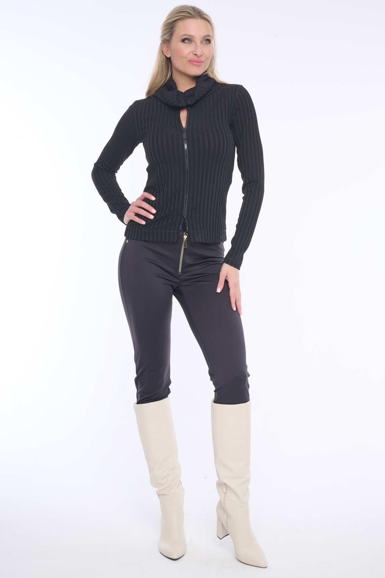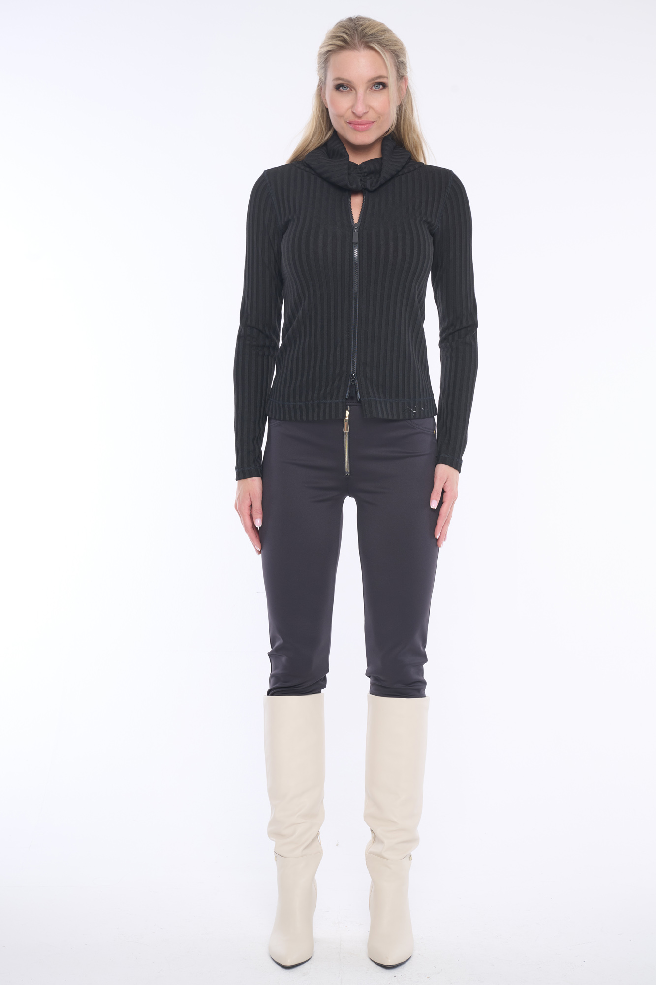 Přiléhavý rolák ze silného žebra s výrazným zipem doplněn jemnými krystaly Preciosa. Rolák nepadá, je zajímavě vyřešen nabíráním. Dostupný ve dvou barevných variantách.