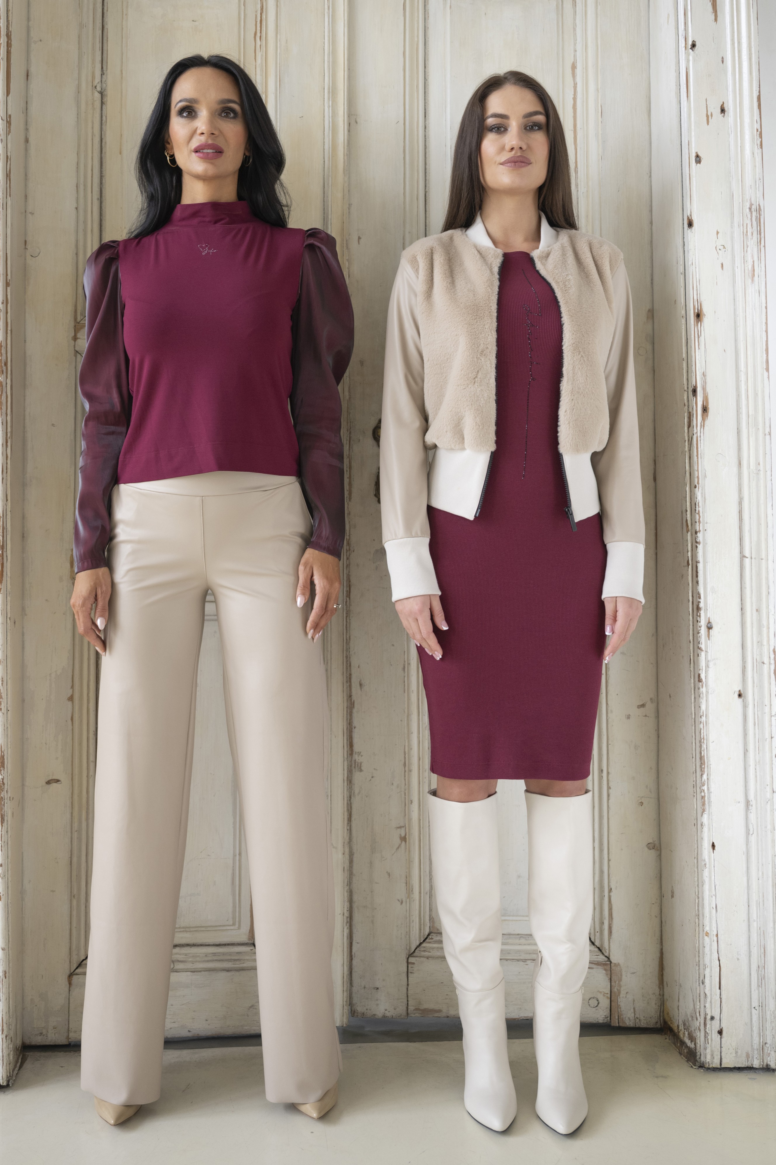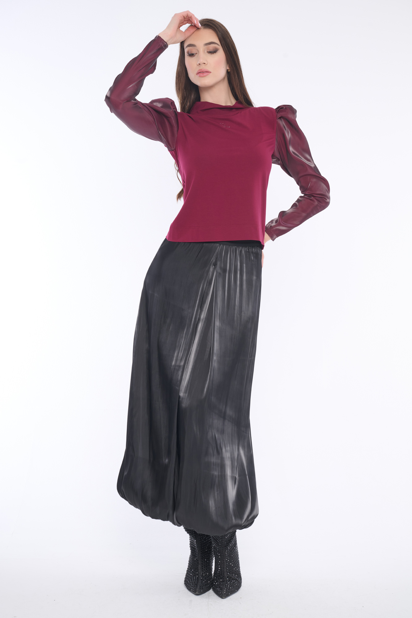 Elegantní tričko se stojáčkem s nabíranými rukávy z luxusní lesklé látky doplněné jemnými krystaly Preciosa. Dostupné ve dvou barevných variantách.