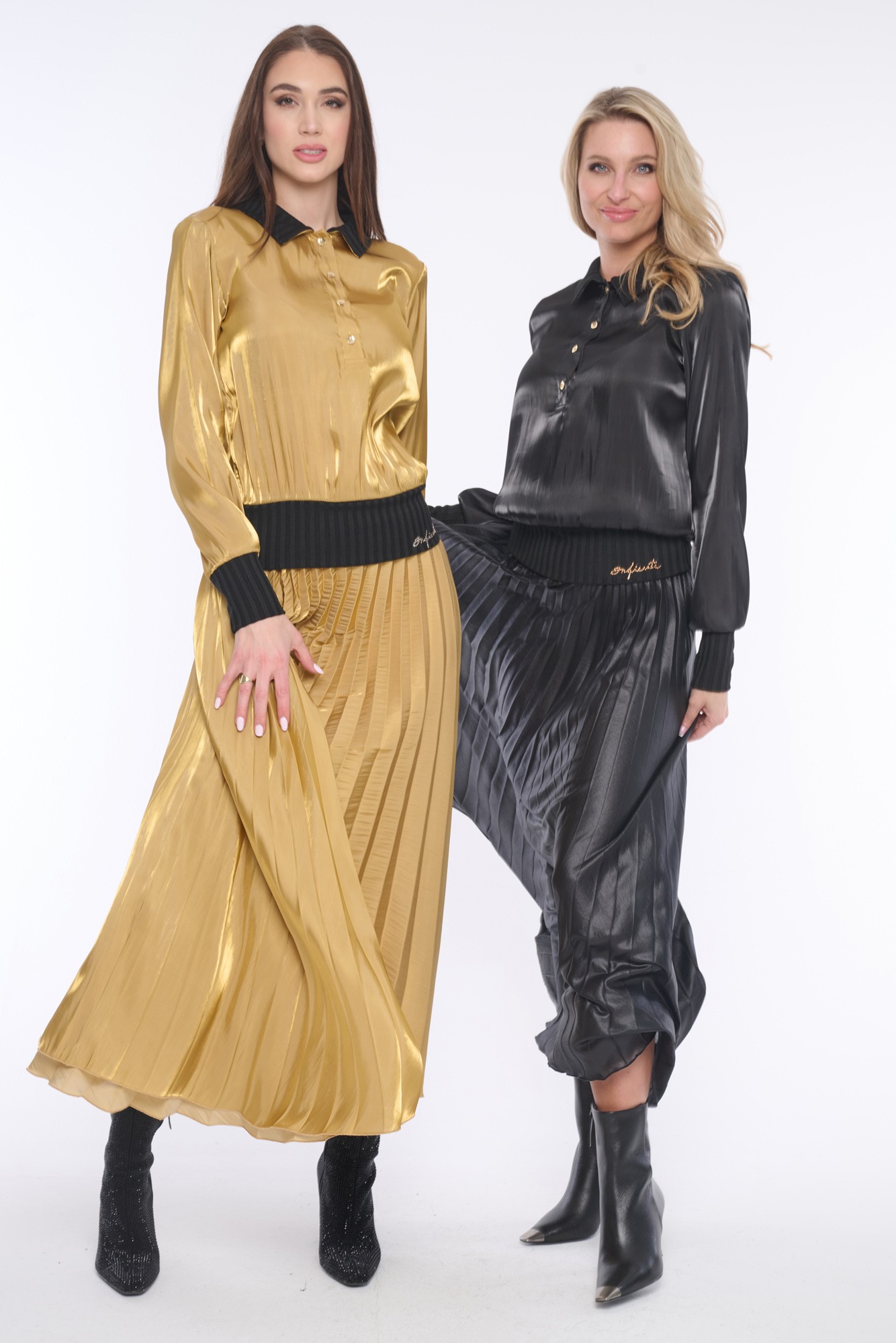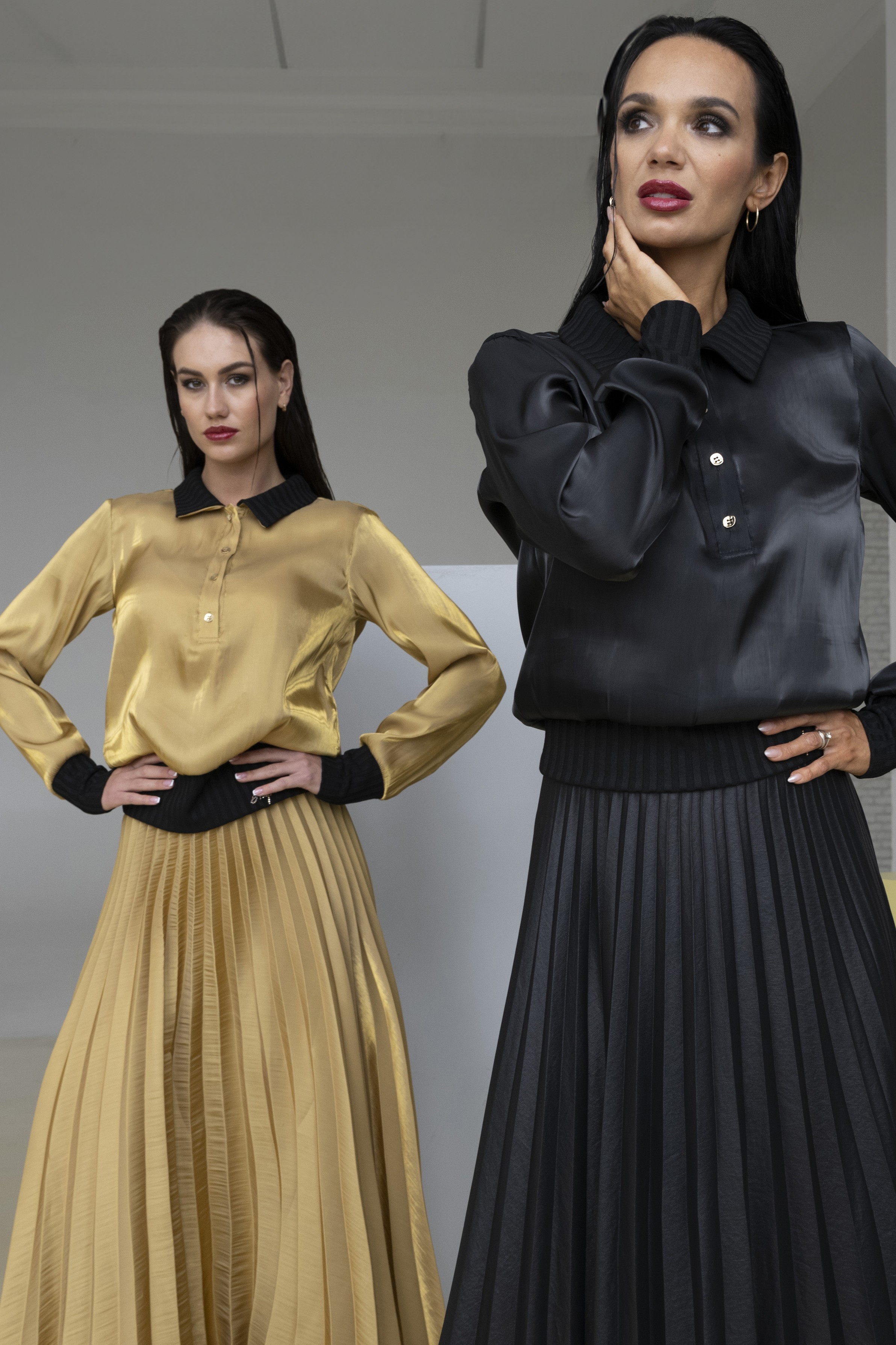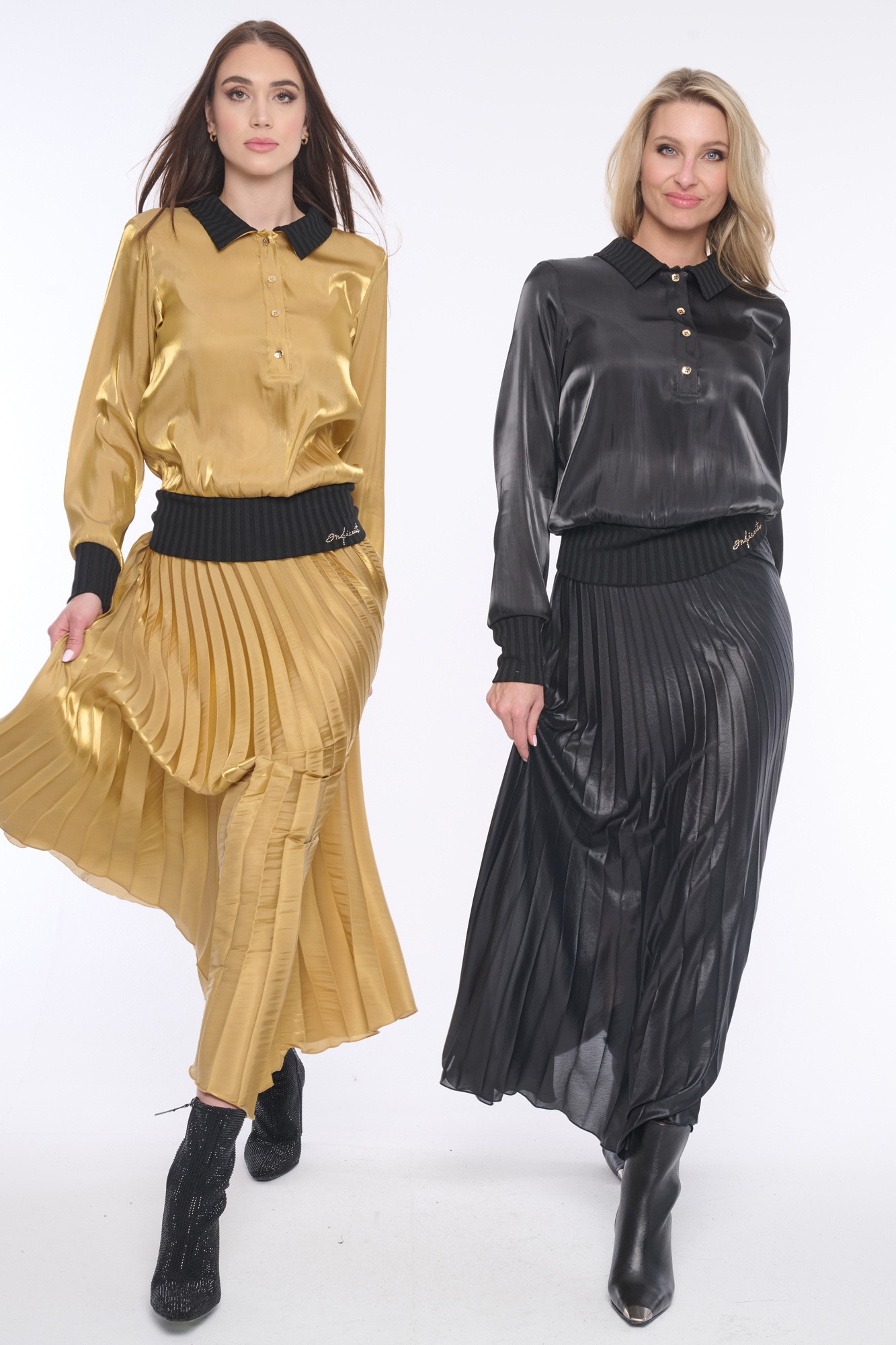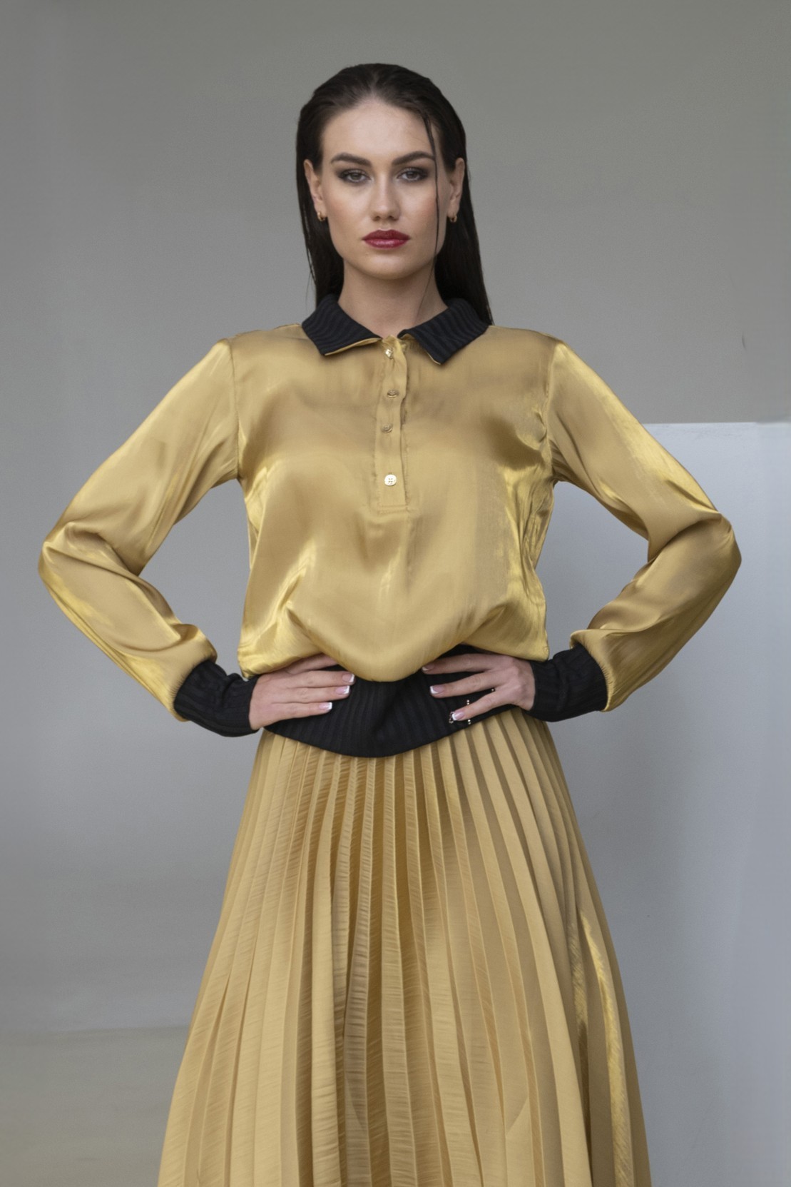 Elegantní lesklá halenka z kombinace materiálů na knoflíčky s límečkem, doplněna jemnými krystaly Preciosa. Její luxusní vzhled zaujme každého. Dostupná ve dvou barevných variantách.