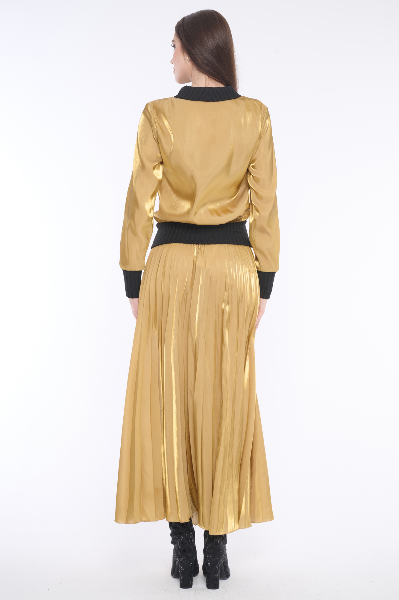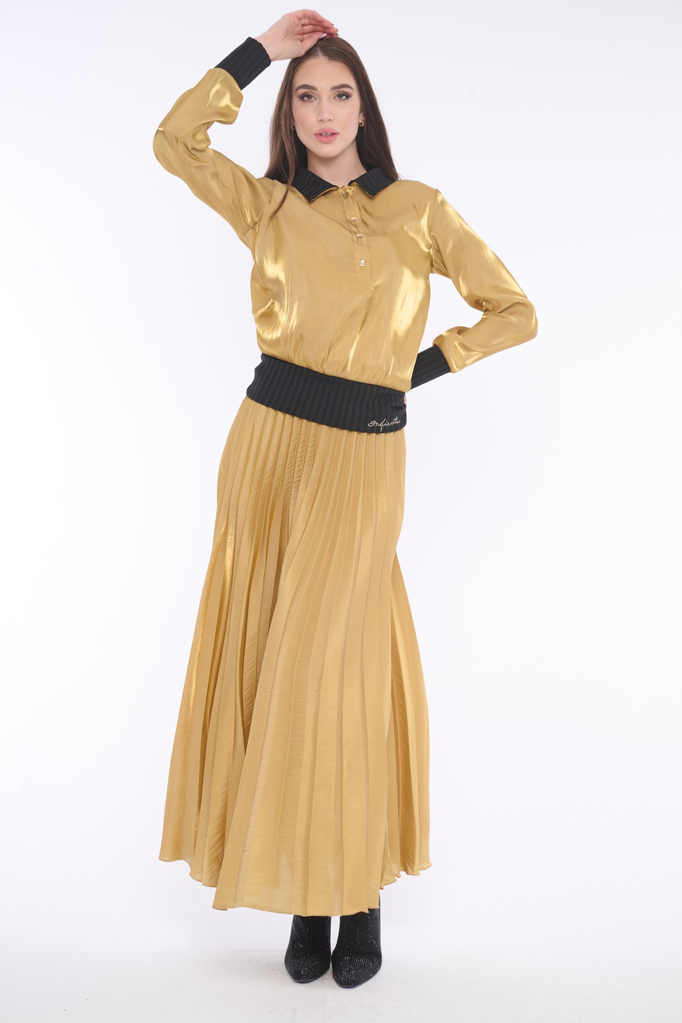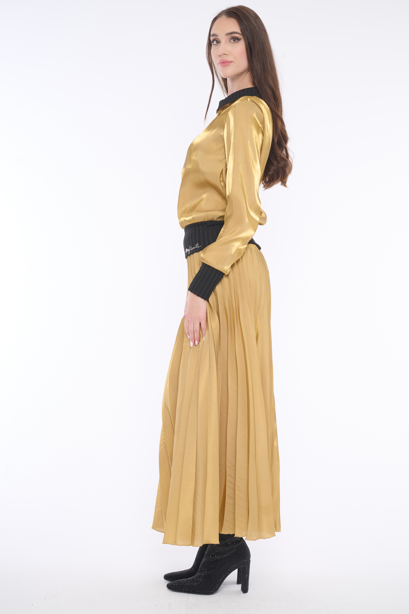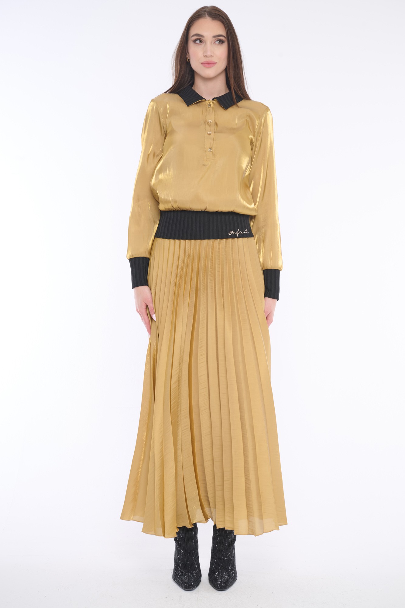 Elegantní lesklá halenka z kombinace materiálů na knoflíčky s límečkem, doplněna jemnými krystaly Preciosa. Její luxusní vzhled zaujme každého. Dostupná ve dvou barevných variantách.