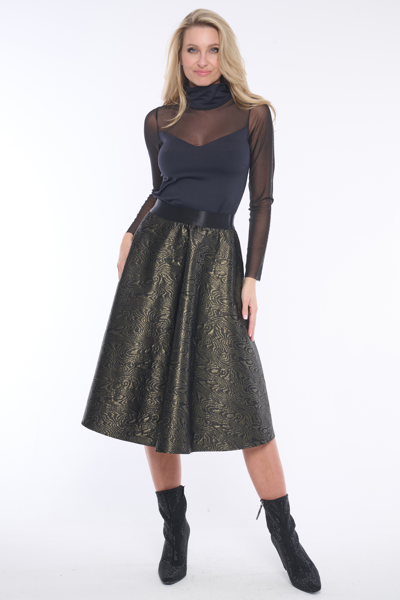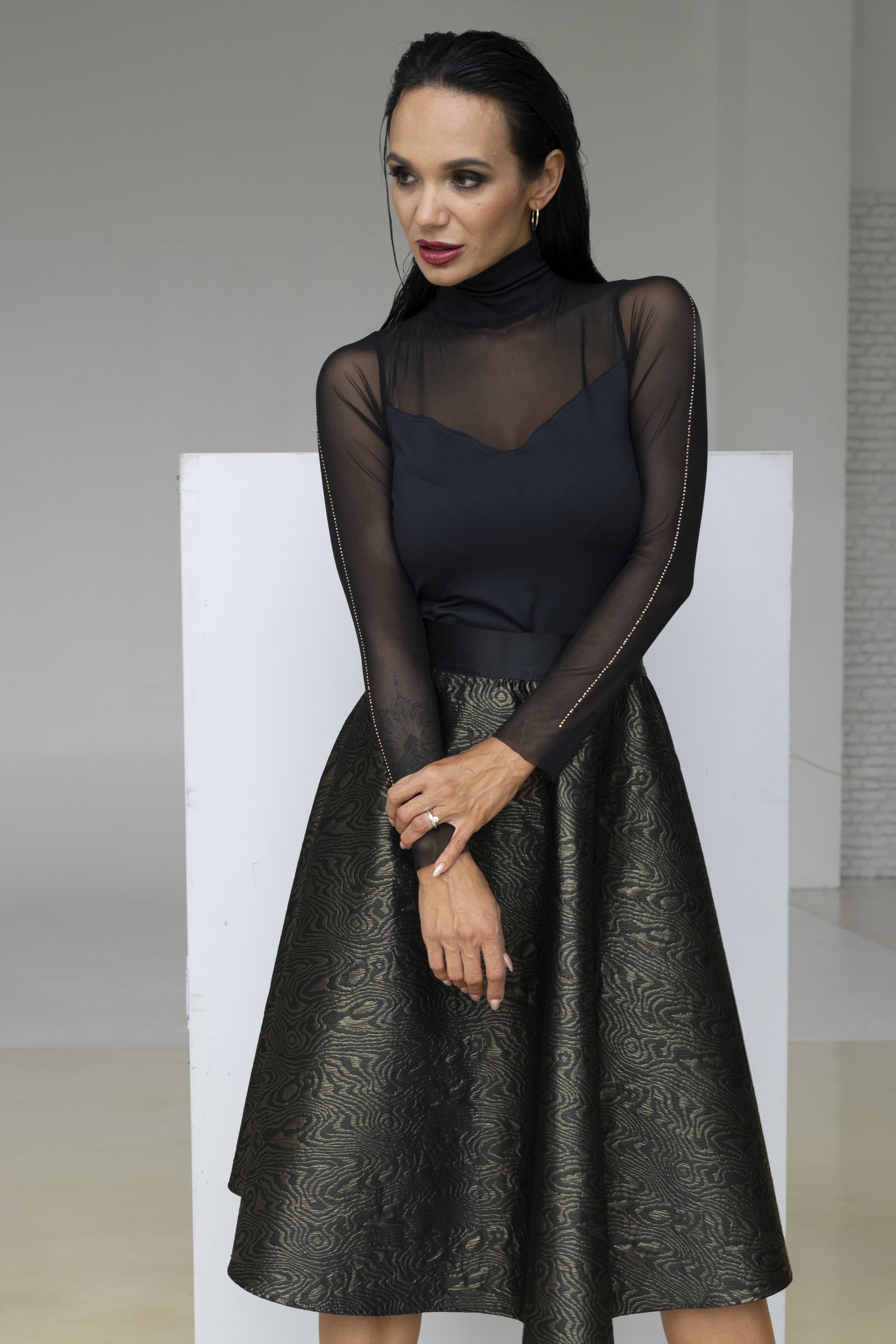 Luxusní tričko z kombinace polyamidového materiálu a tylu doplněný krystaly Preciosa po celé délce rukávů.