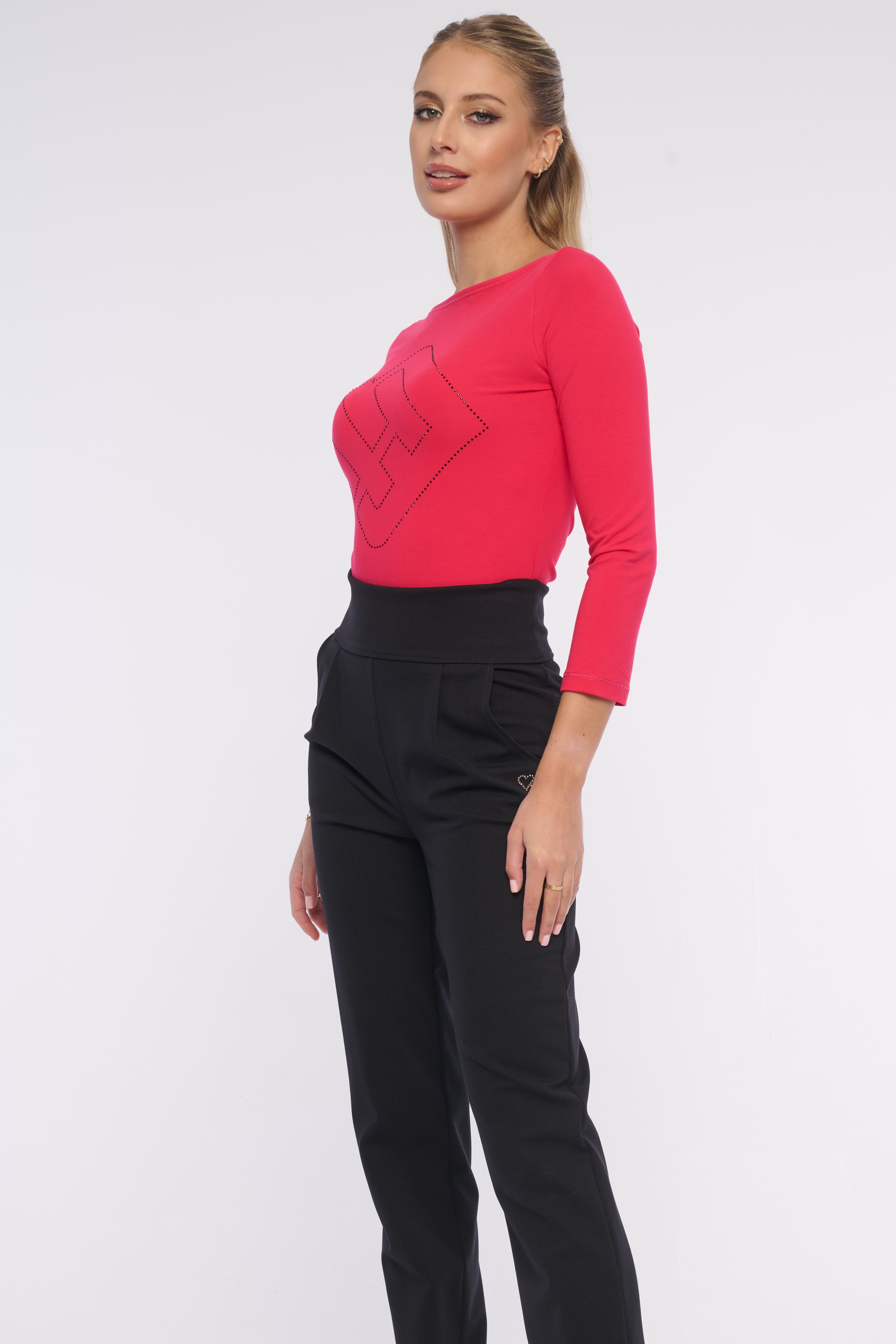 Triko se slušivým lodicovým výstřihem, tříčtvrteční rukávy a velké logo z luxusních krystalů Preciosa. Jednoduchý, avšak efektní kousek, který by neměl chybět v žádném šatníku. Dostupný ve třech barevných variantách.