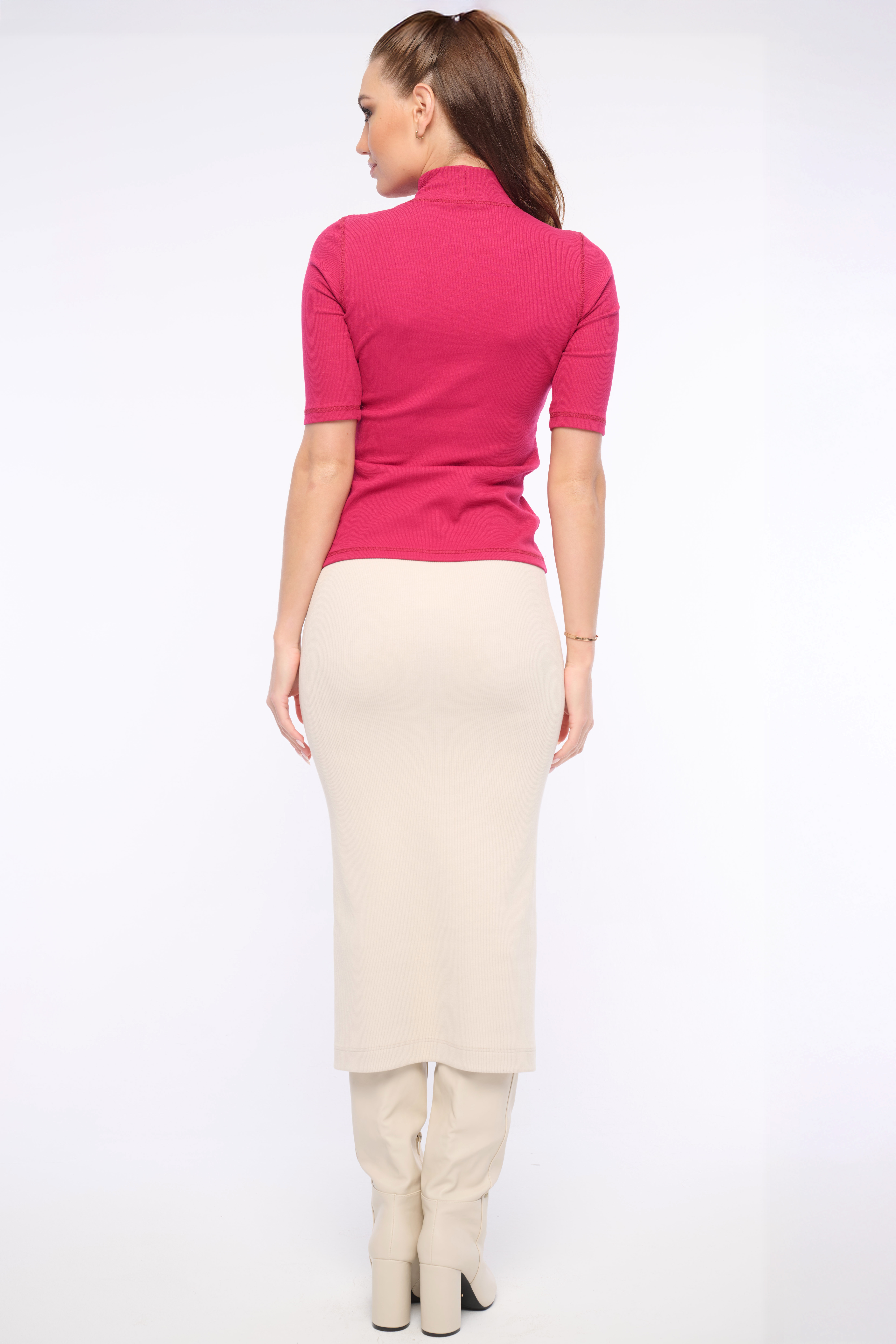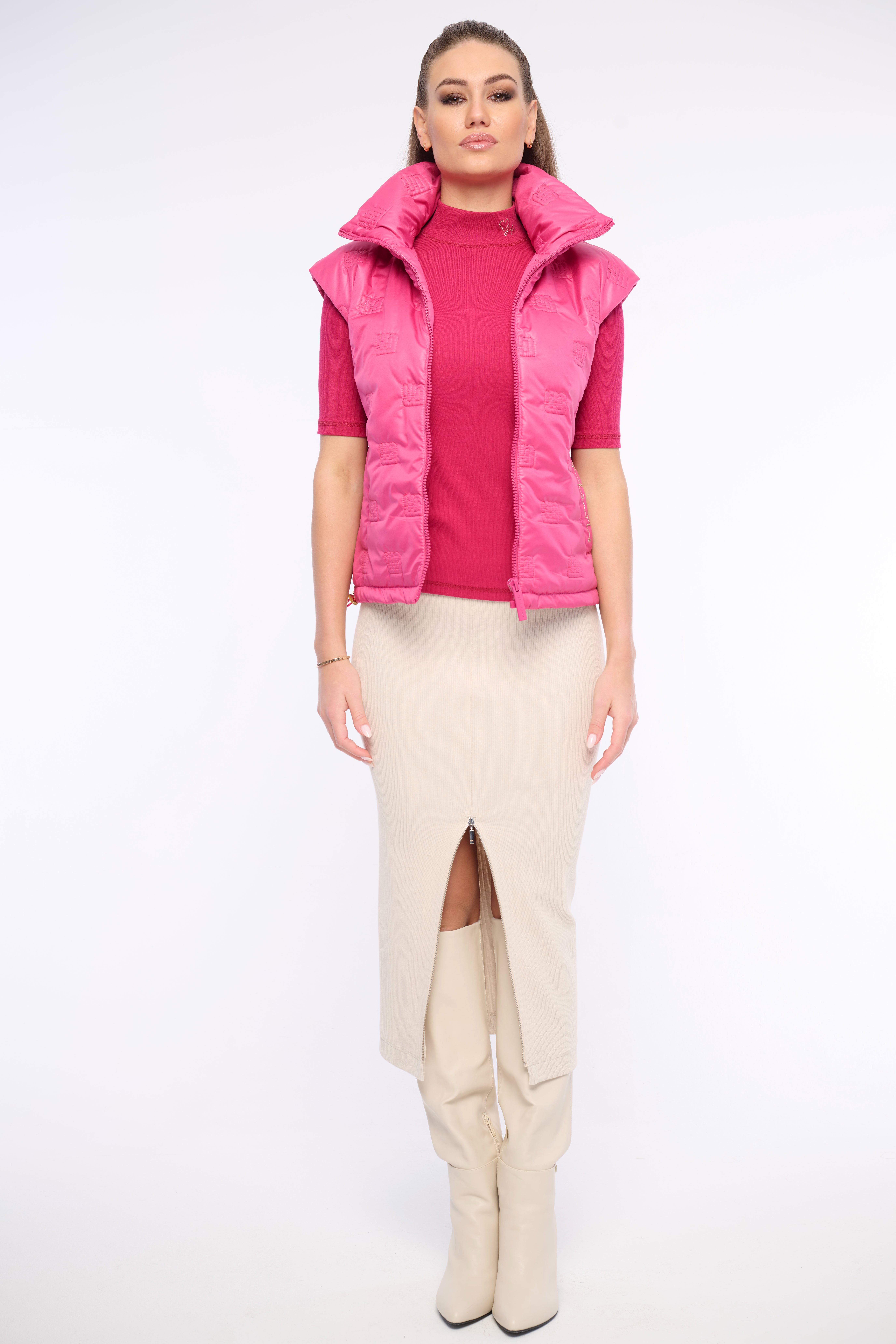 Přiléhavé triko s krátkým rukávem ze žebrového materiálu se stojáčkem doplněný logem z luxusních krystalů Preciosa. Dostupný ve čtyřech barevných variantách.