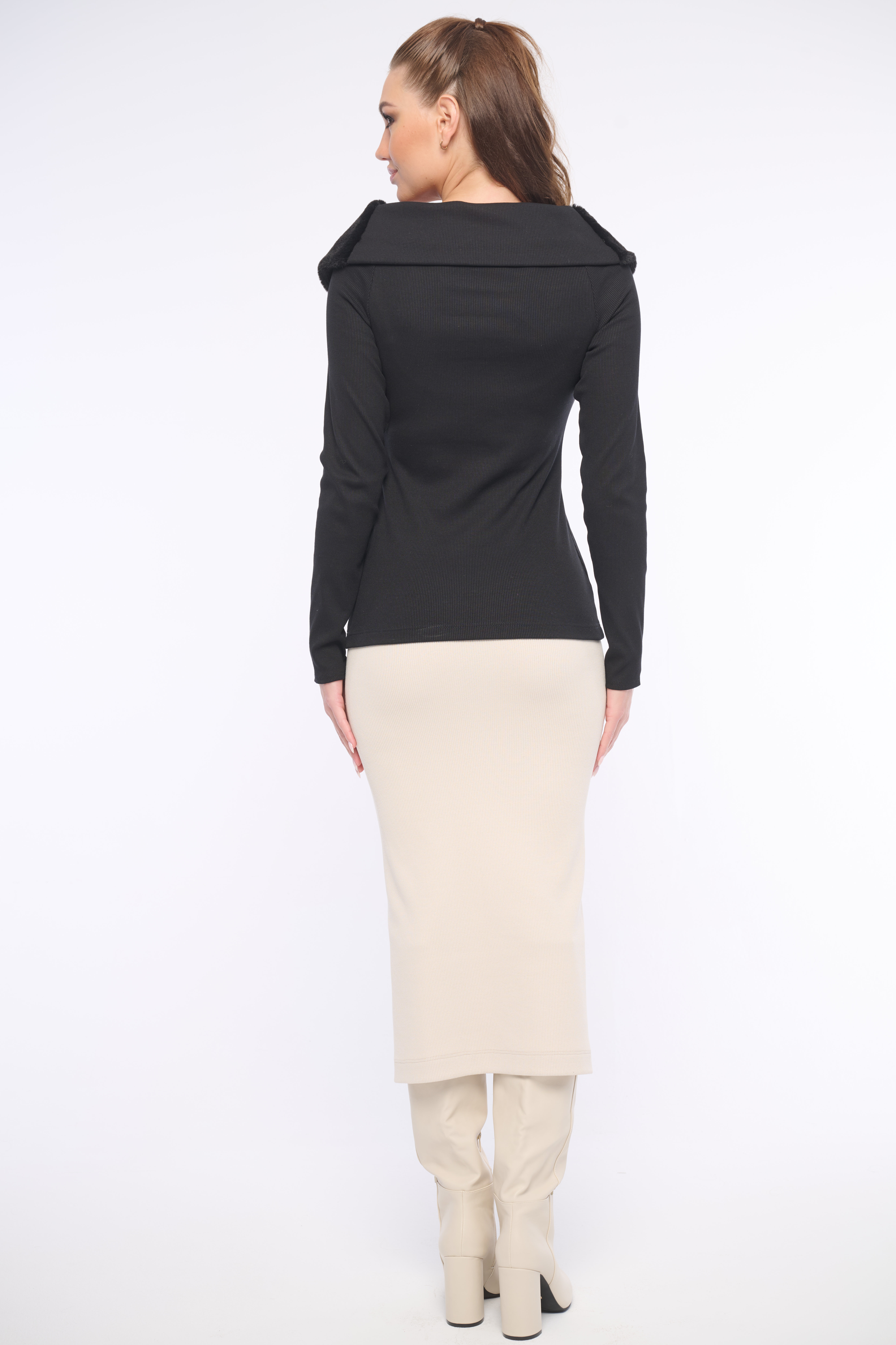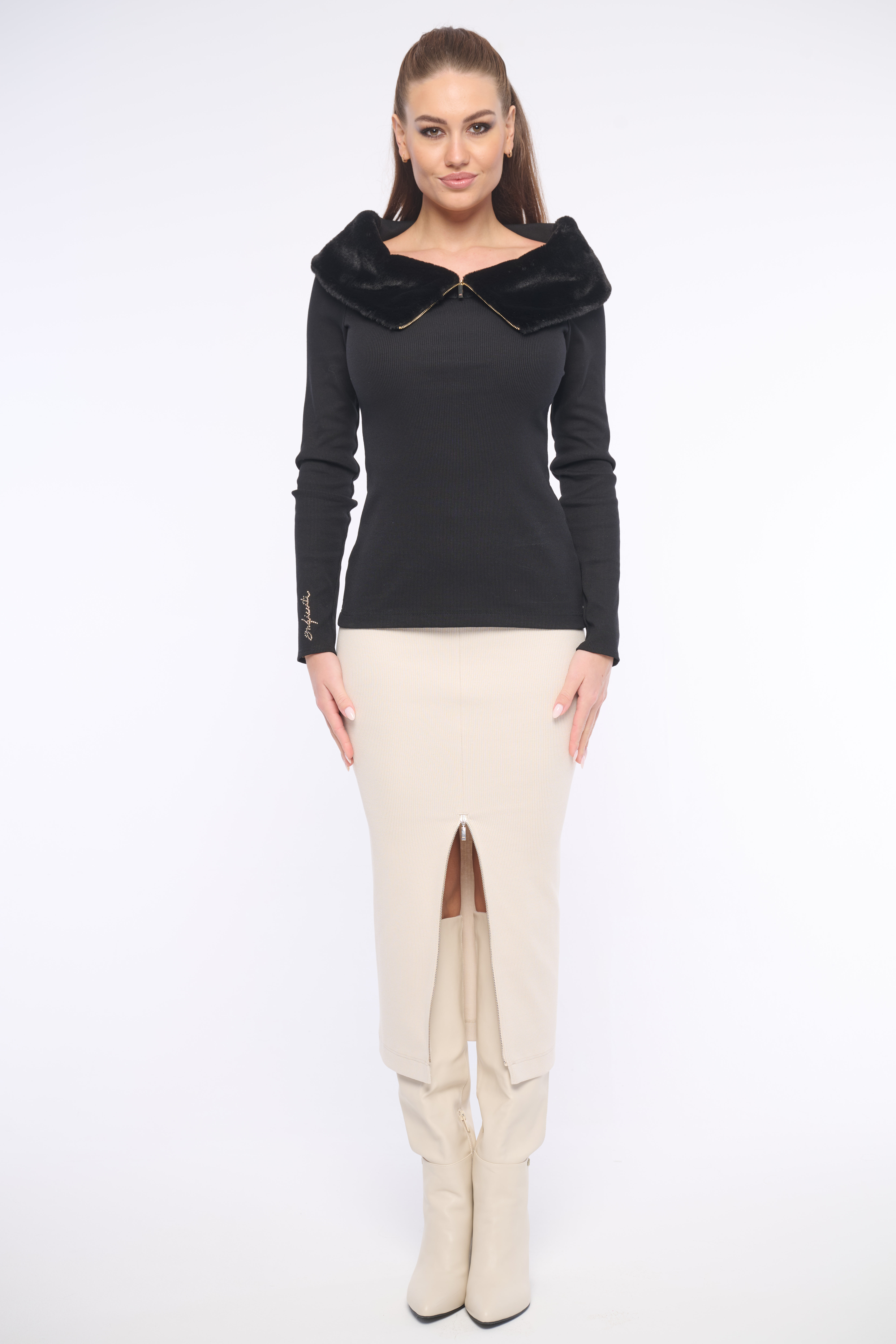 Zajímavé triko s kožešinovým límečkem na zip z příjemného žebrového materiálu. Detailem je logo z luxusních krystalů Preciosa. Dostupné ve dvou barevných variantách.