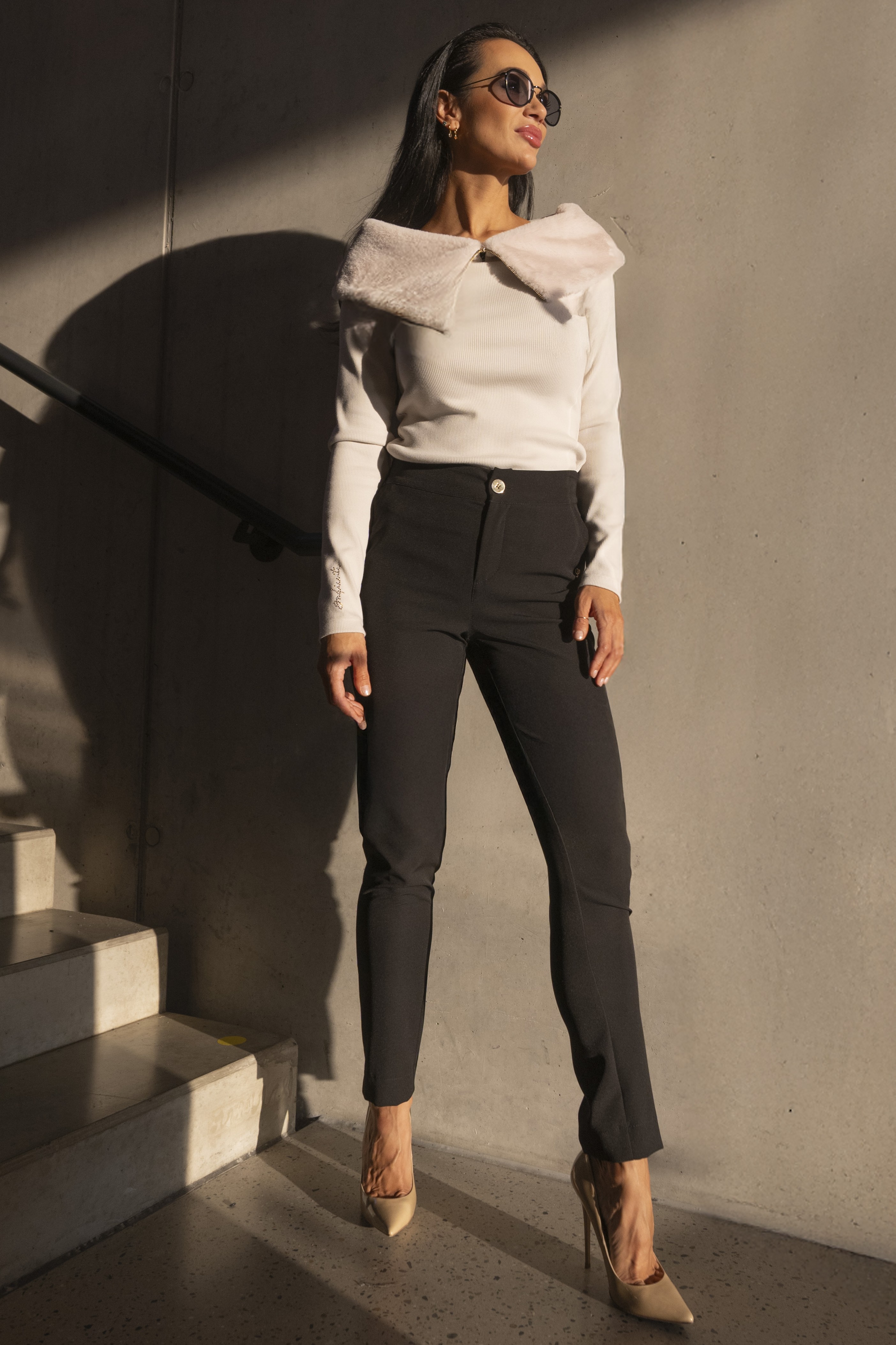 Zajímavé triko s kožešinovým límečkem na zip z příjemného žebrového materiálu. Detailem je logo z luxusních krystalů Preciosa. Dostupné ve dvou barevných variantách.