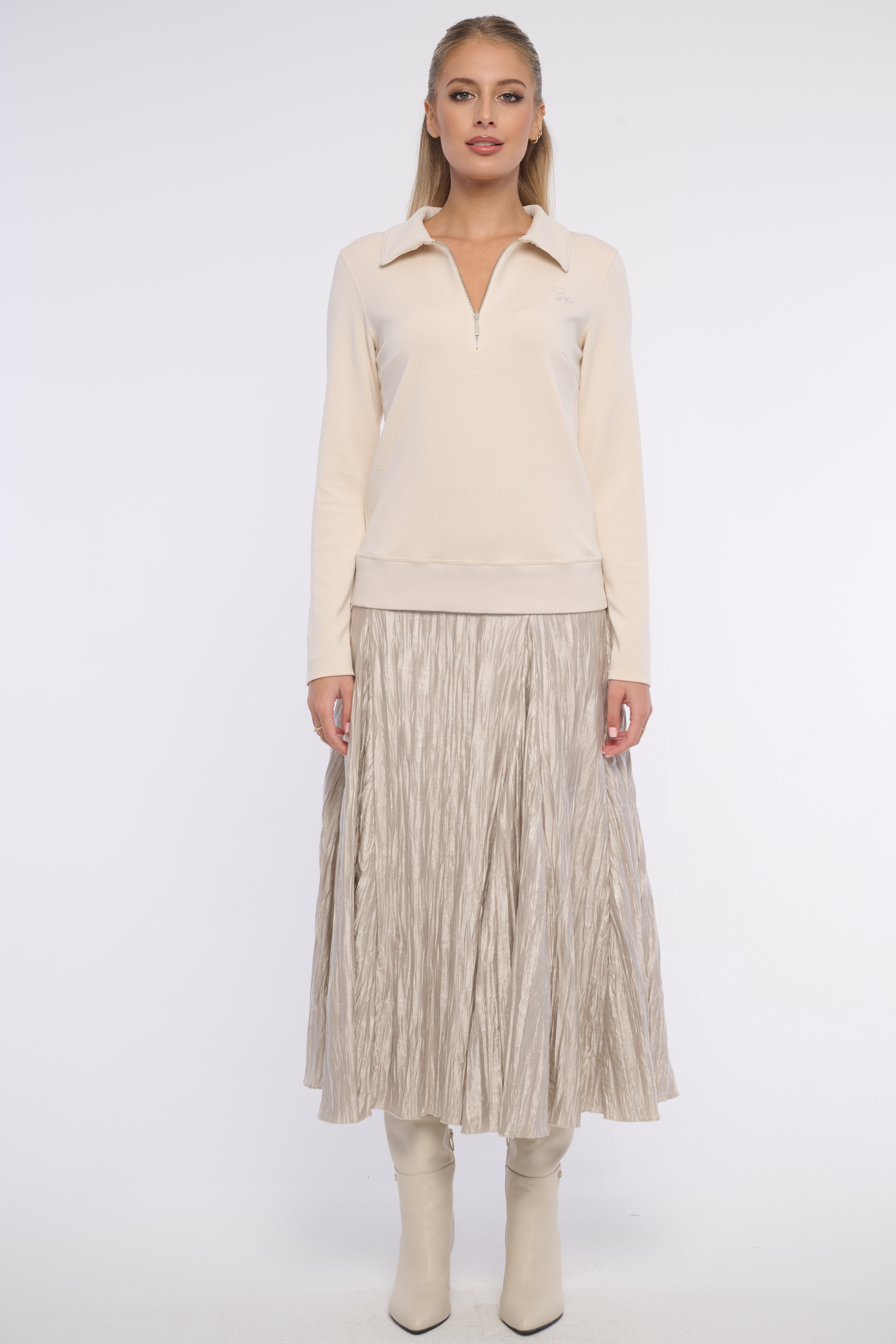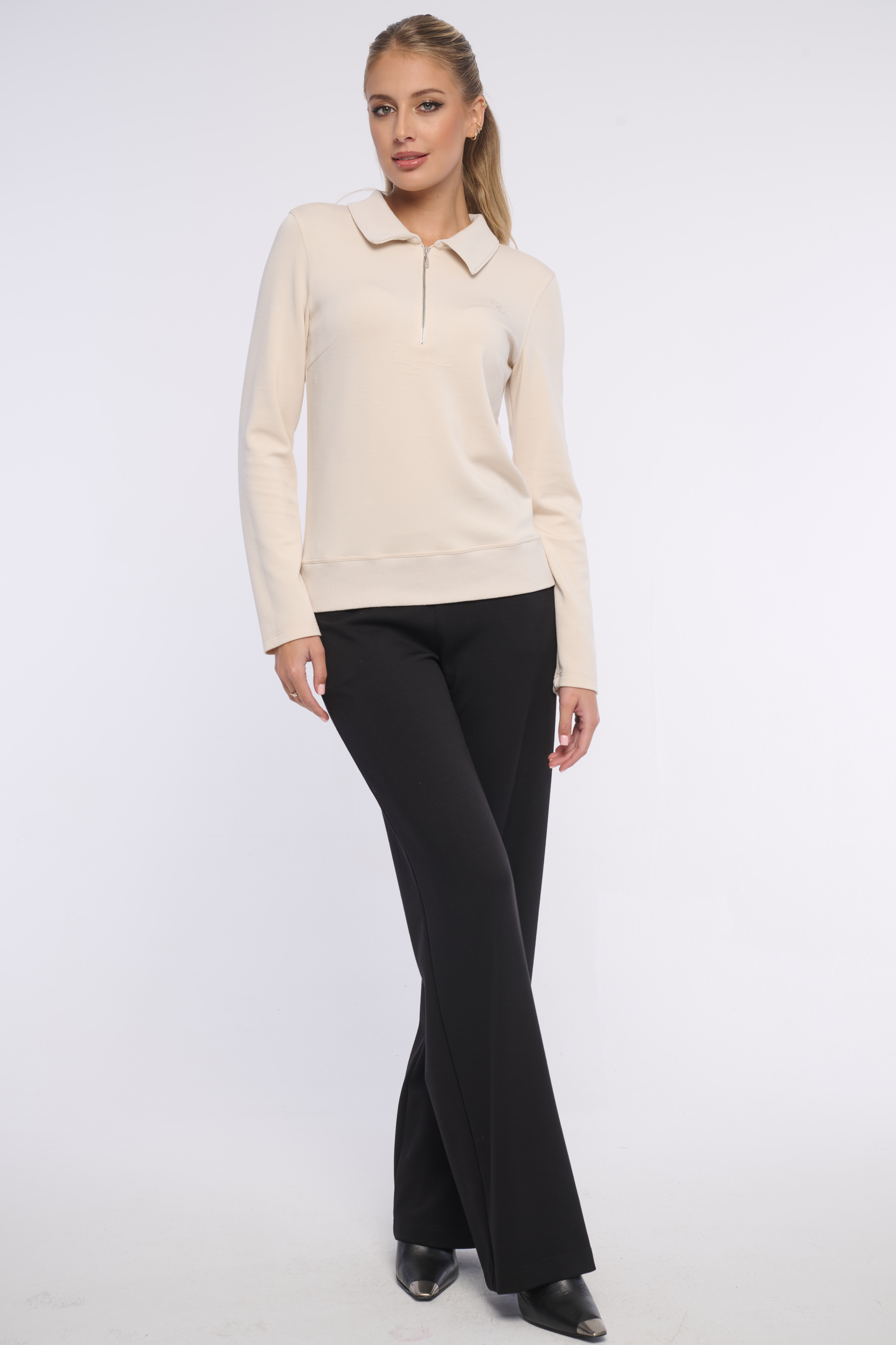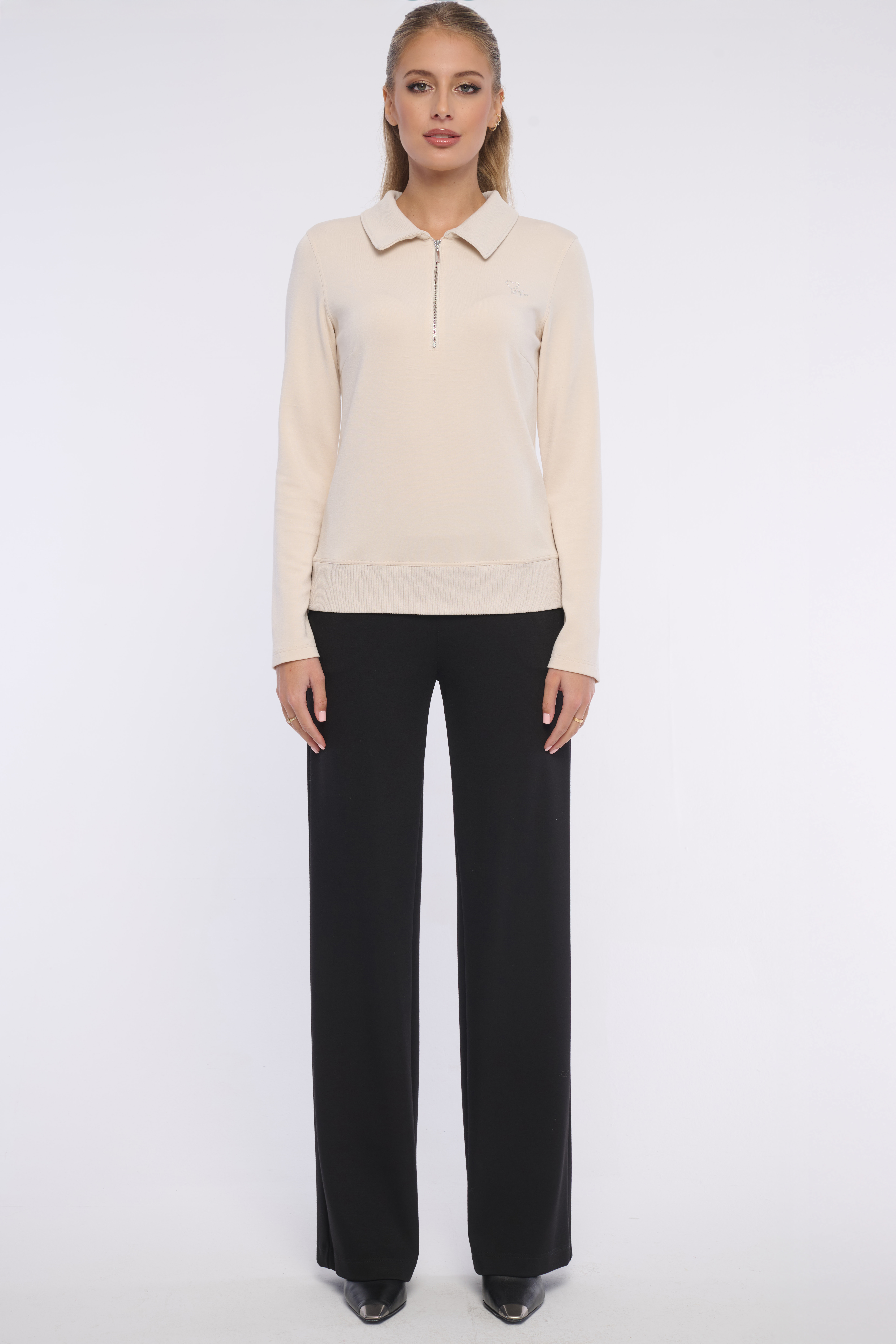 Elegantní mikina z kombinace materiálů - z velmi pohodlného hladkého a límeček, spodní lem jsou z žebrového materiálu. Detailem je logo z luxusních krystalů Preciosa. Vhodná na volný čas i do kanceláře. Dostupná ve dvou barevných variantách.
