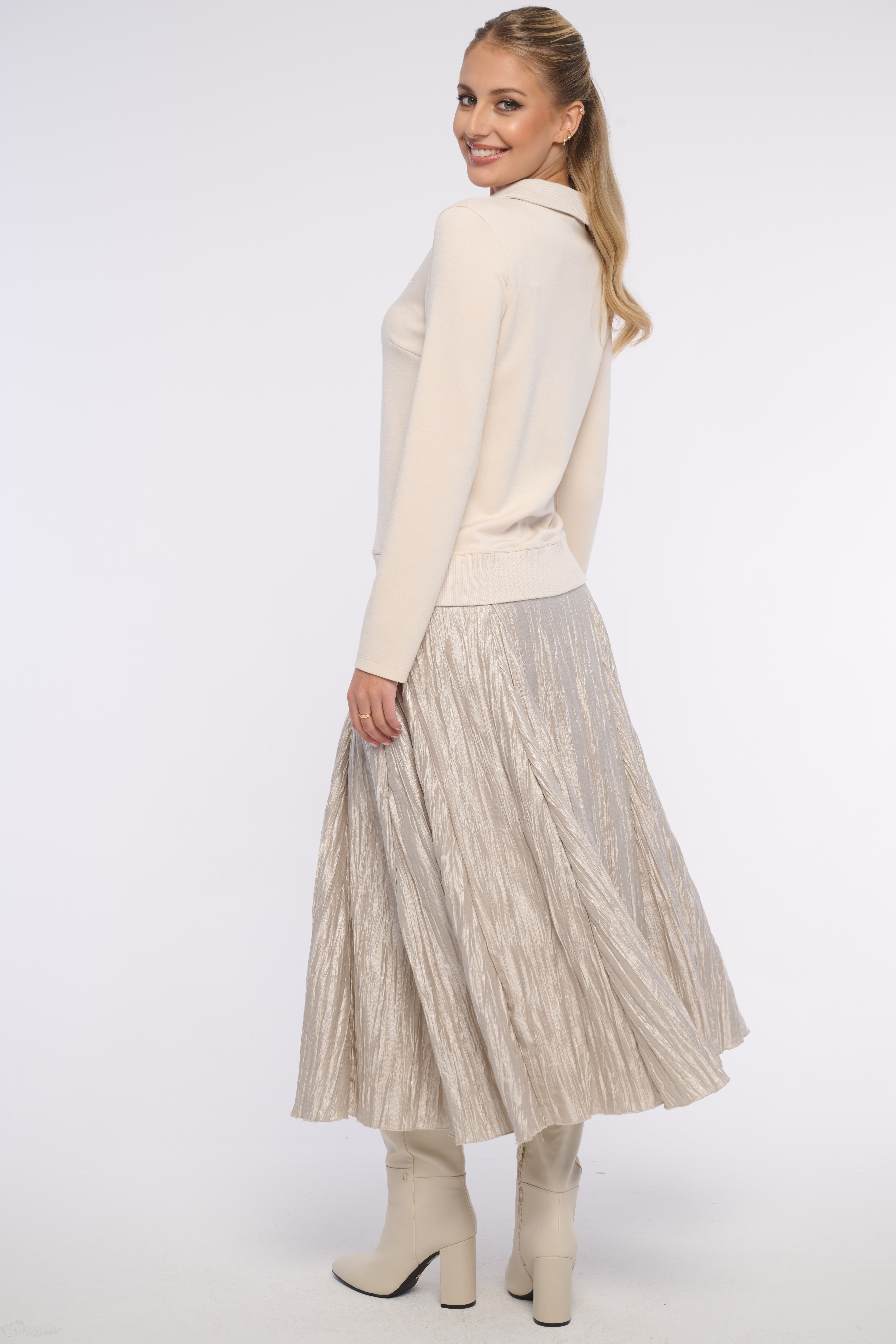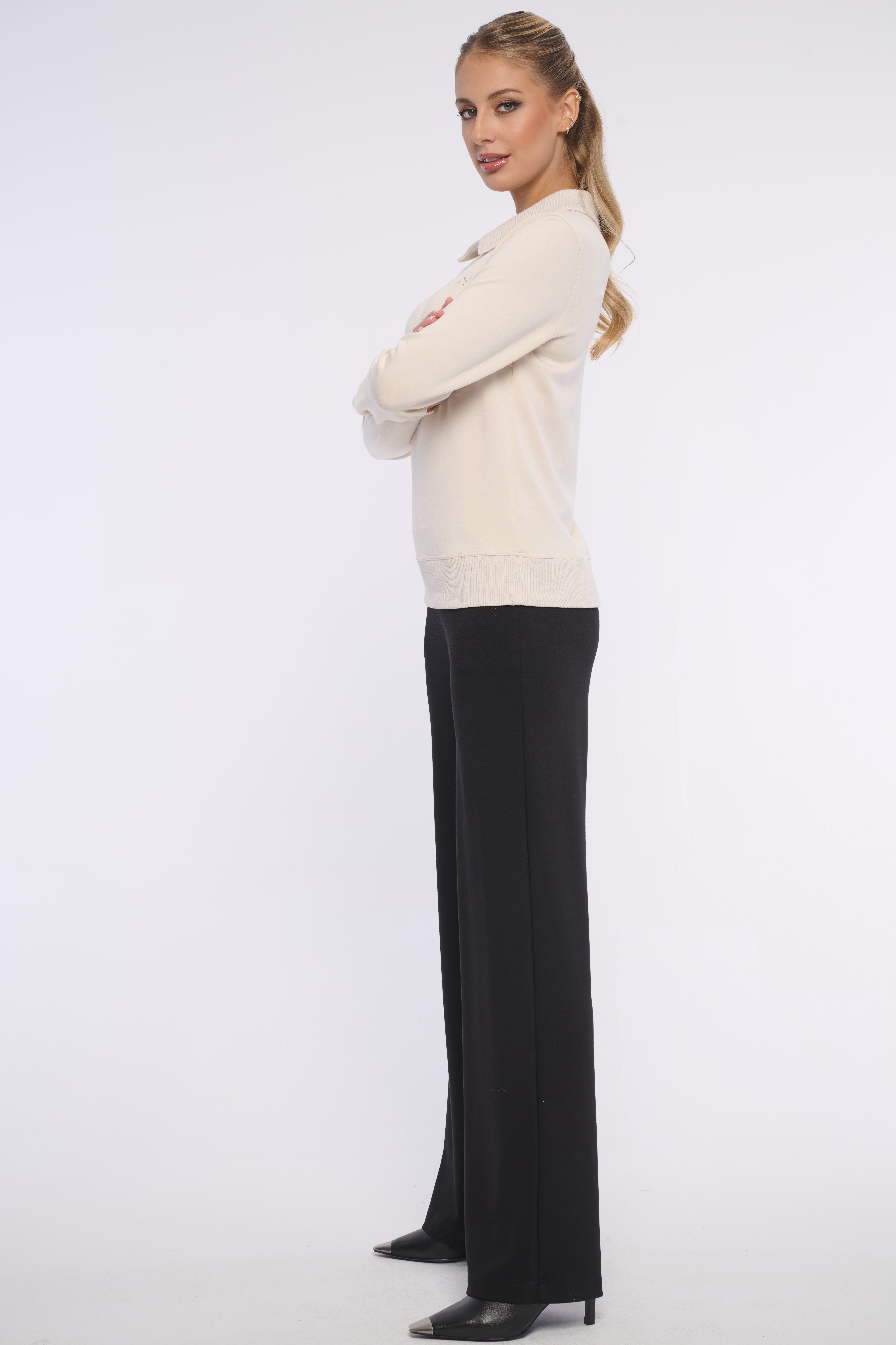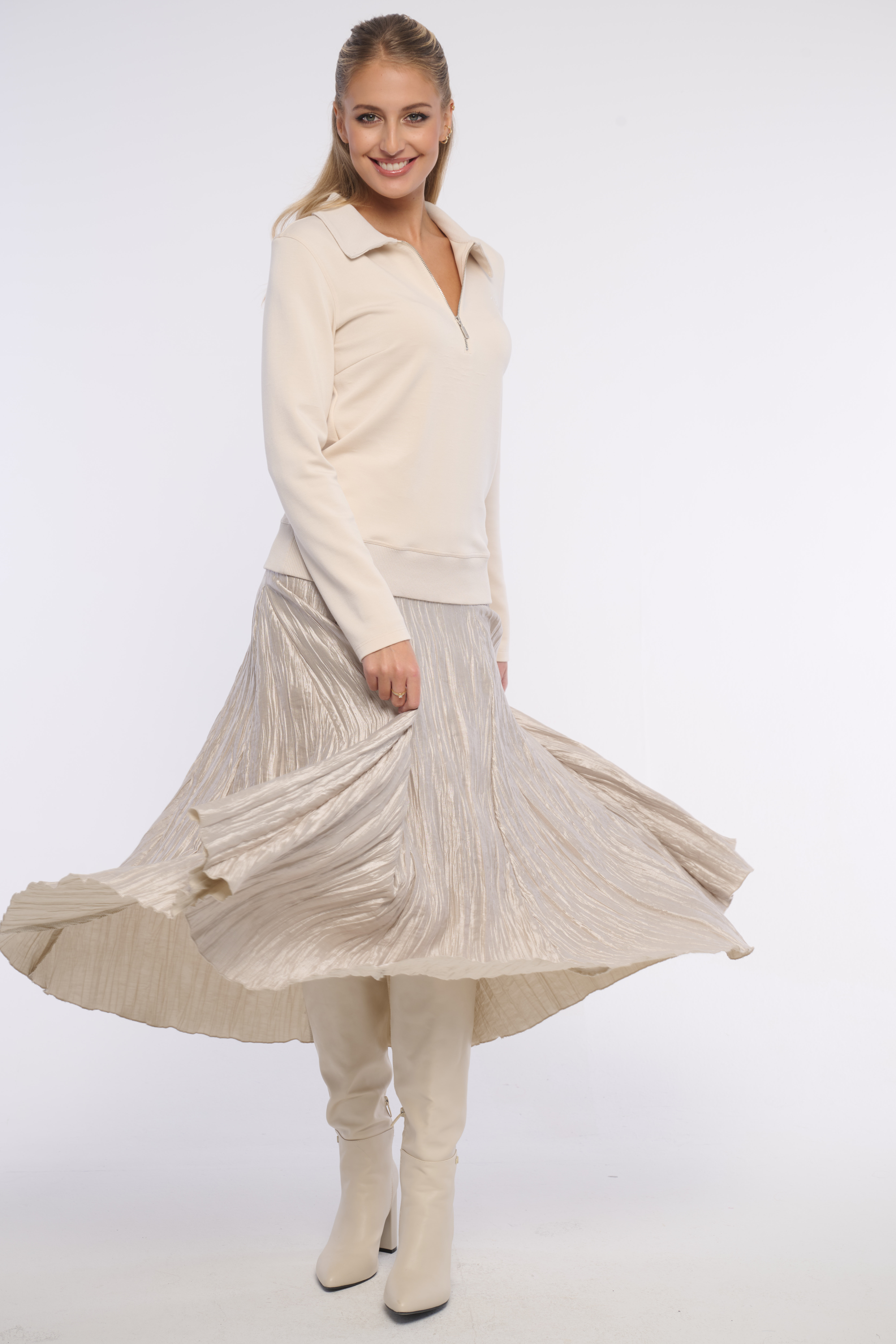 Elegantní mikina z kombinace materiálů - z velmi pohodlného hladkého a límeček, spodní lem jsou z žebrového materiálu. Detailem je logo z luxusních krystalů Preciosa. Vhodná na volný čas i do kanceláře. Dostupná ve dvou barevných variantách.