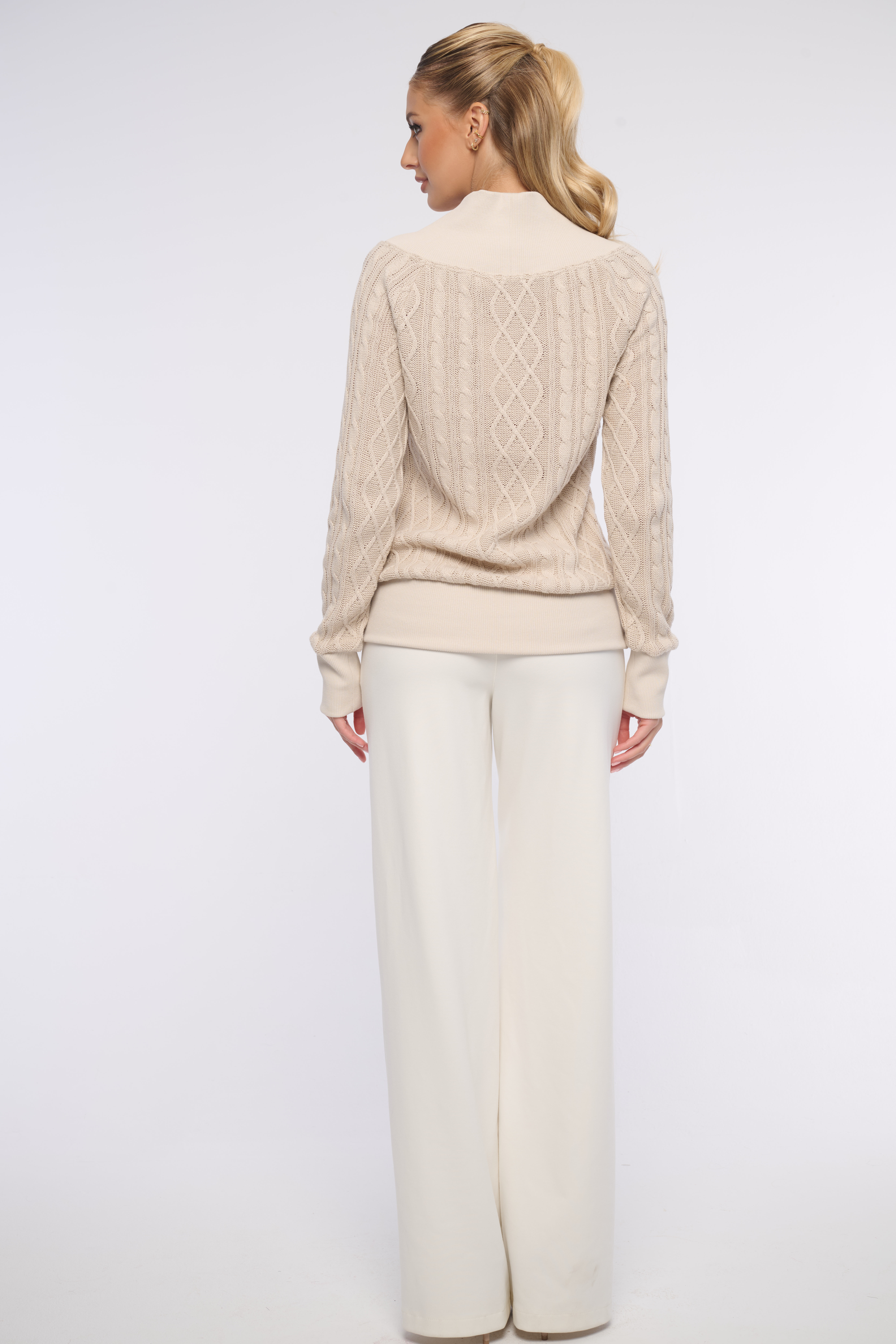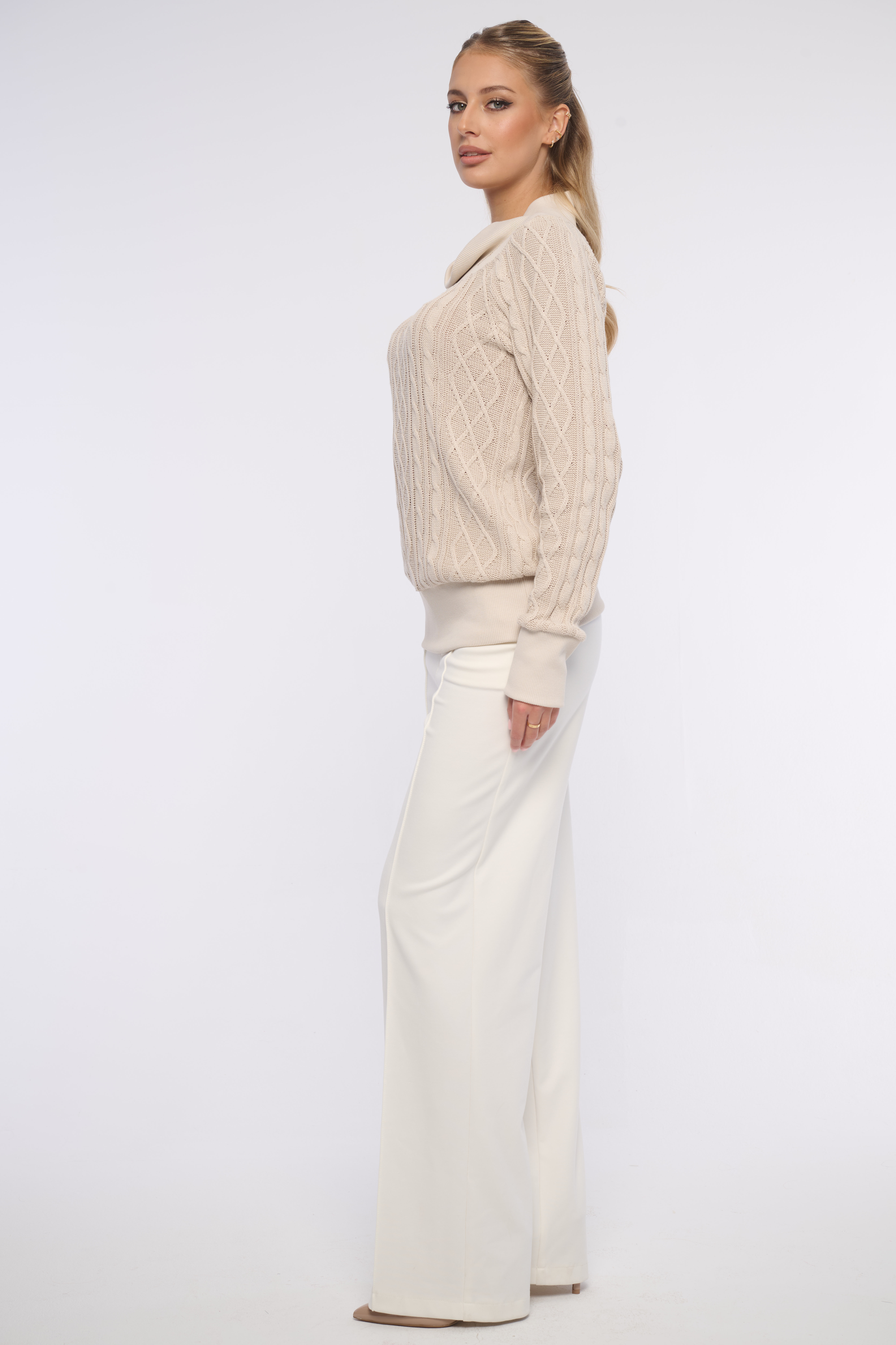 Lehký elegantní pletený svetr s volným límcem doplněným logem z krystalů Preciosa. Včetně rukávů je zakončen pevnějším žebrovým materiálem, takže krásně drží tvar. Dostupný ve dvou barevných variantách.
