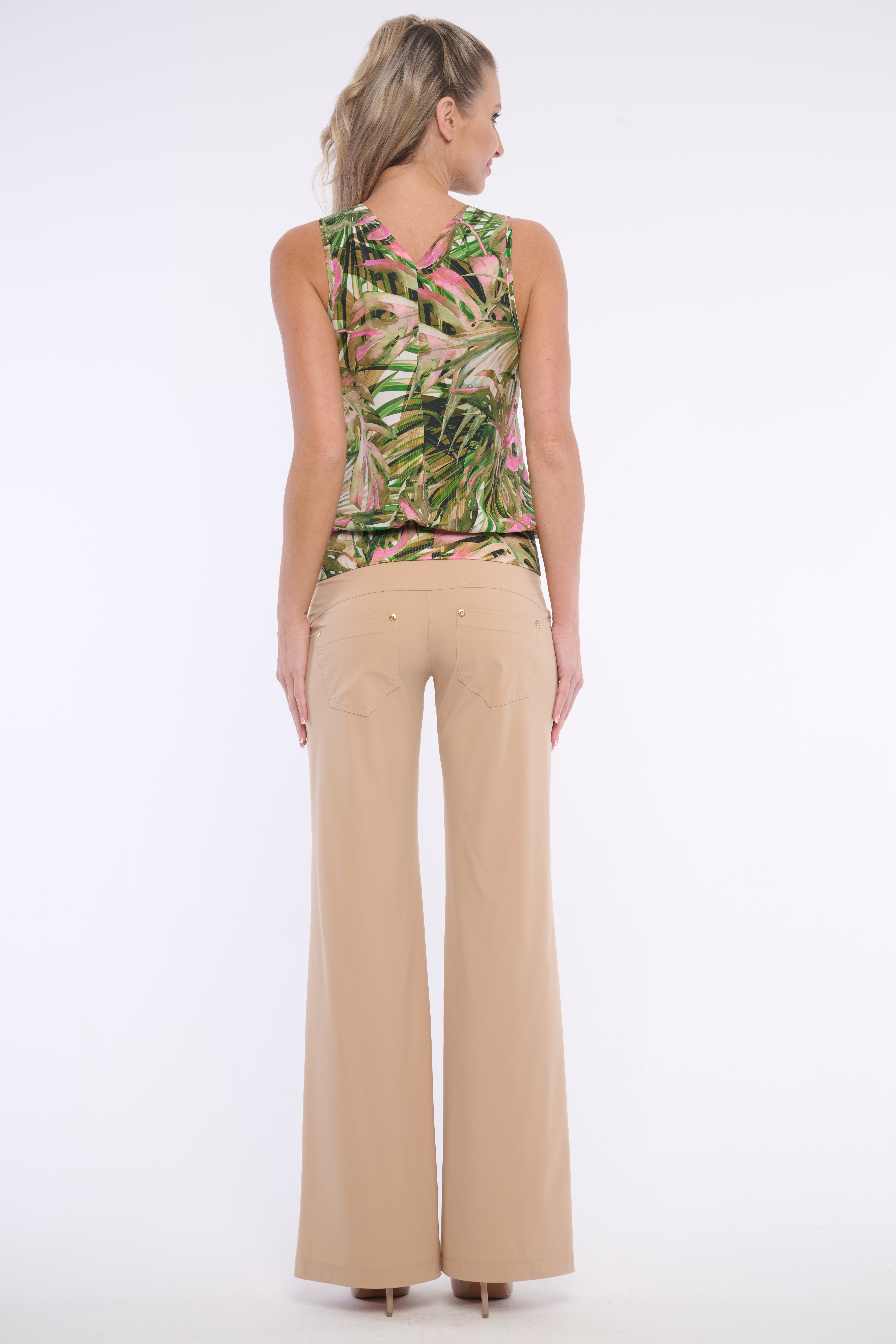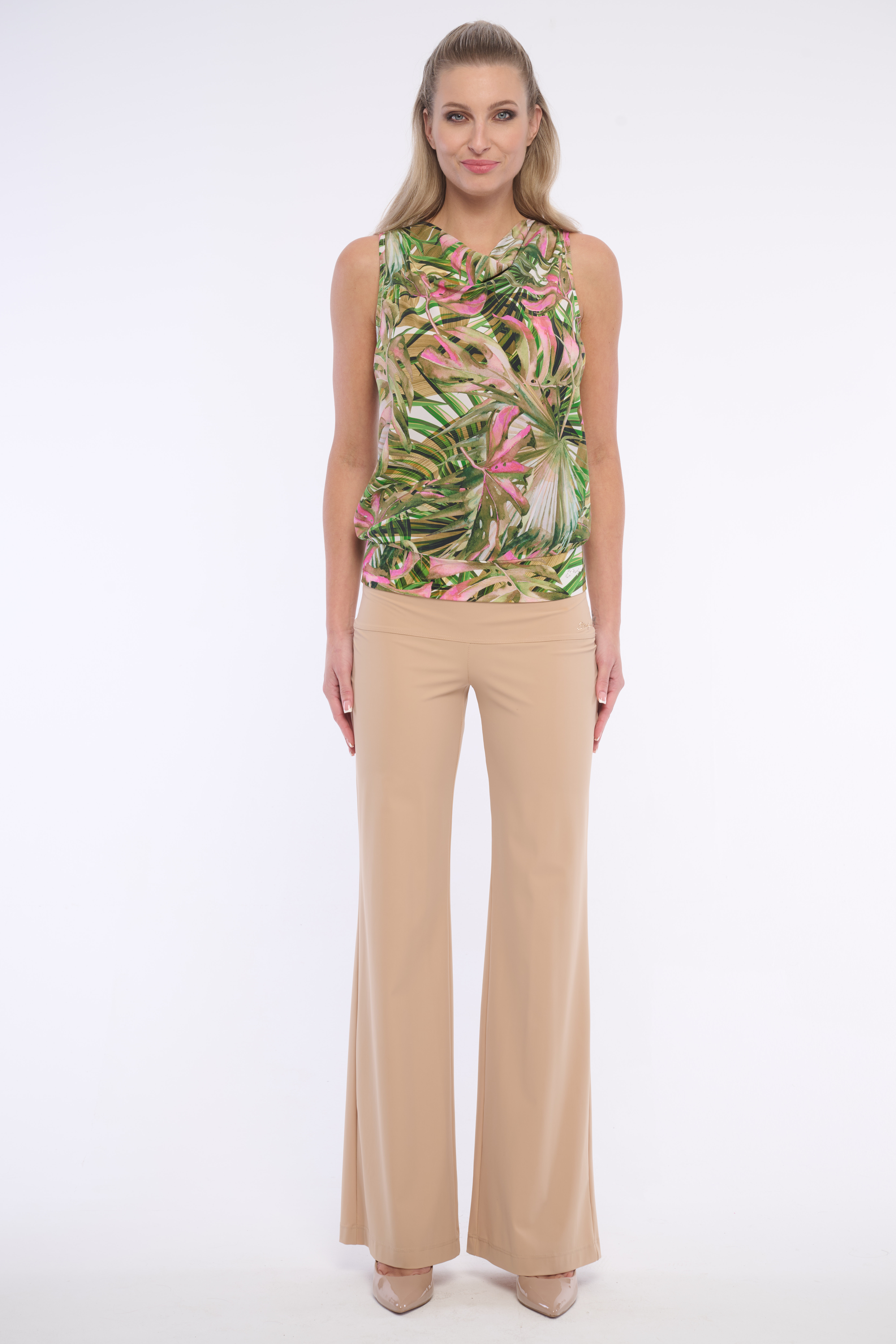 Lehký top s letním vzorem a s vodovým výstřihem, který zaujme každého. Detail tvoří logo na spodním lemu z luxusních krystalů Preciosa. Dostupný ve dvou barevných variantách.