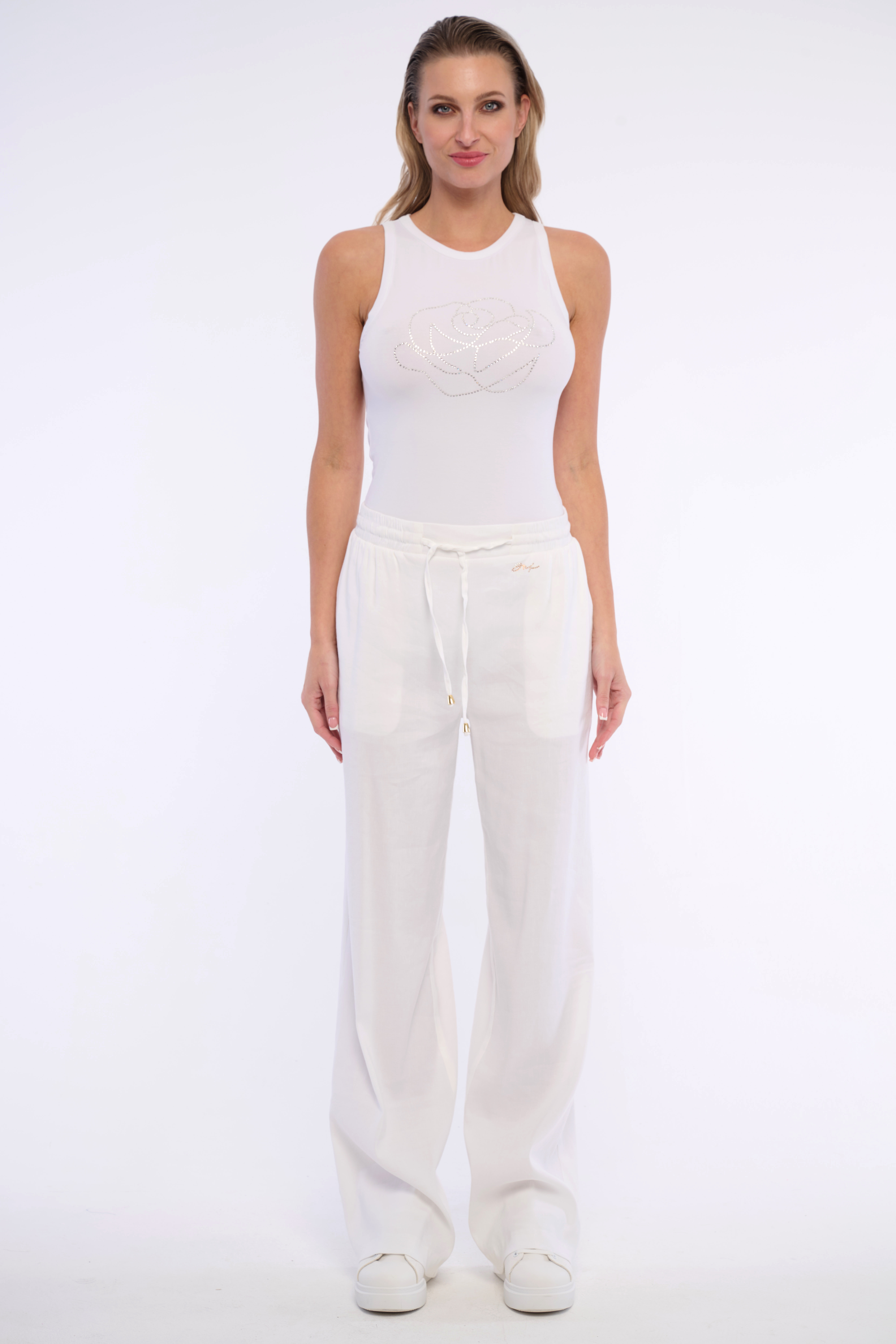 Klasické tílko s žebrovým lemováním okolo krku a ramen, doplněné výraznou růží z krystalů Swarowski. Dostupné ve čtyřech variantách.