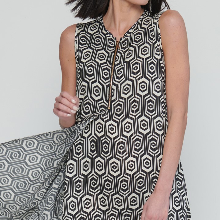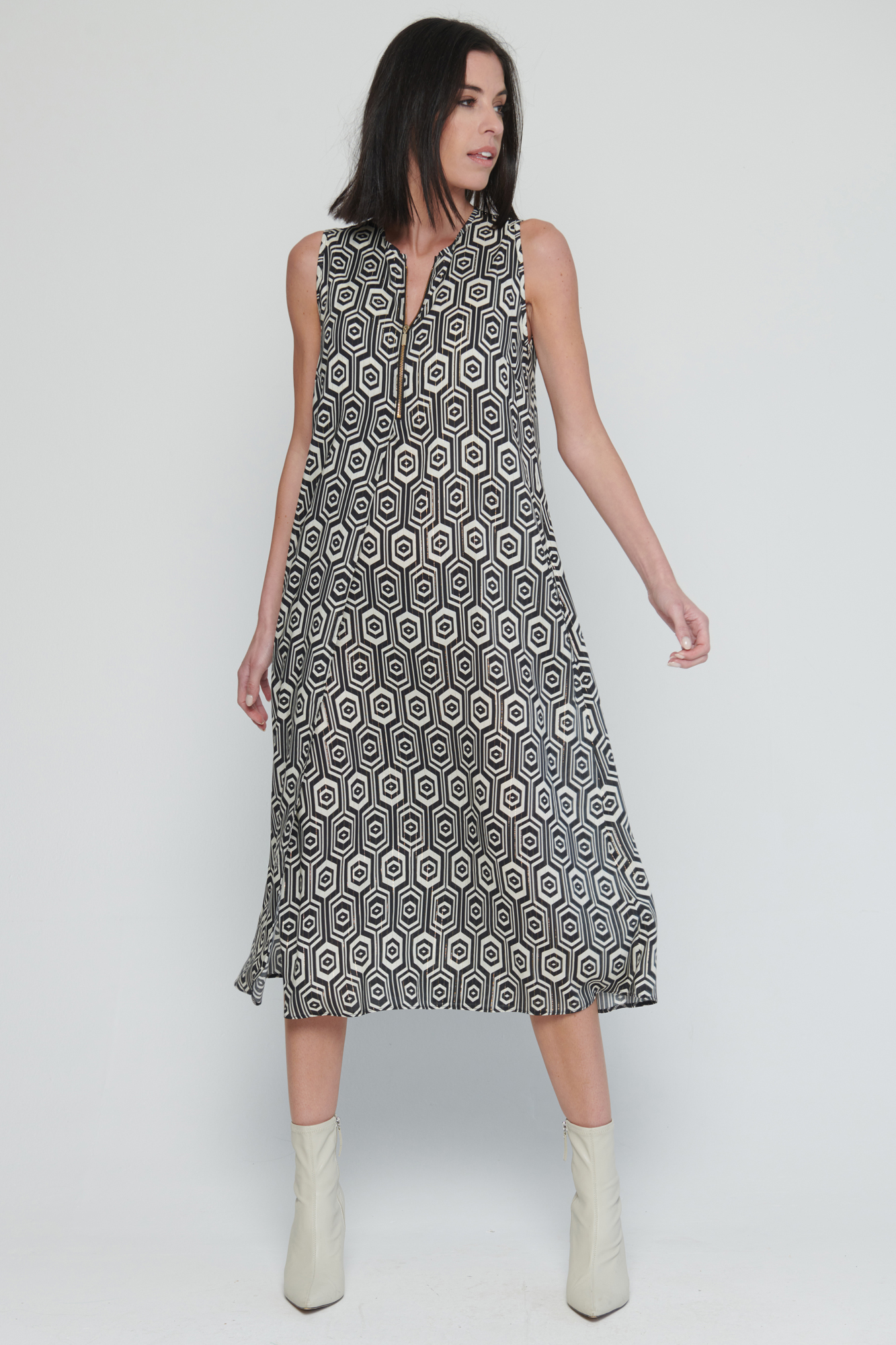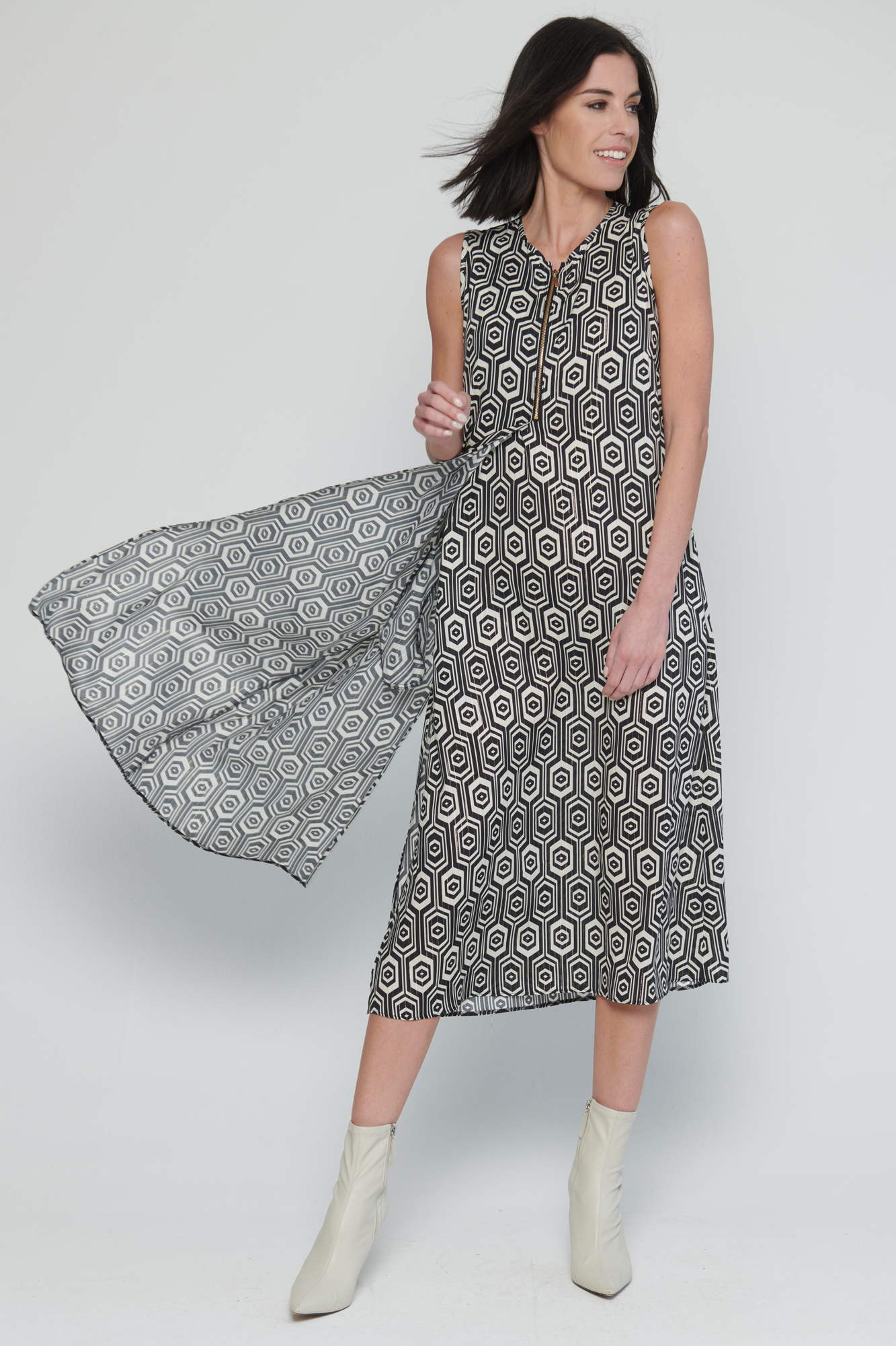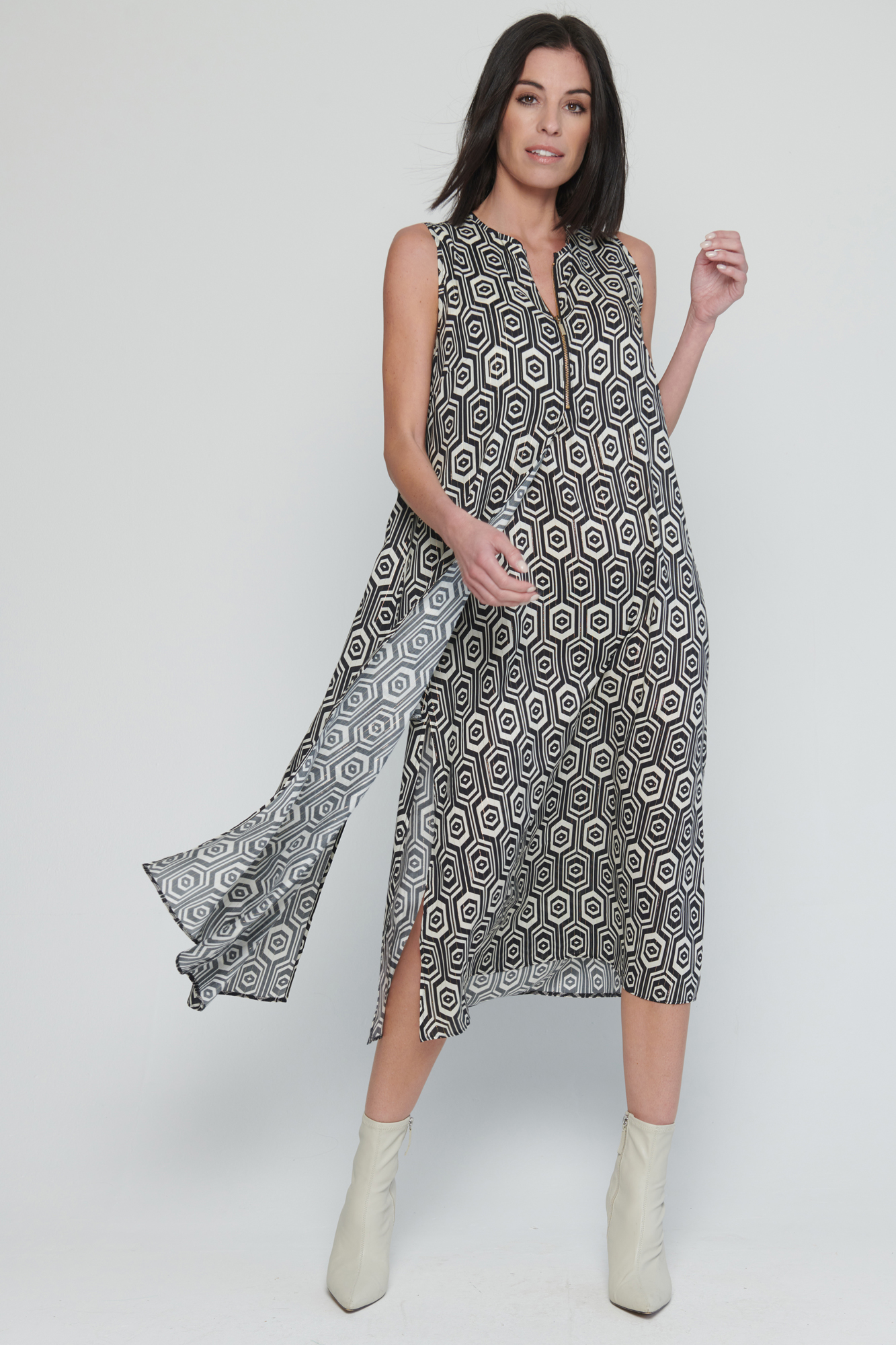 Volné dlouhé šaty bez rukávu. Zlatý zip.