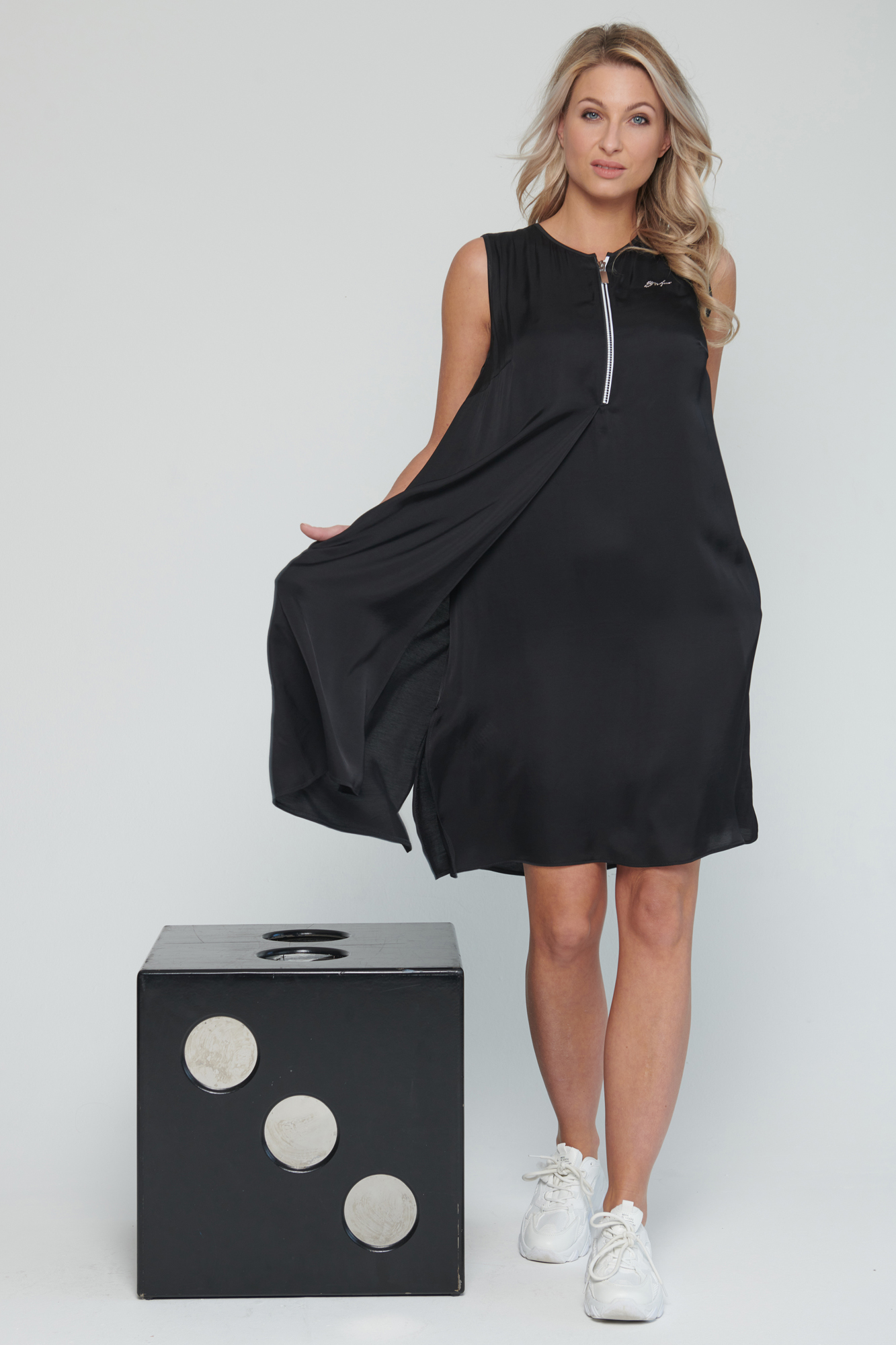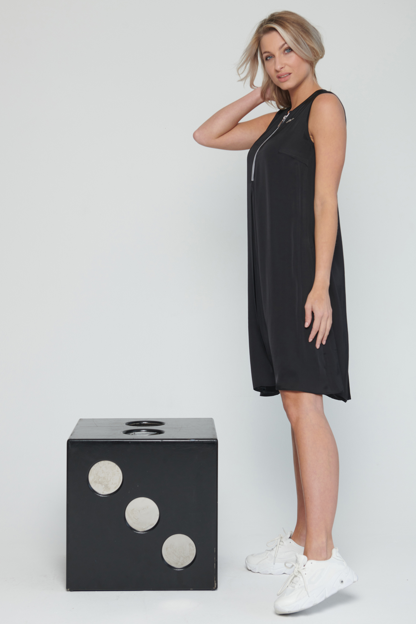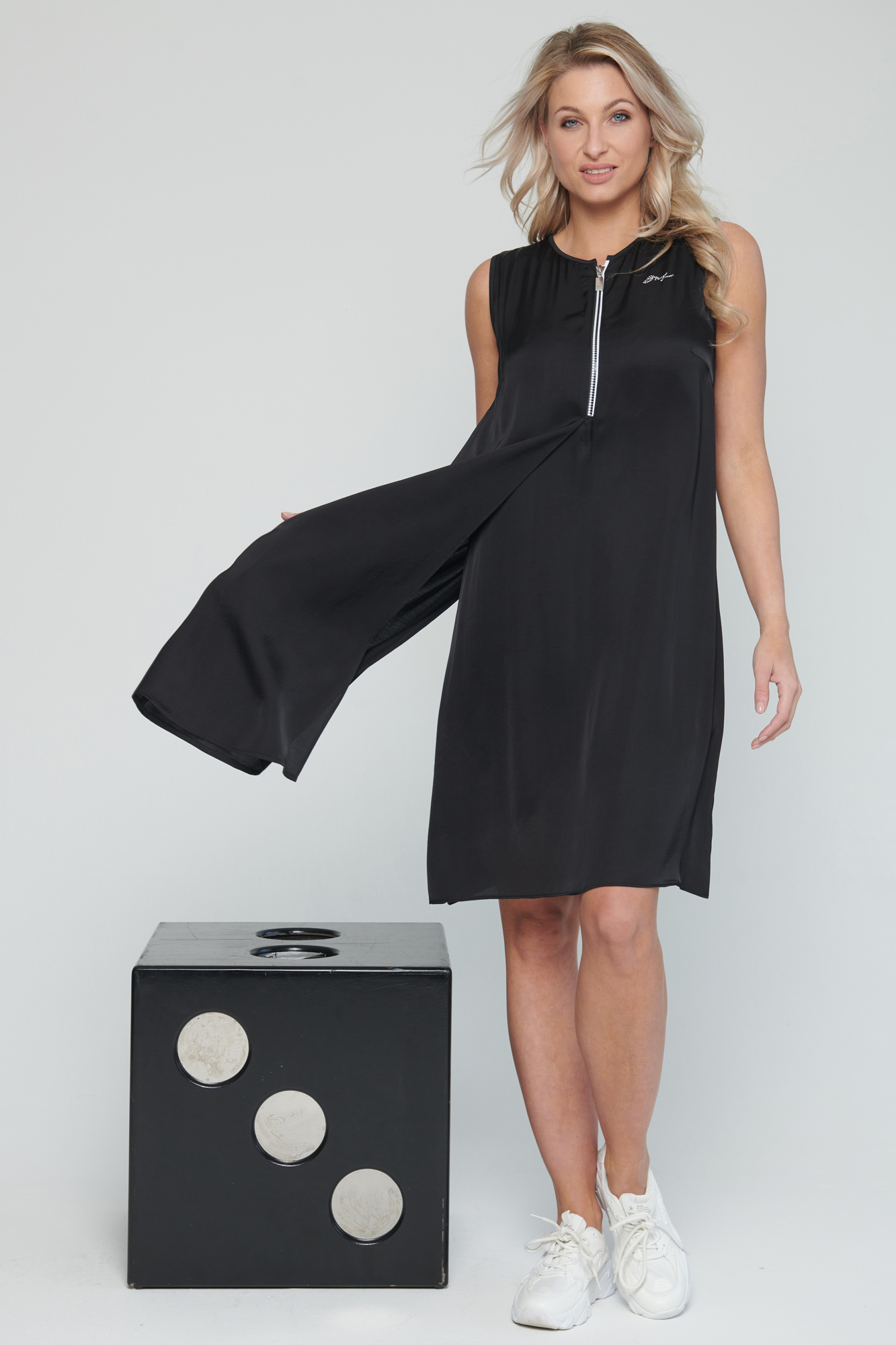 Šaty s černobílým zipem ve výstřihu. Malé crystal logo INF na předním díle.