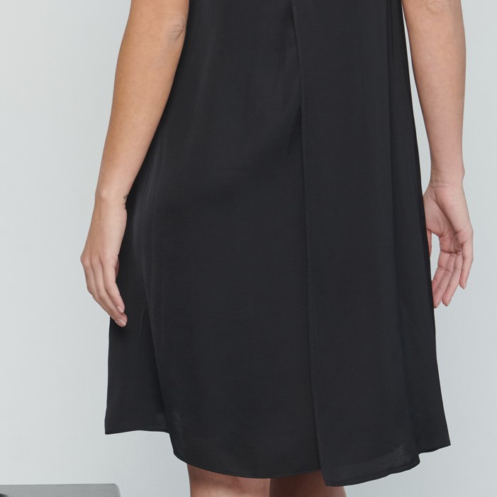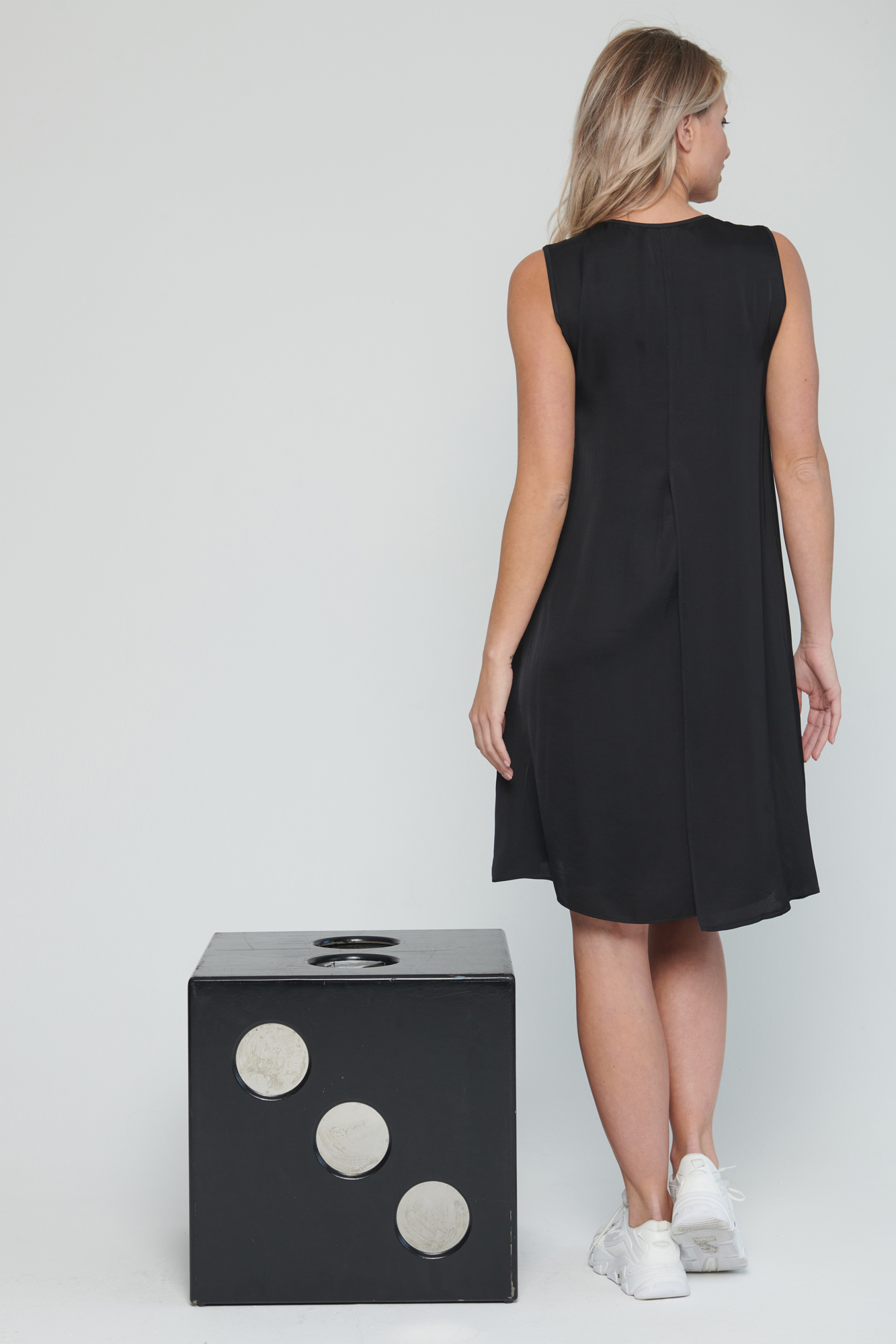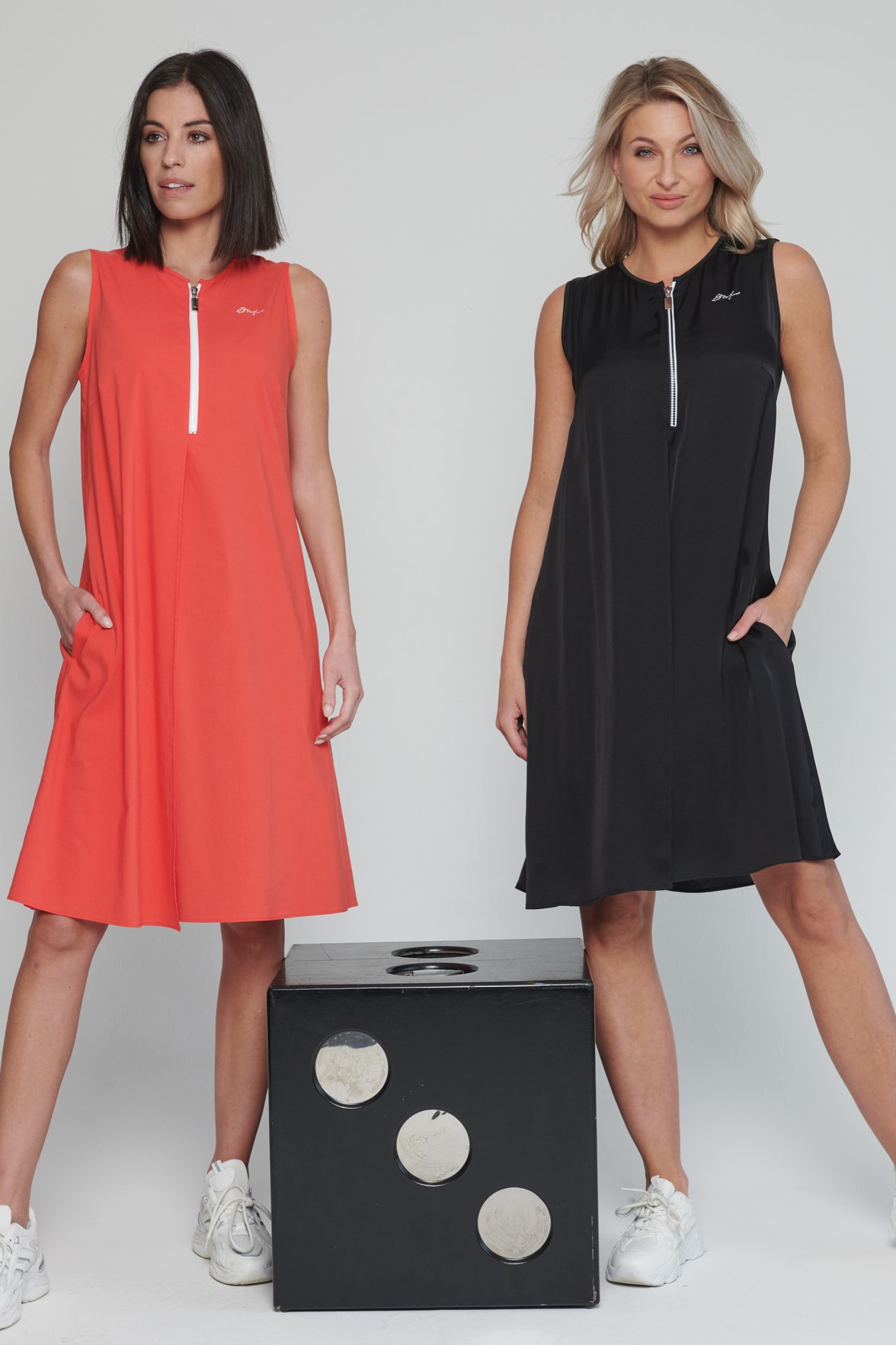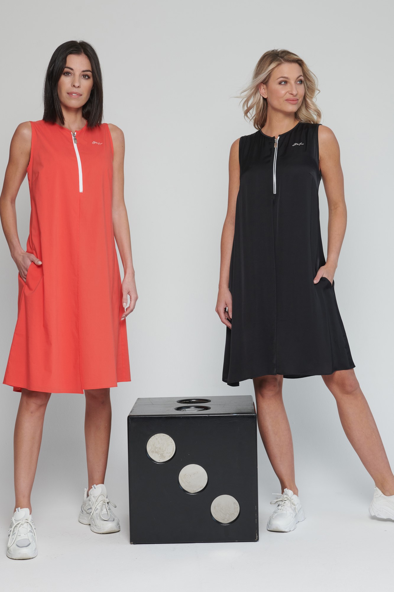 Šaty s černobílým zipem ve výstřihu. Malé crystal logo INF na předním díle.