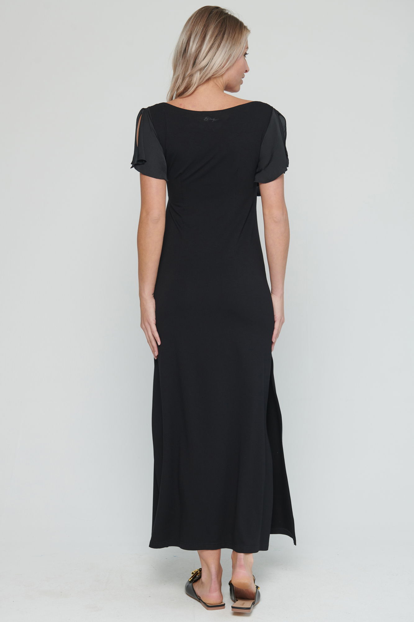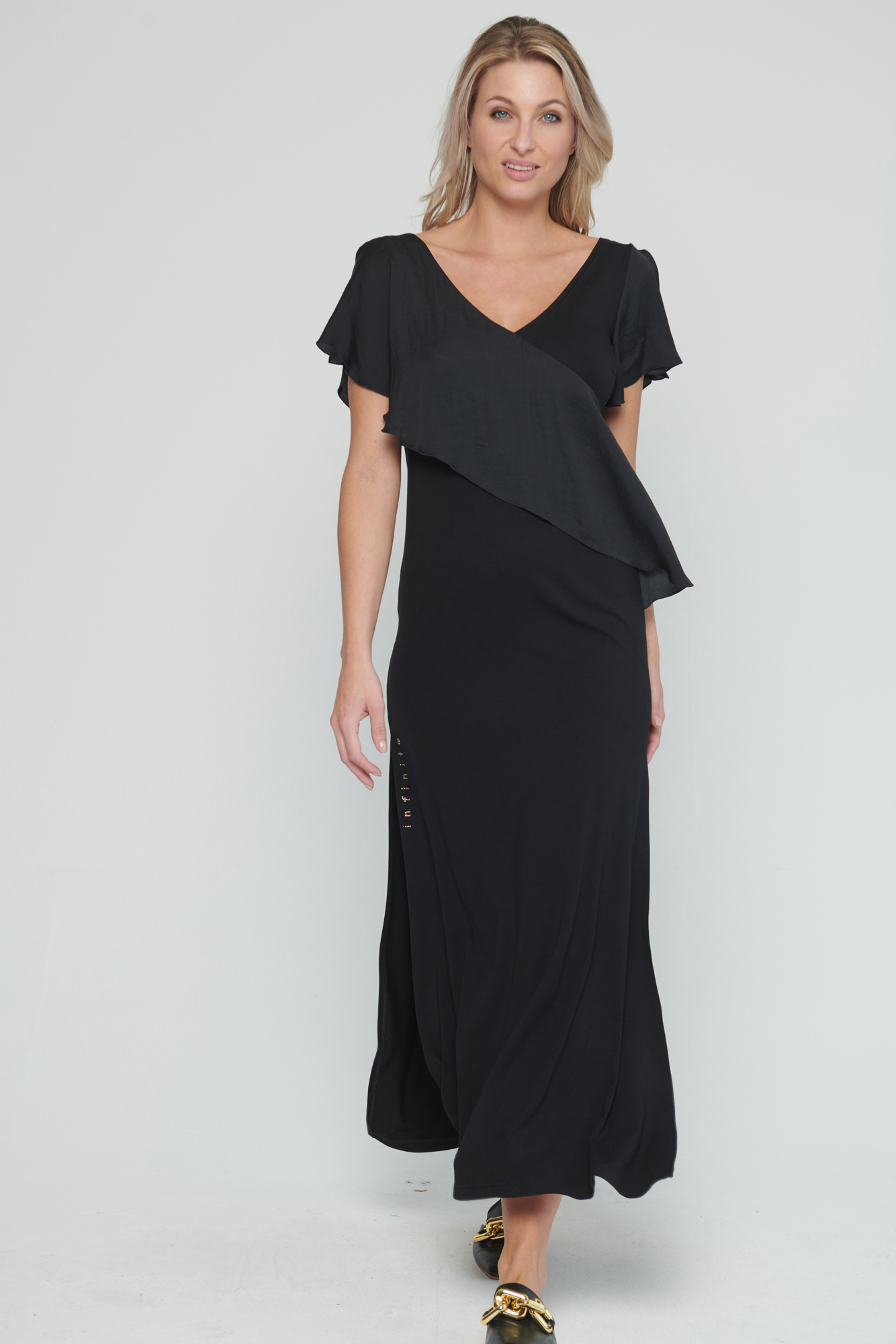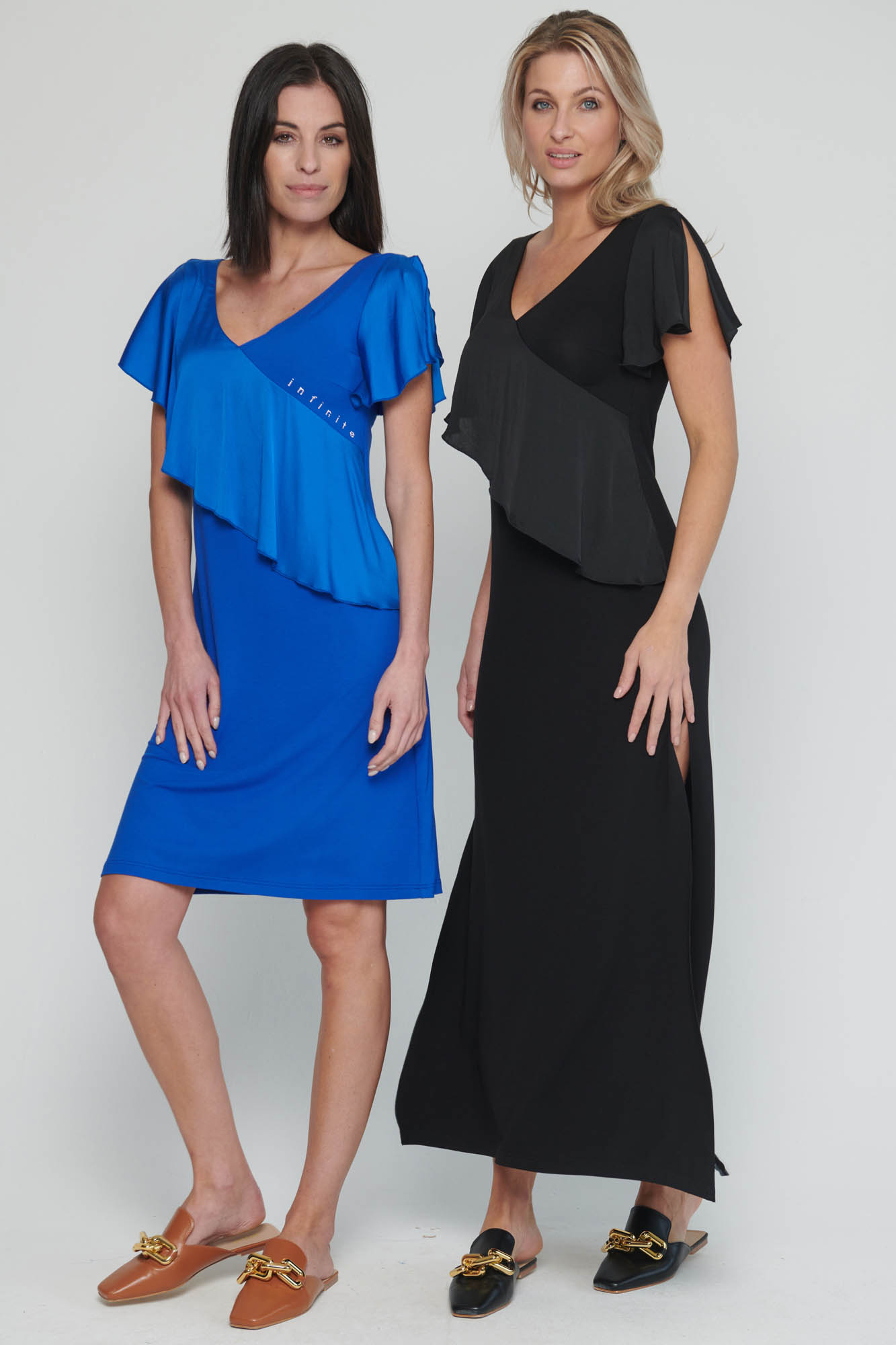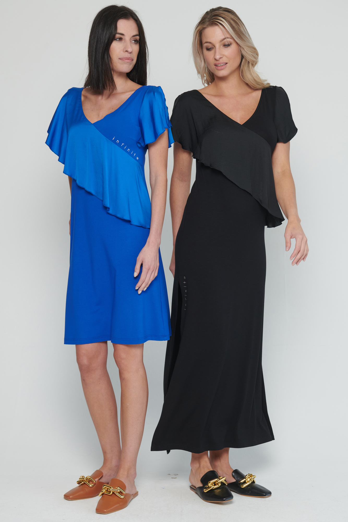 Dlouhé úpletové šaty s kanýrem na předním díle. V délce šatů jsou rozparky a na straně crystalové logo Infinite.
