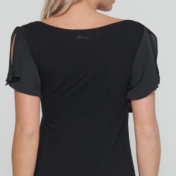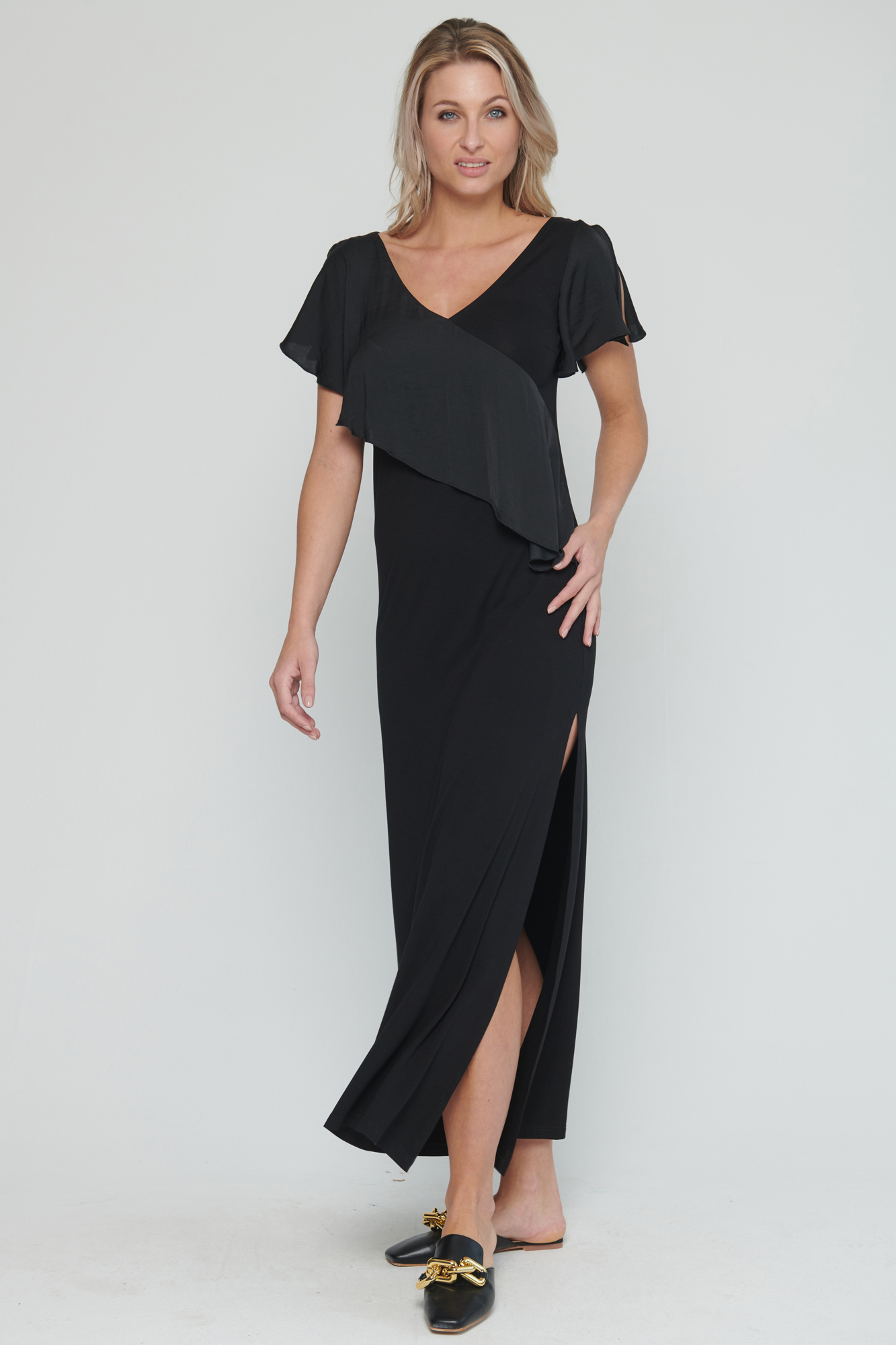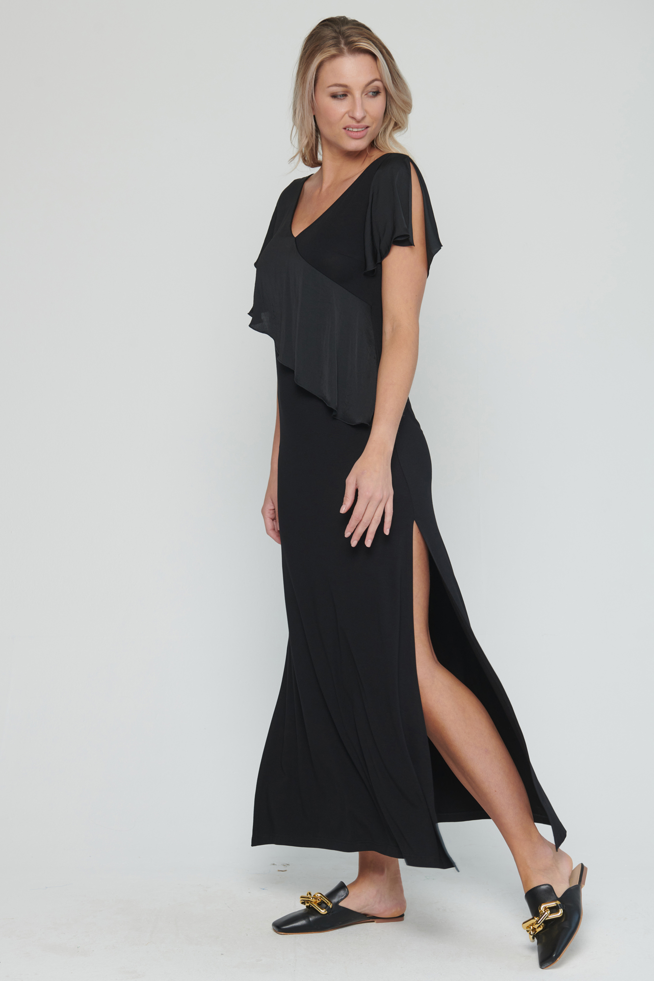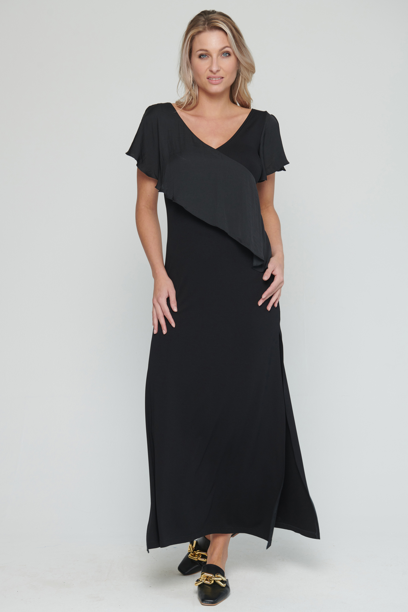 Dlouhé úpletové šaty s kanýrem na předním díle. V délce šatů jsou rozparky a na straně crystalové logo Infinite.