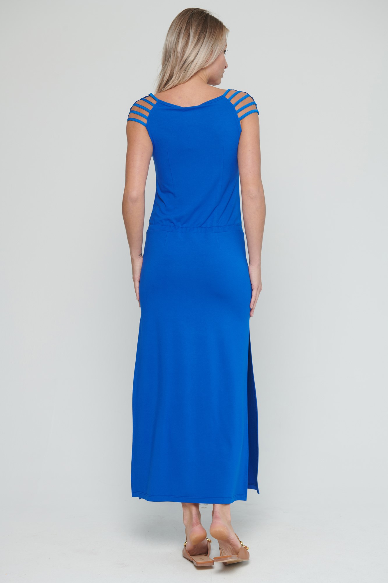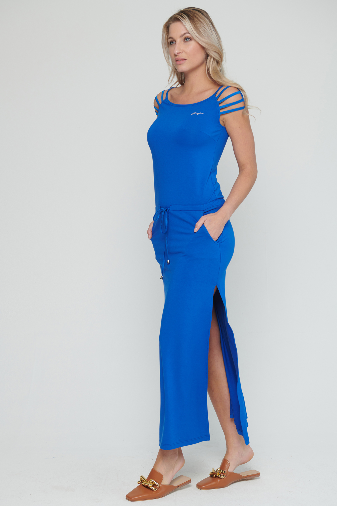 Dlouhé úpletové šaty. Na ramenech efektní průstřihy. V pase přestřižené, možnost stažení tkaničkou. Malé crystal logo INF na rameni.
