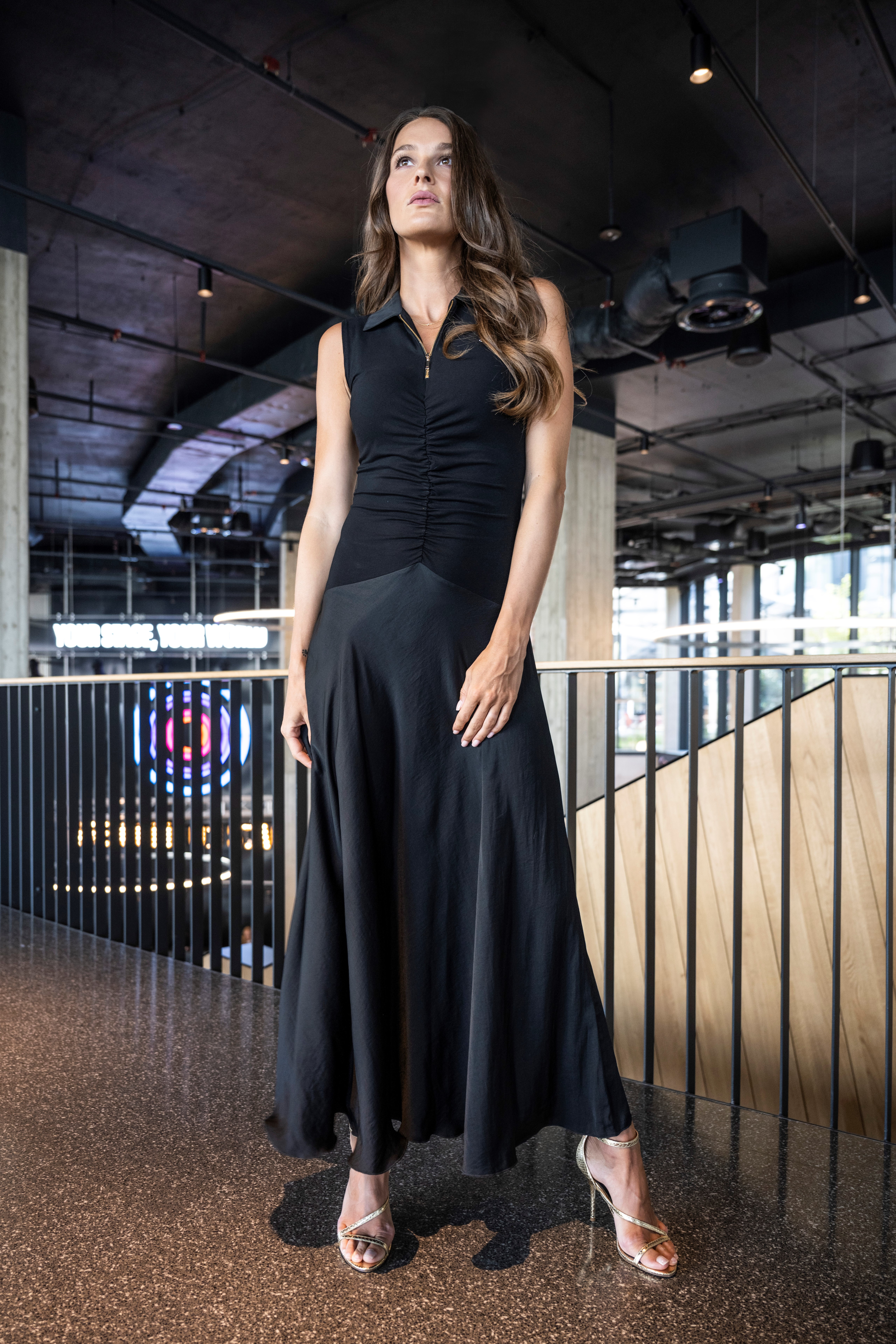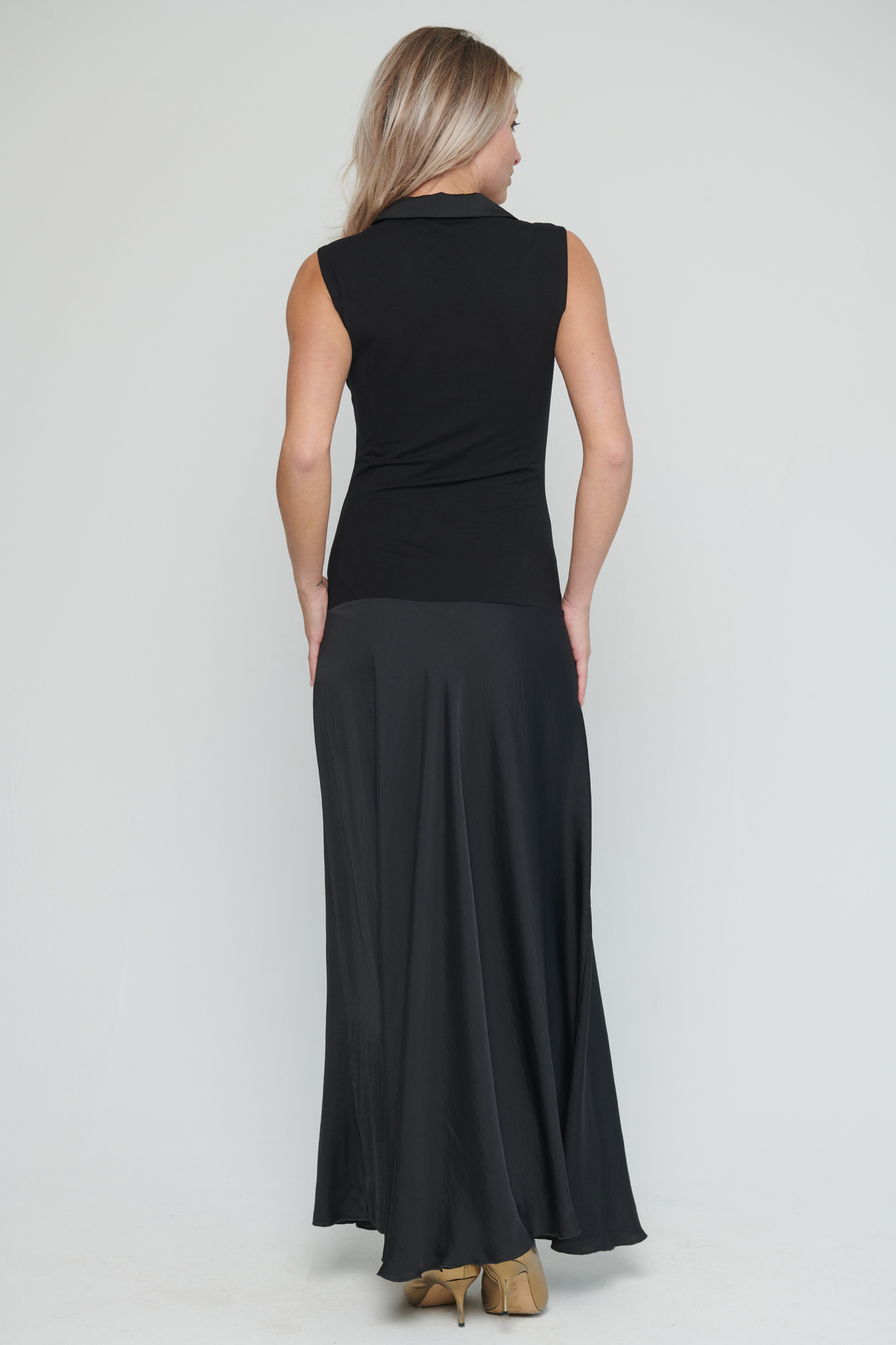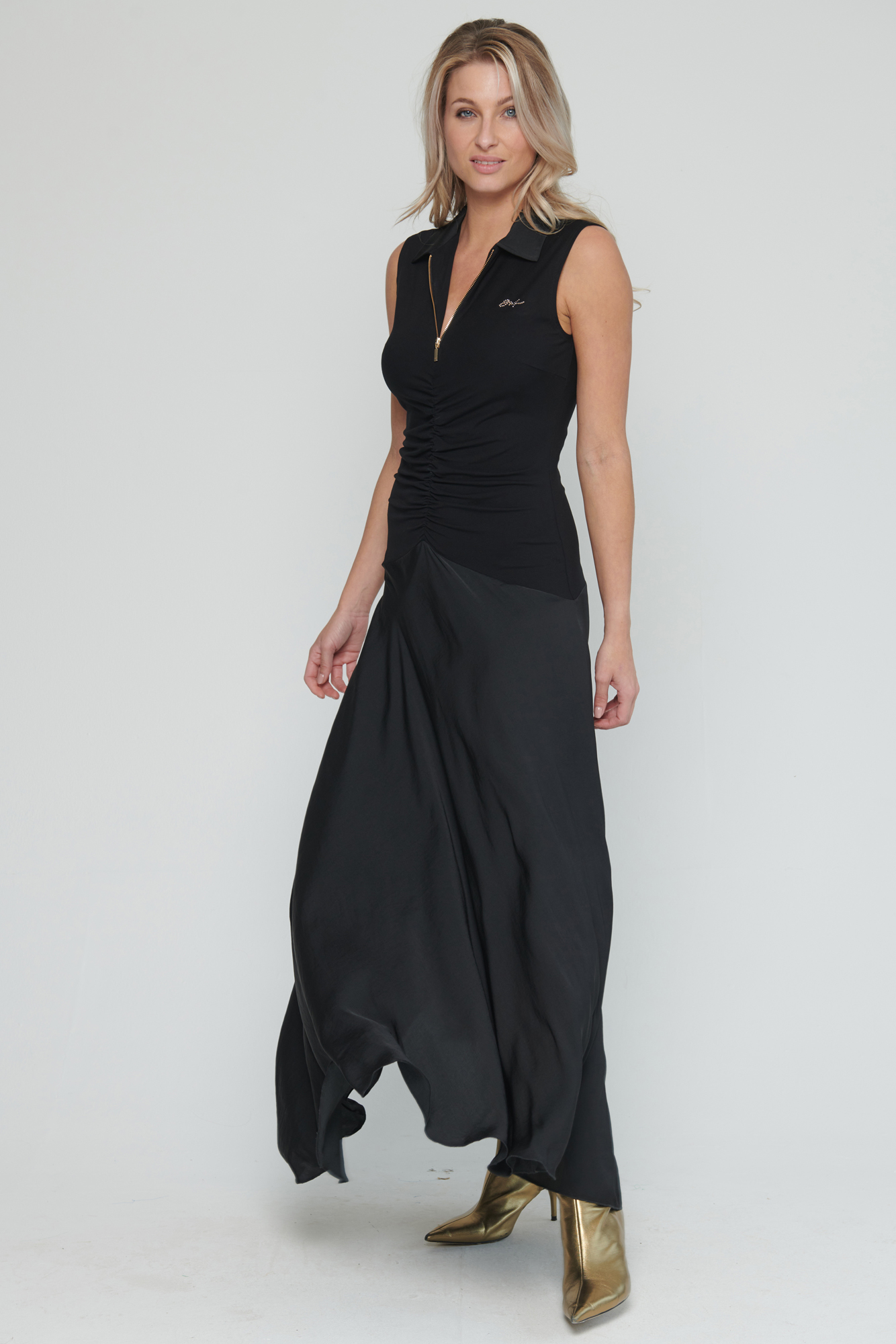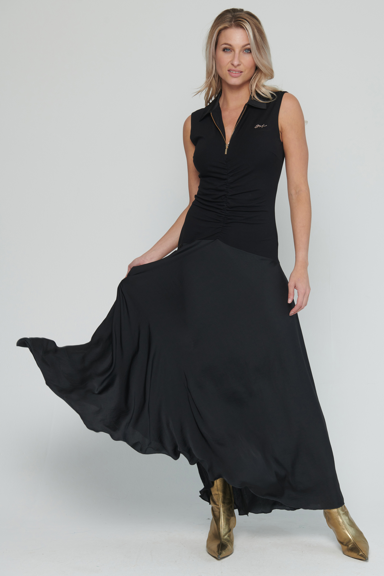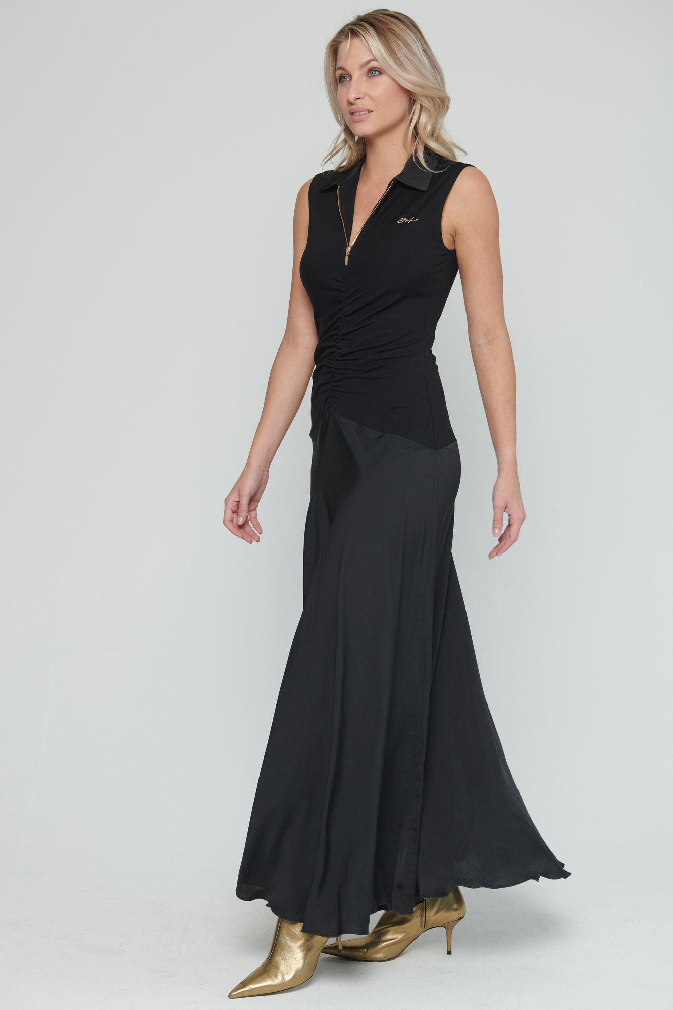 Dlouhé šaty s límečkem. Řasení na předním díle v pase, které zdůrazňuje siluetu.
