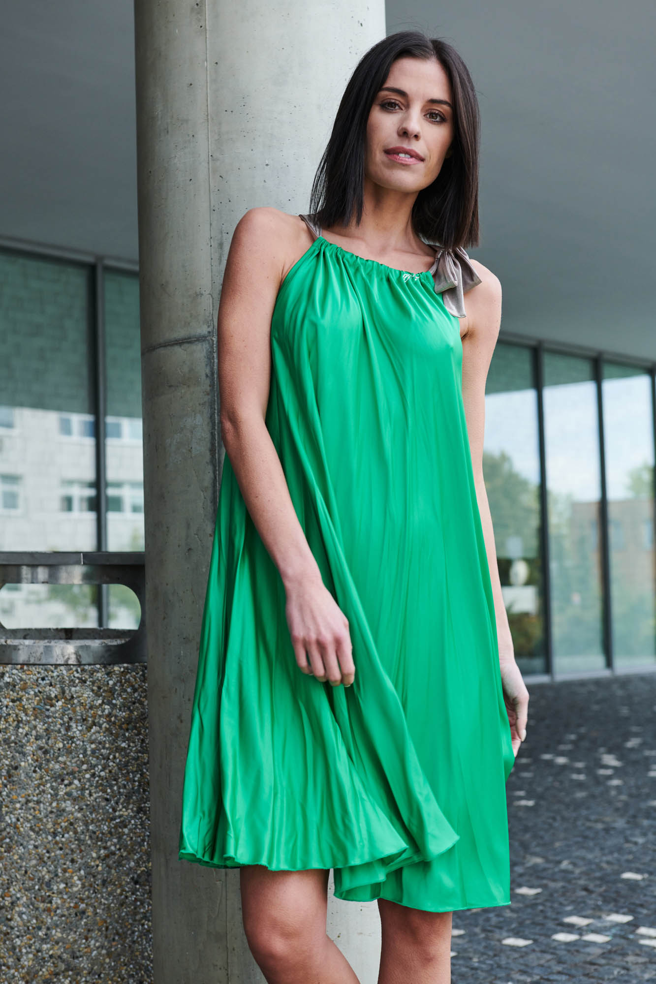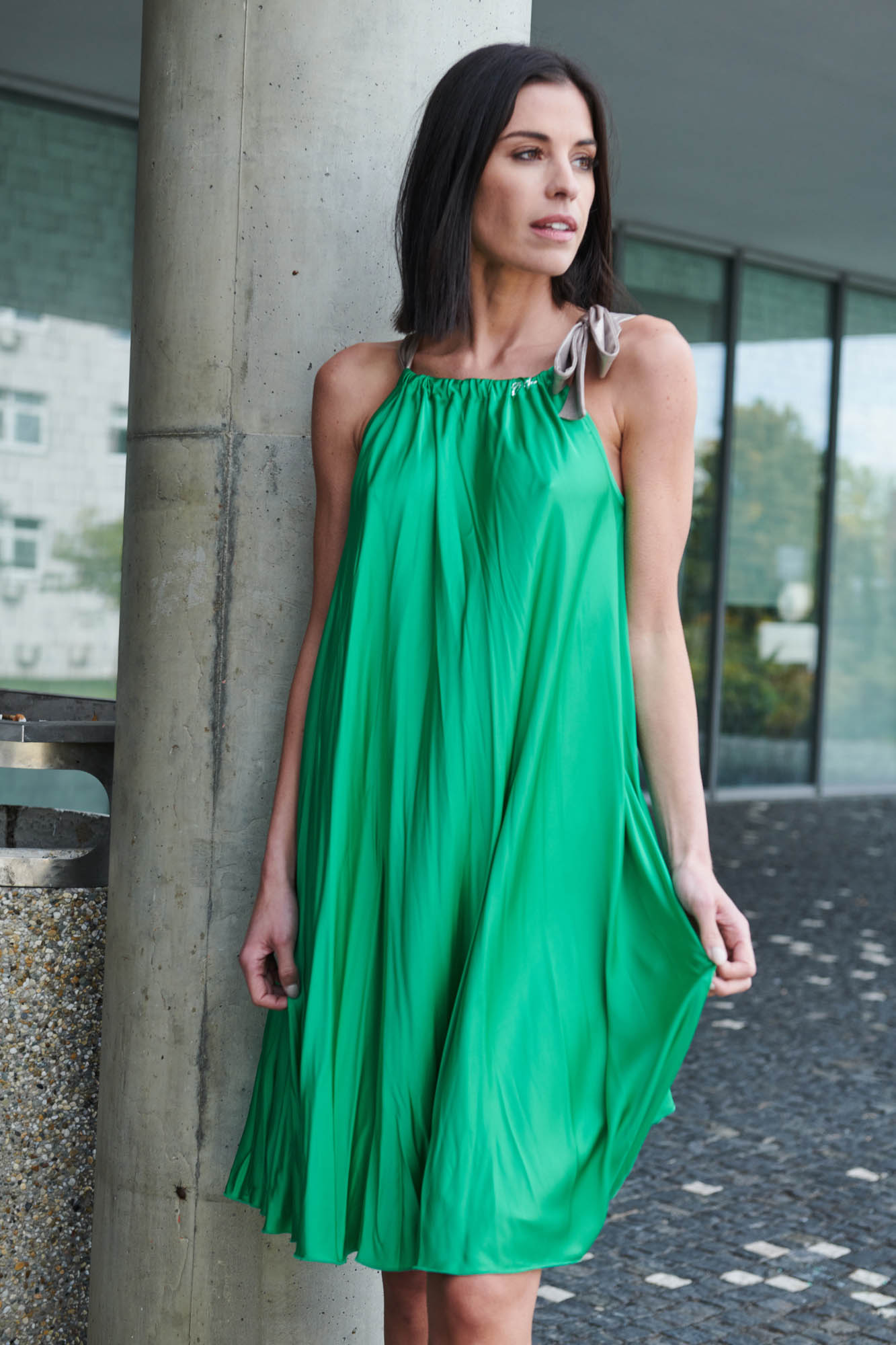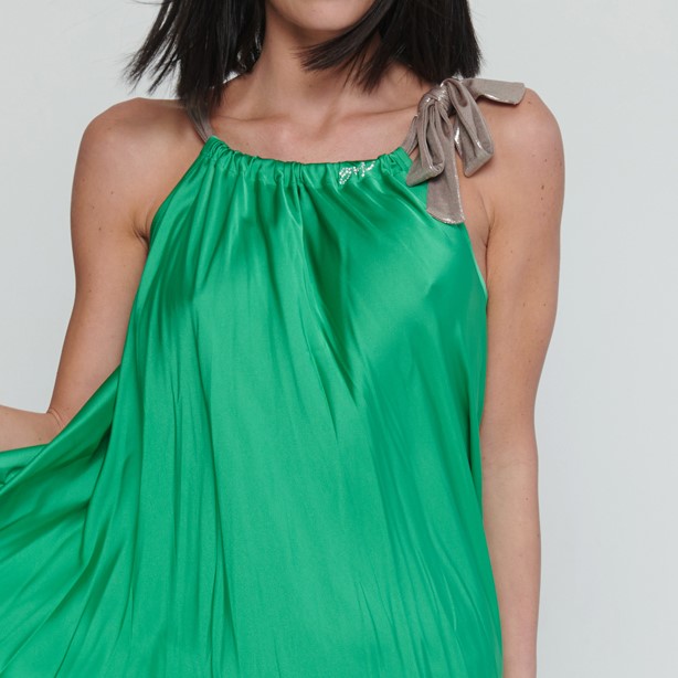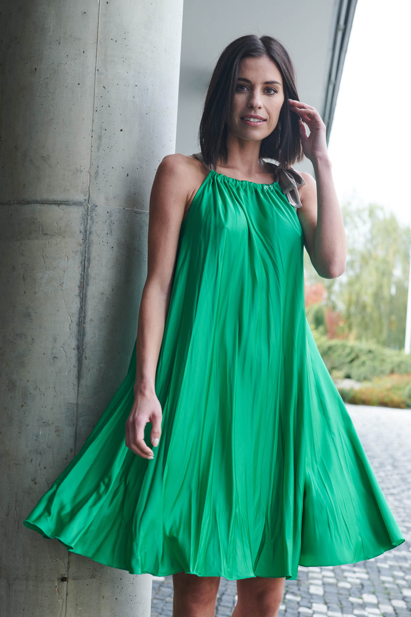 Šaty s americkými průramky. Efektní lesklá vázačka ve výstřihu s možností regulace. Malé crystalové logo INF ve výstřihu.