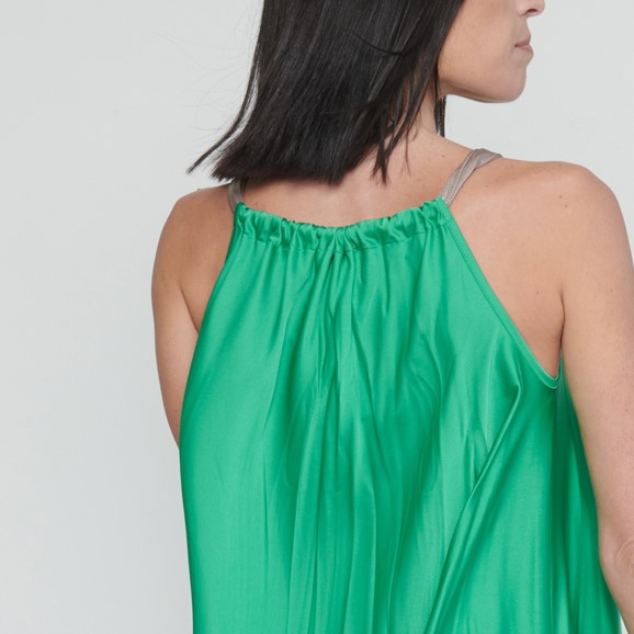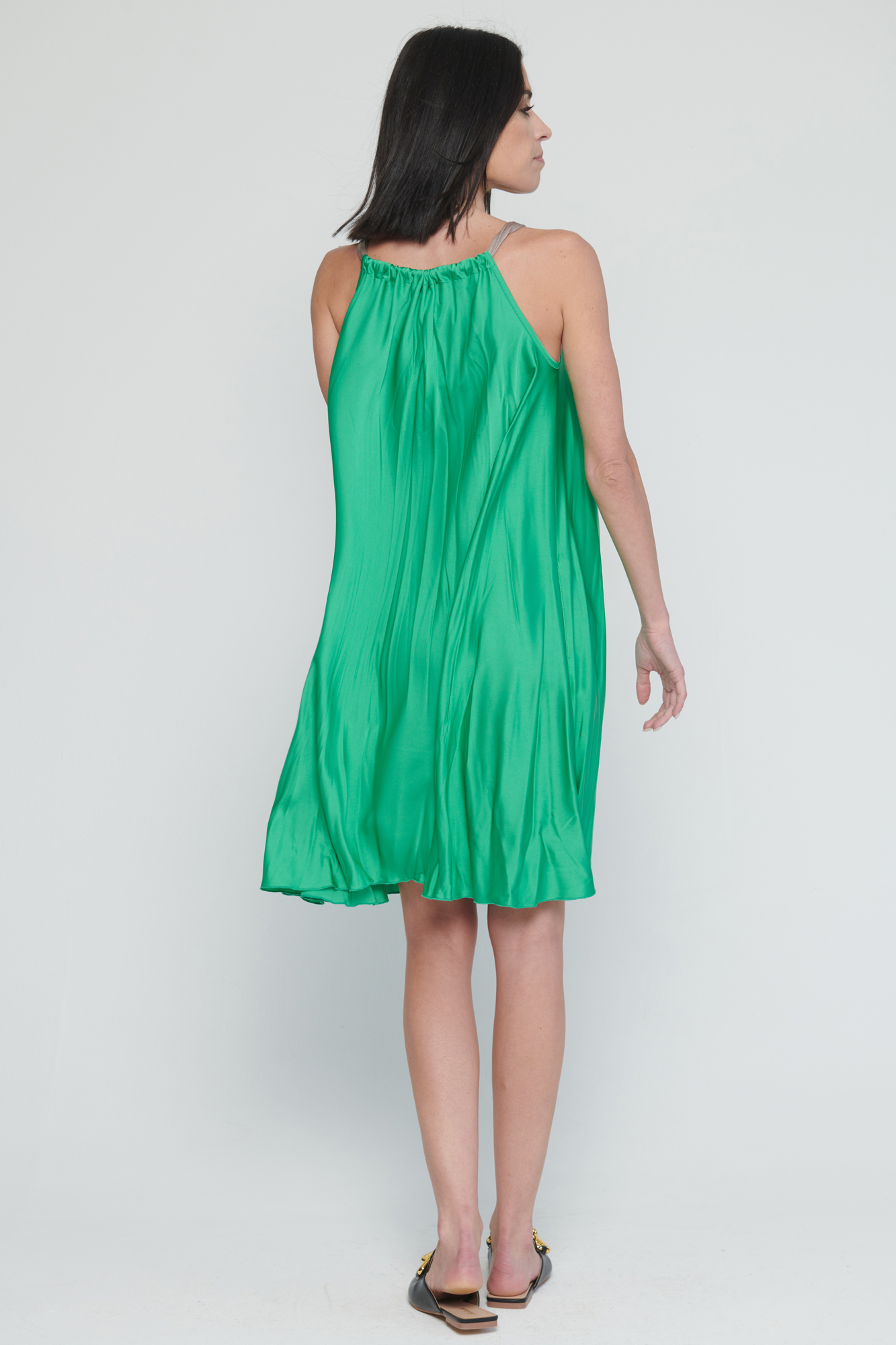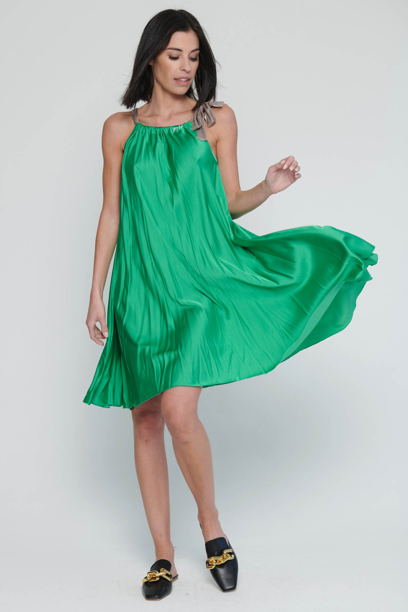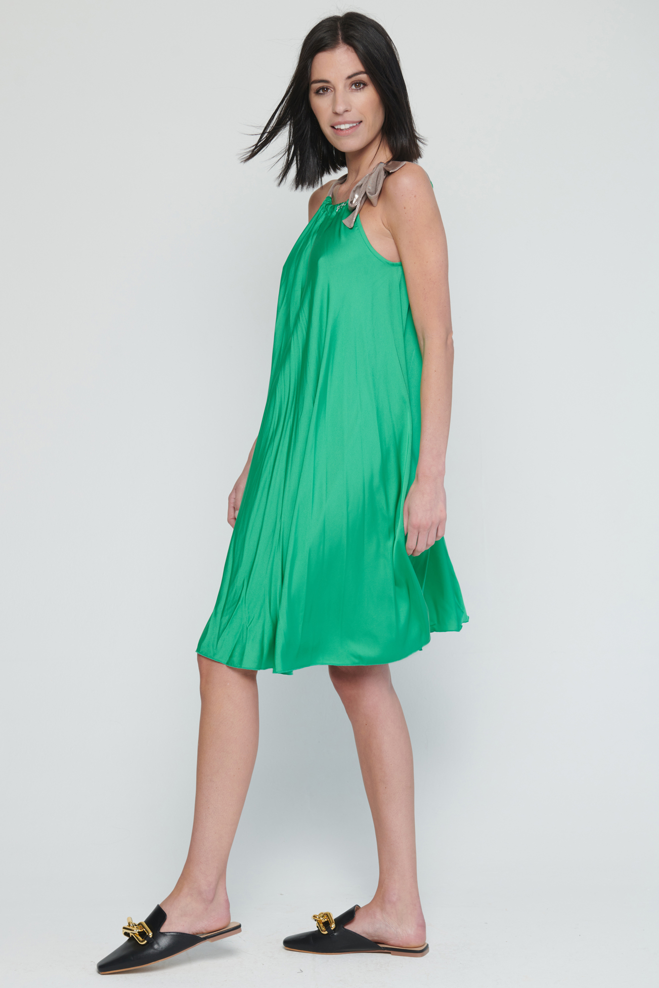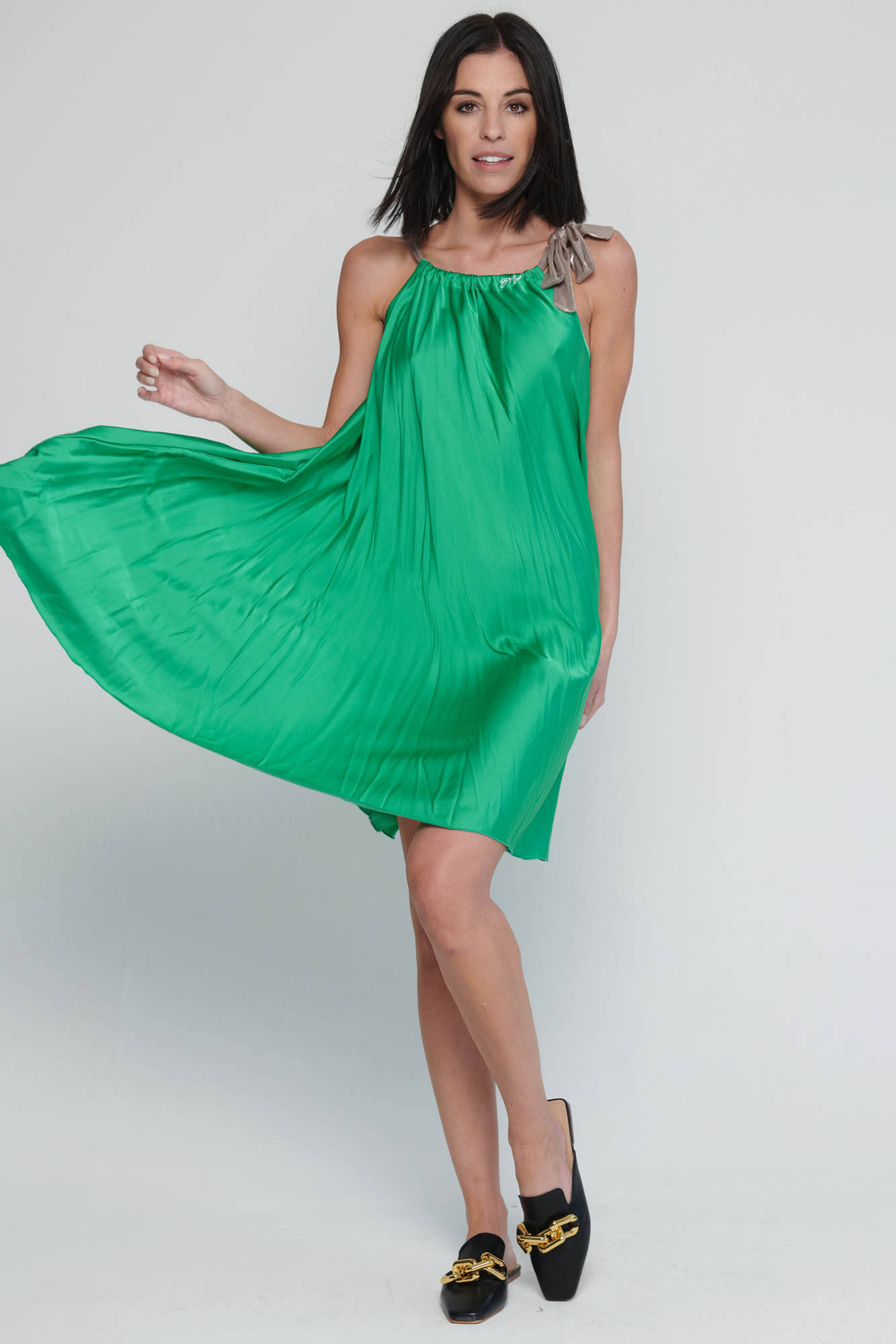 Šaty s americkými průramky. Efektní lesklá vázačka ve výstřihu s možností regulace. Malé crystalové logo INF ve výstřihu.