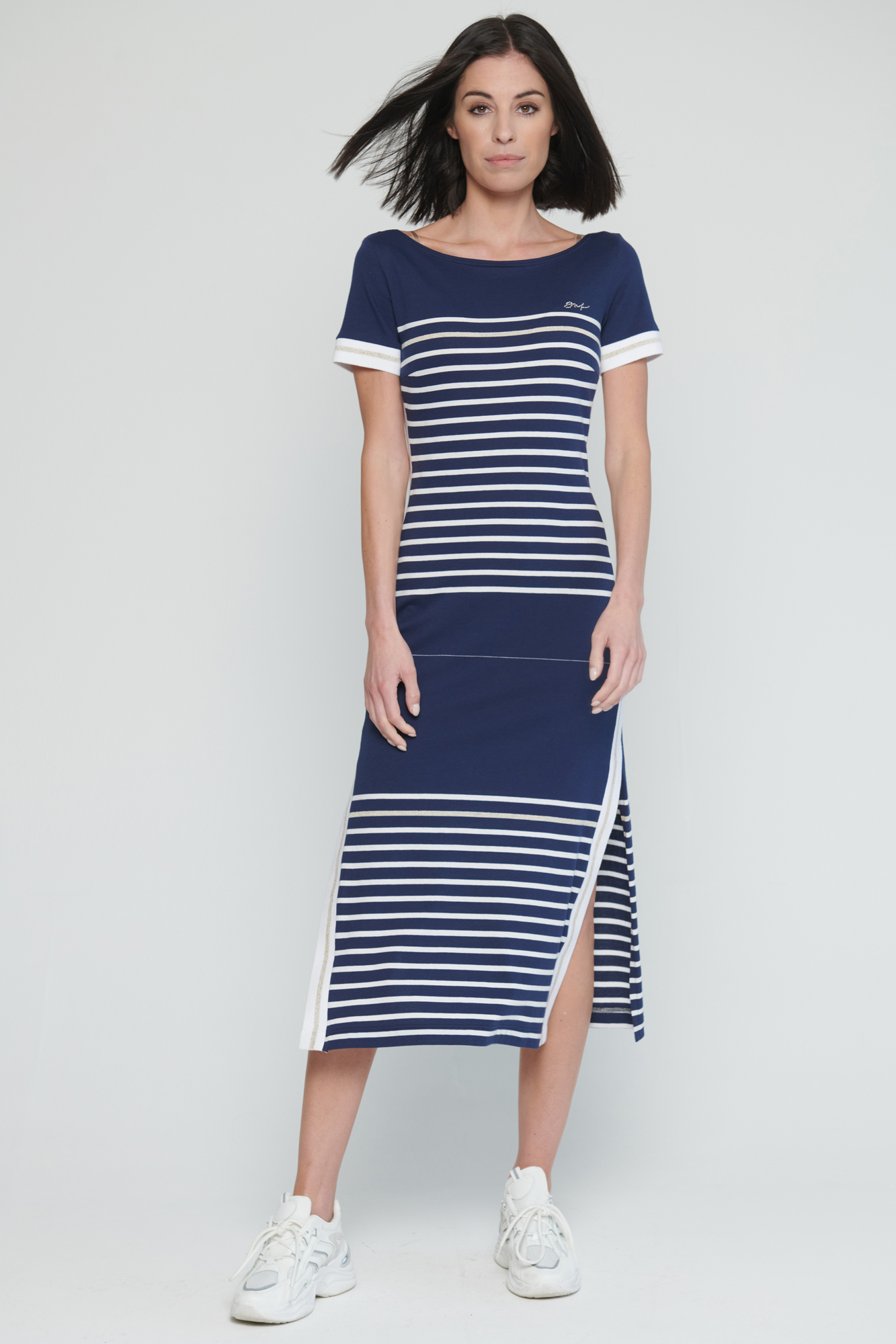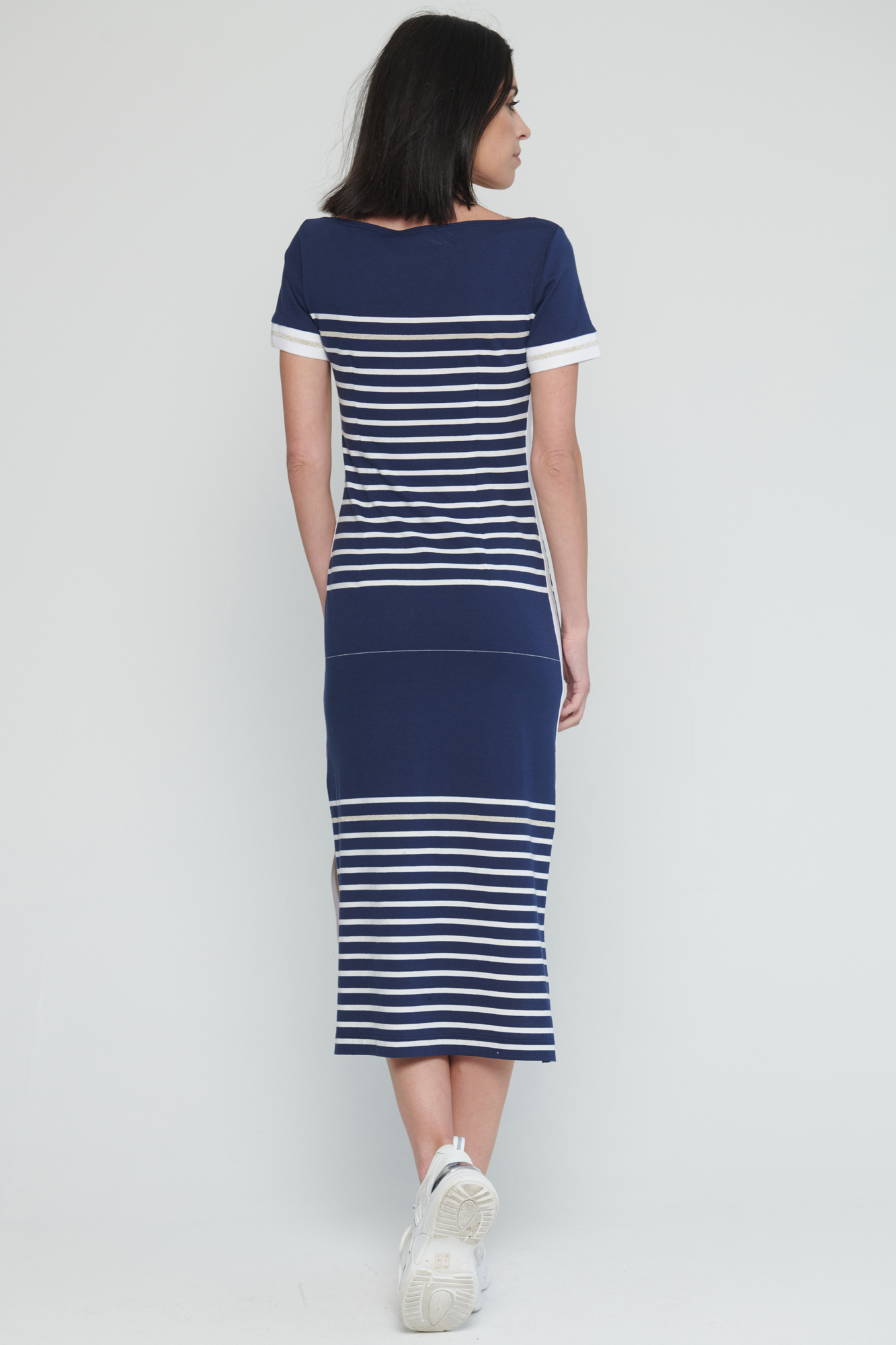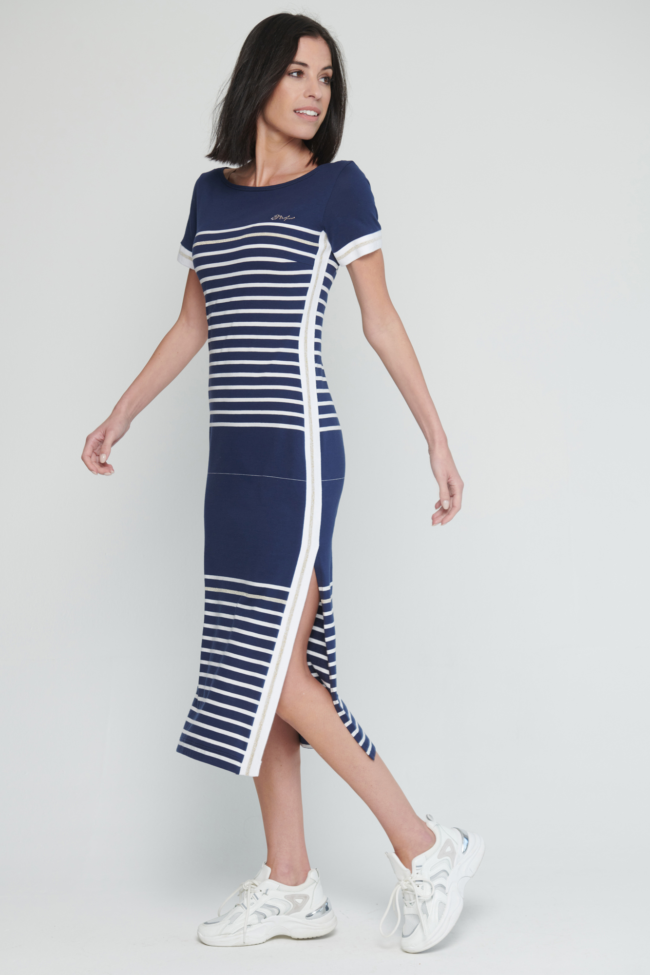 Bestseller INF. Šaty v délce do půlky lýtek. Efektní lampasy na bocích. Rozparky. Na předním díle malé krystalové logo INF.